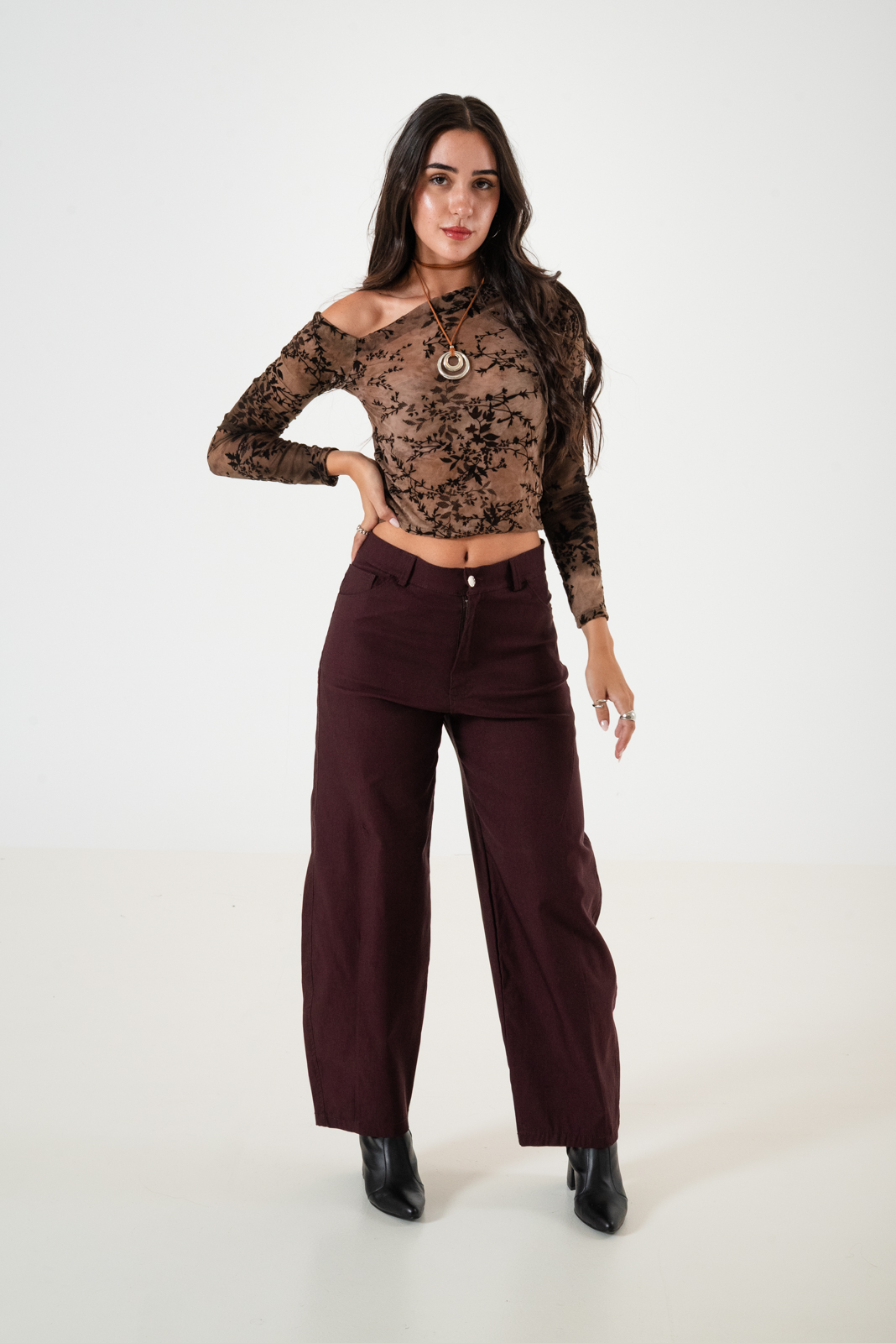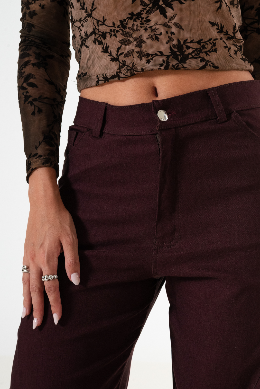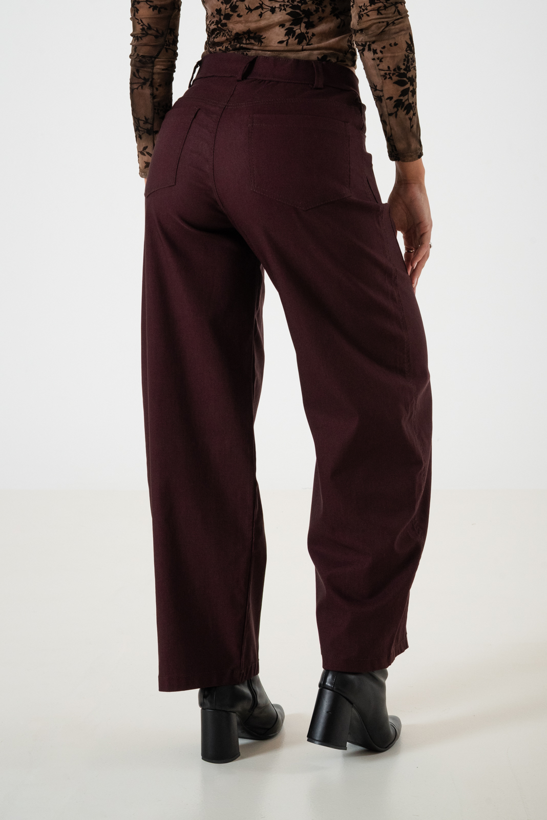 Pantalon estilo baloon confeccionado en tela de bengalina con detalle de bolsillos, pasacinto, cierre y boton
