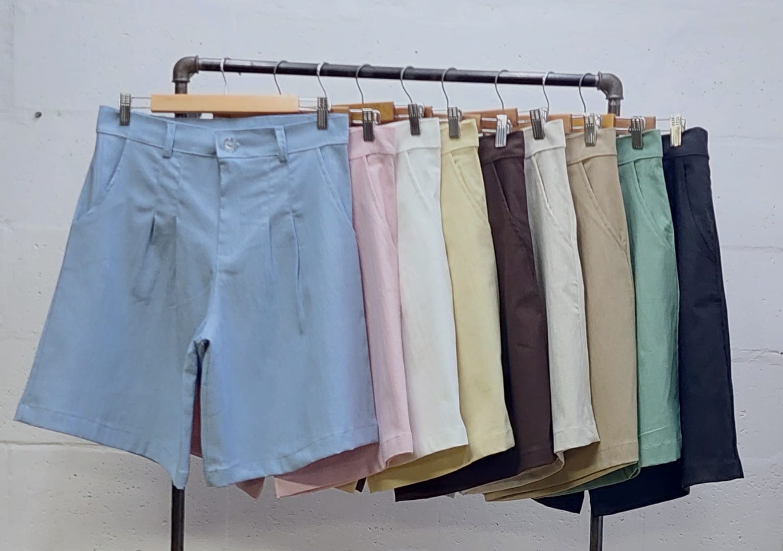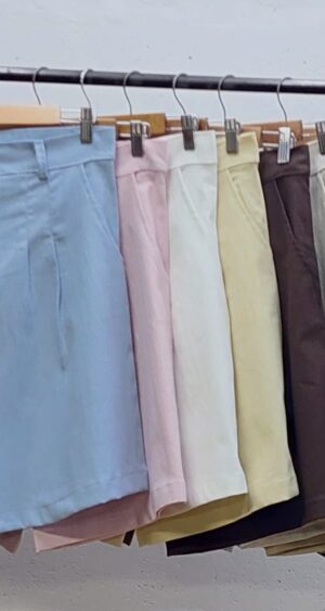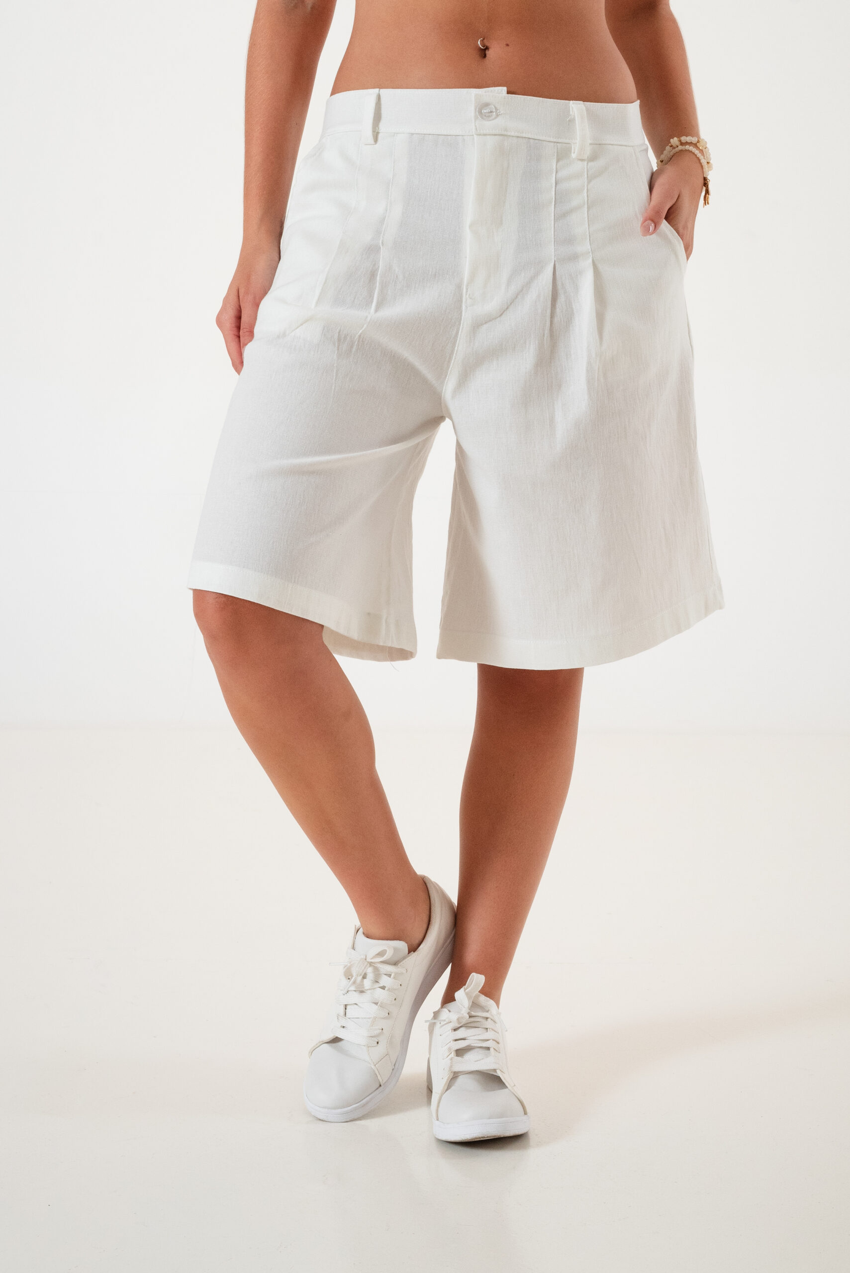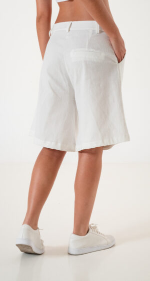 Bermuda confeccionada en tela de lino con detalle de doble pinzas delanteras, bolsillos, pasacinto, cierre y boton