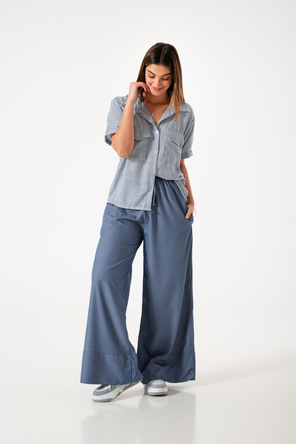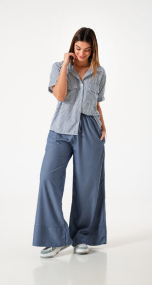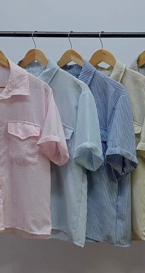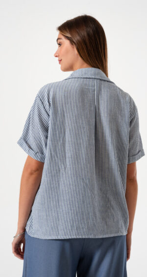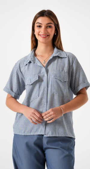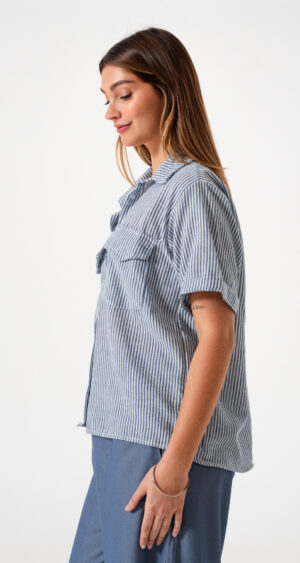 Camisa estilo corta confeccionado en tela de lino rayado con detalle de botones y bolsillos.
