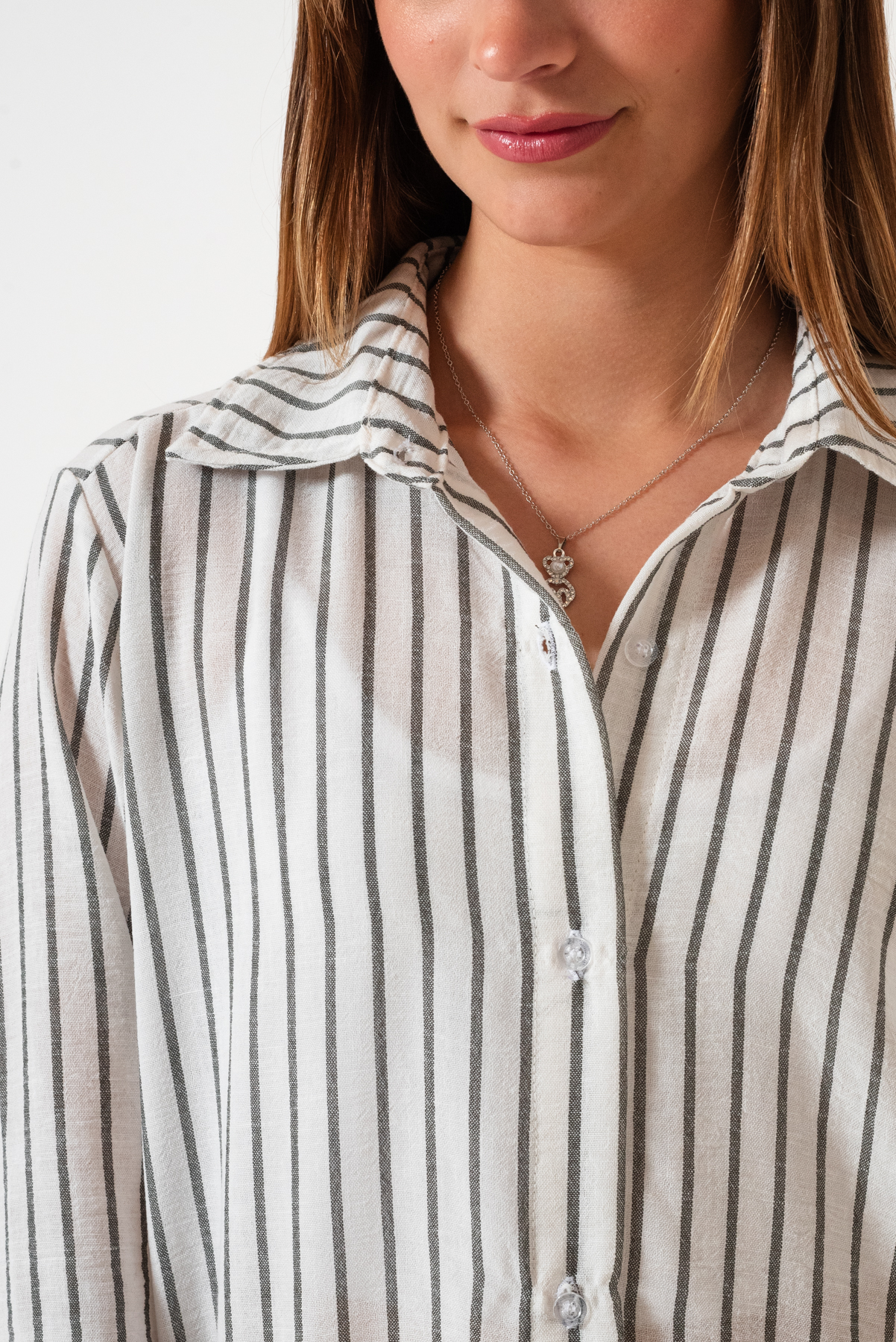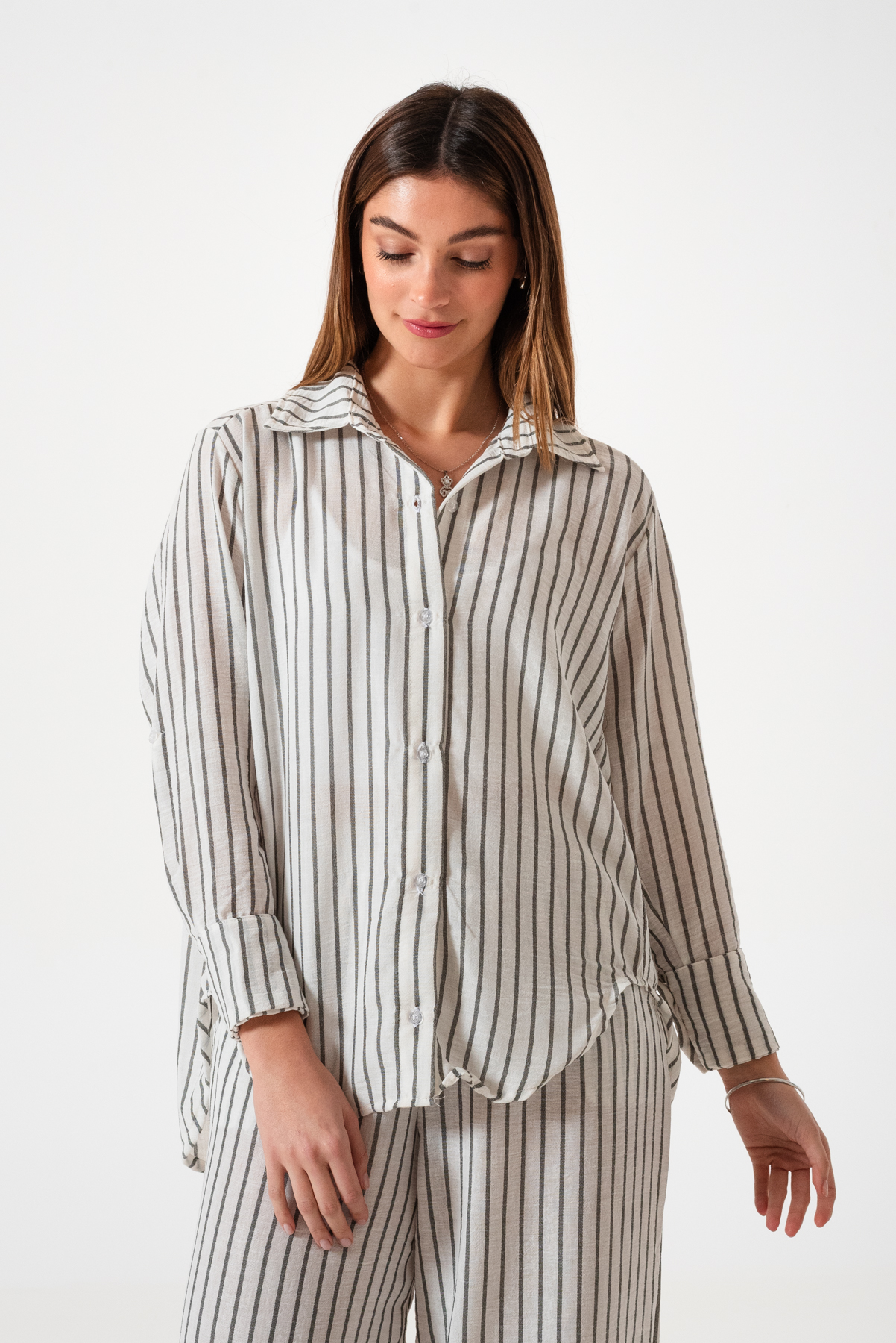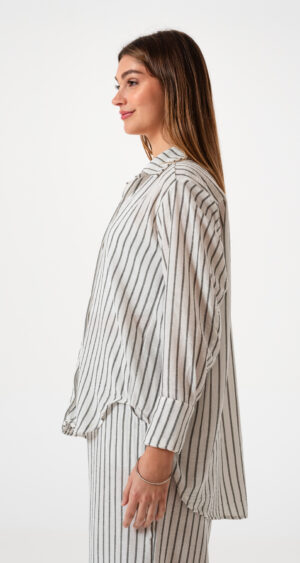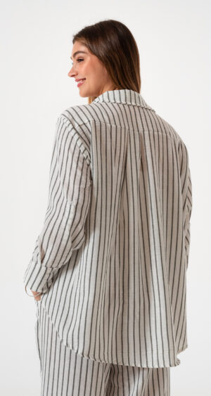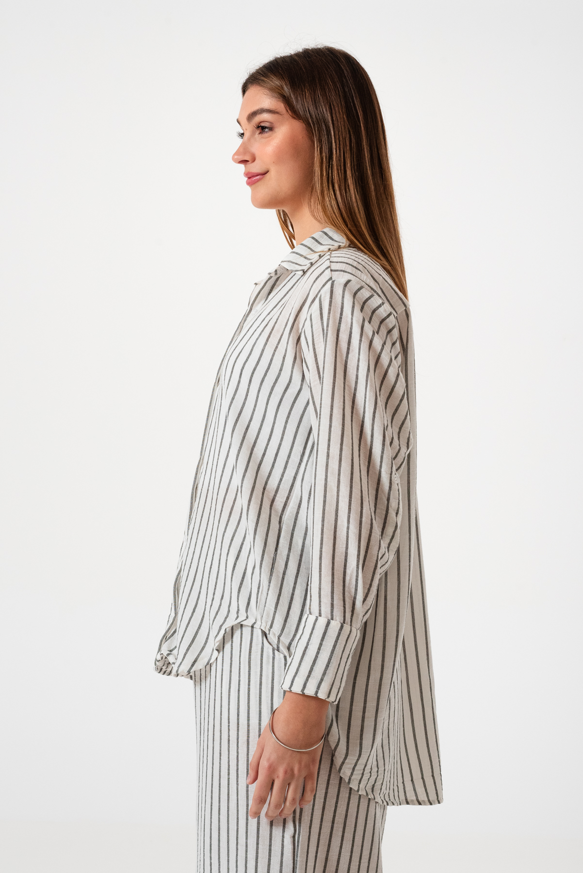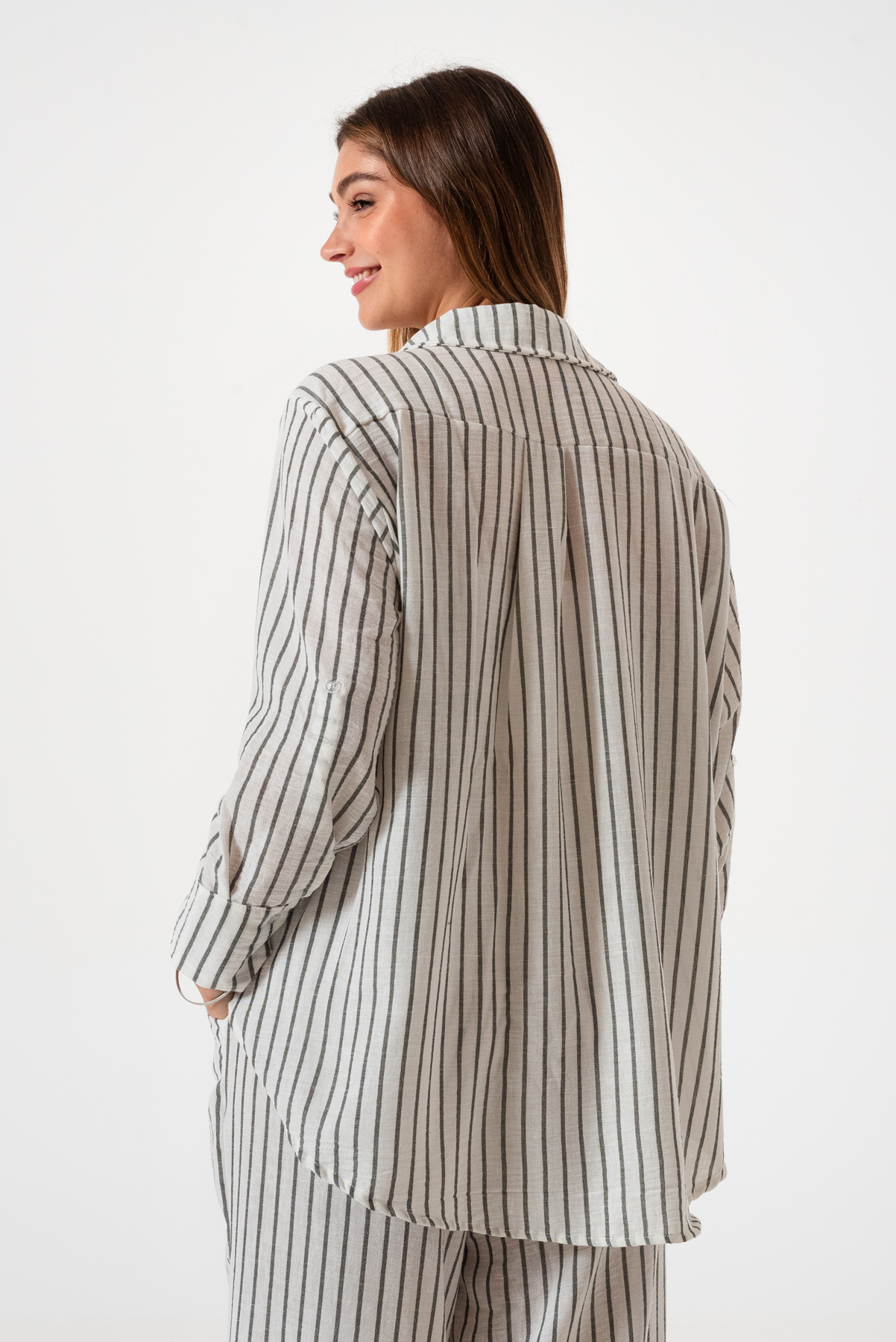 Camisa estilo over confeccionado en tela de lino rayado con detalle botones.