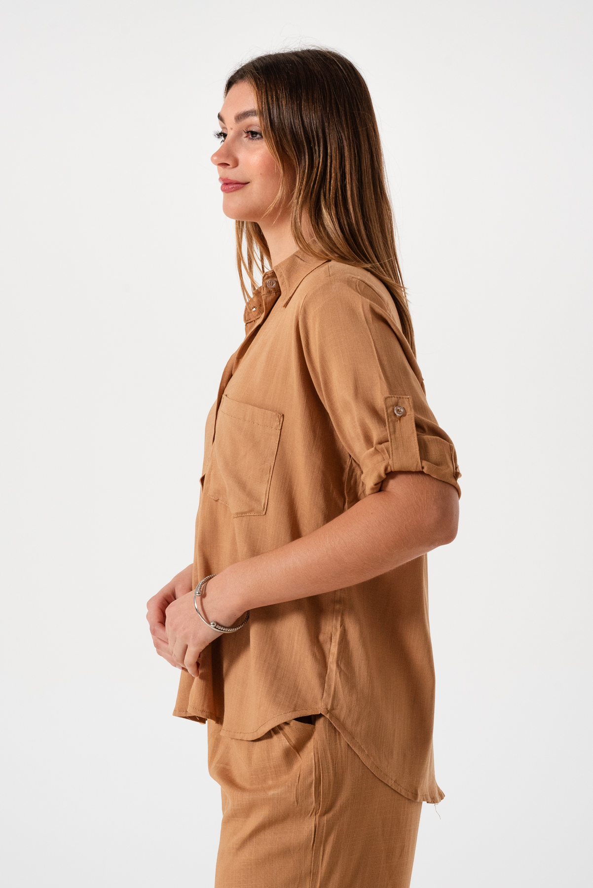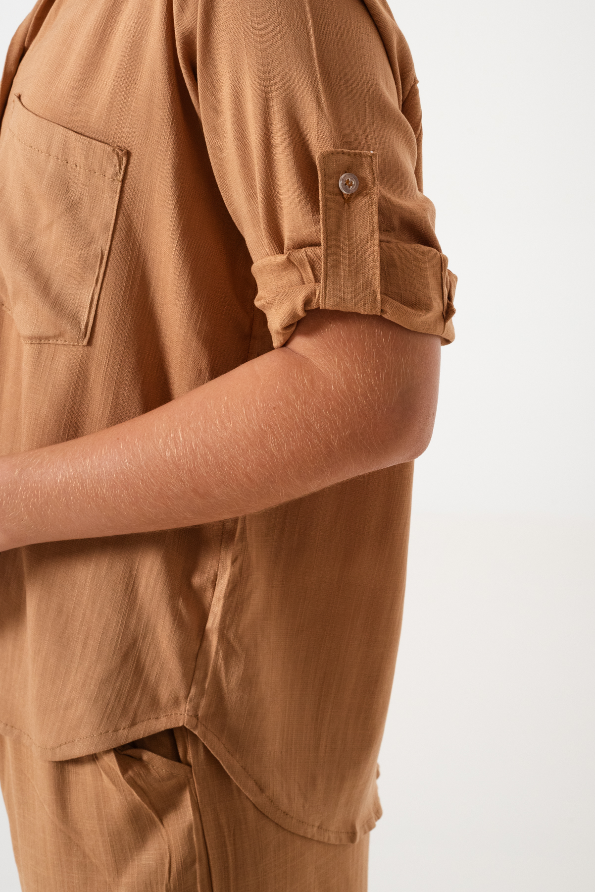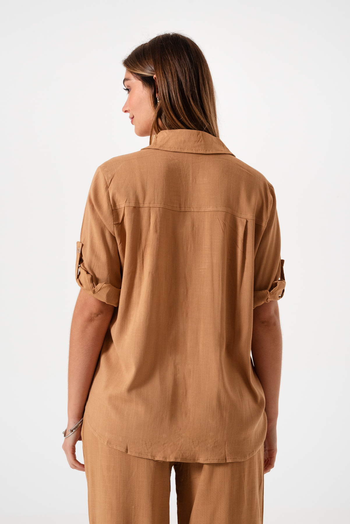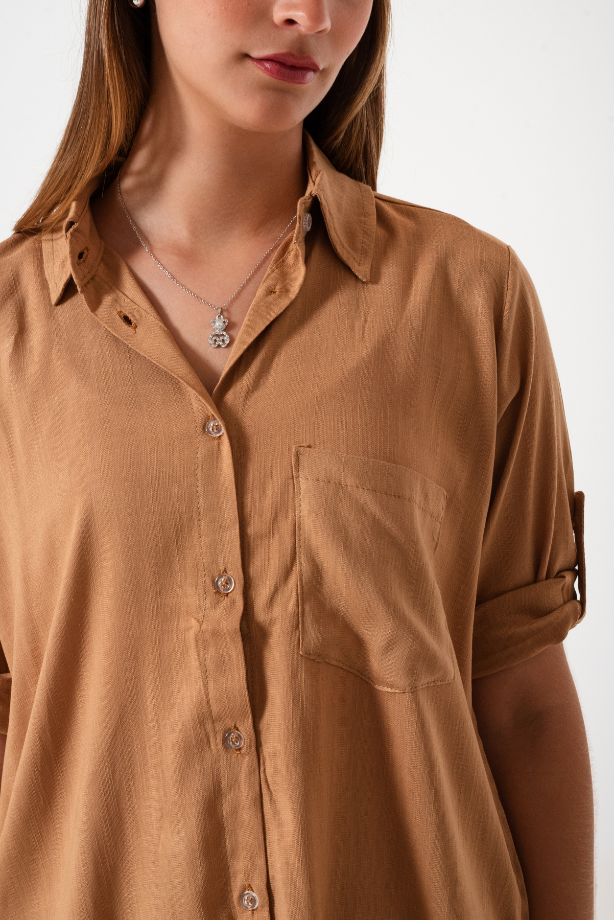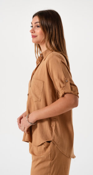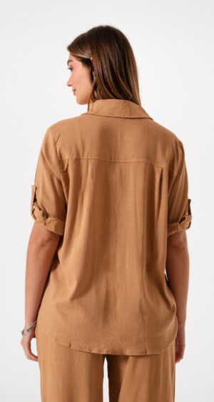 Camisa estilo over confeccionada en tela de lino spandex con detalle de bolsillo delantero y botones.