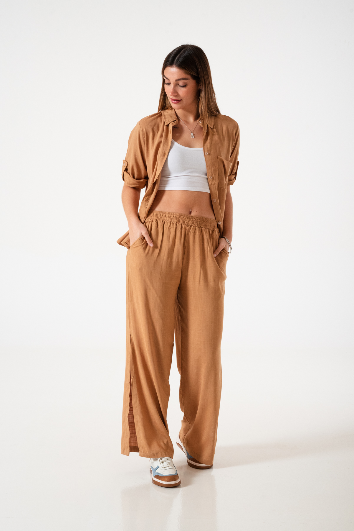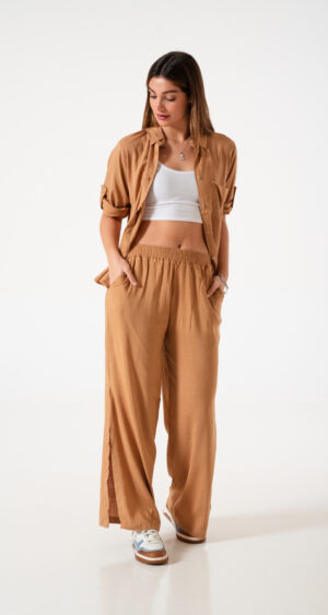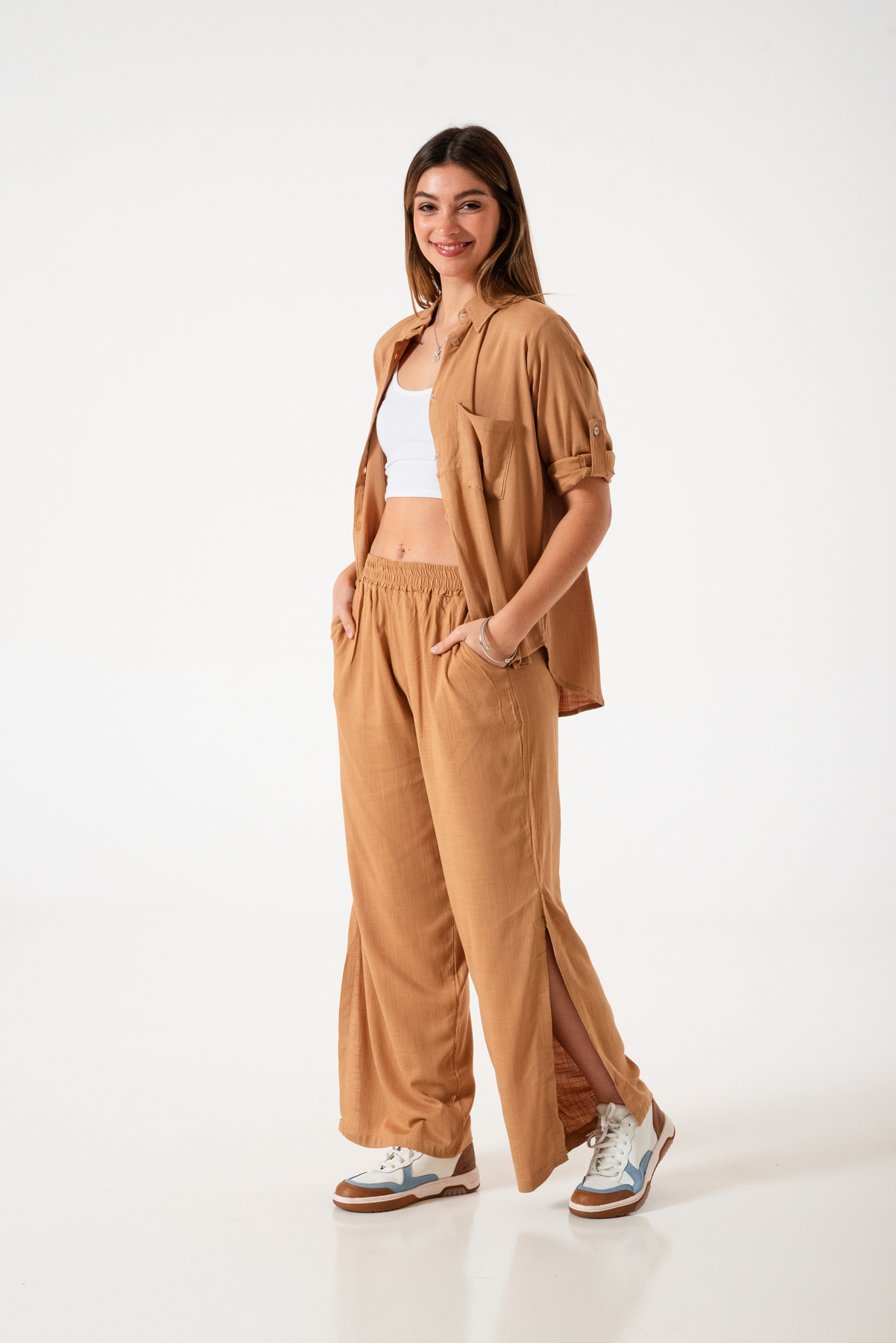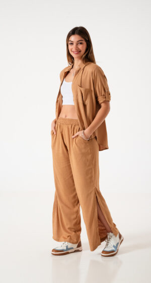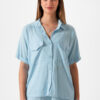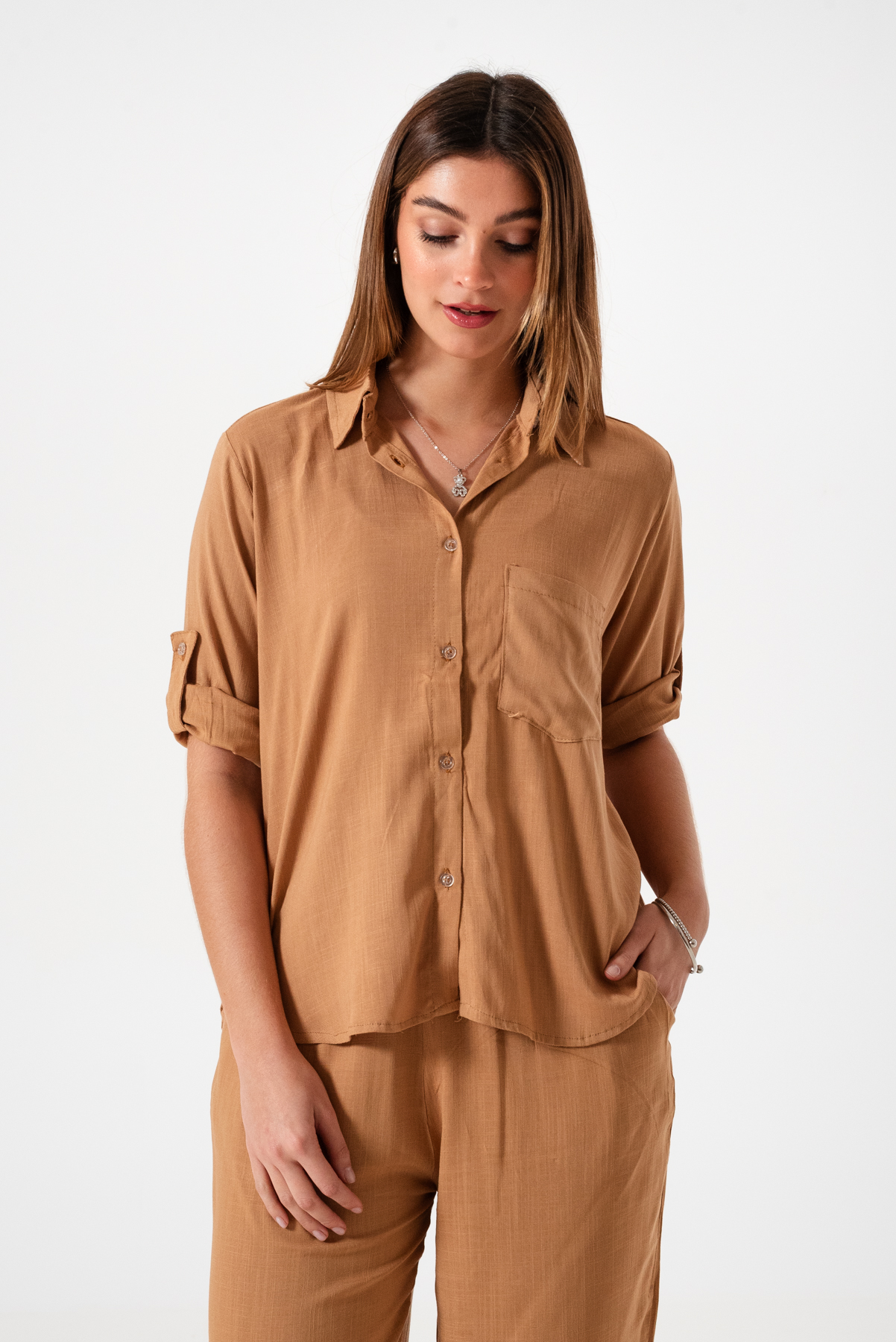Camisa estilo over confeccionada en tela de lino spandex con detalle de bolsillo delantero y botones.