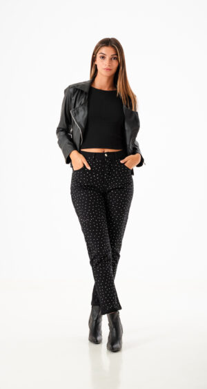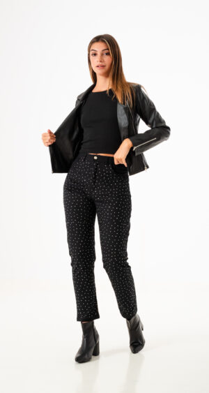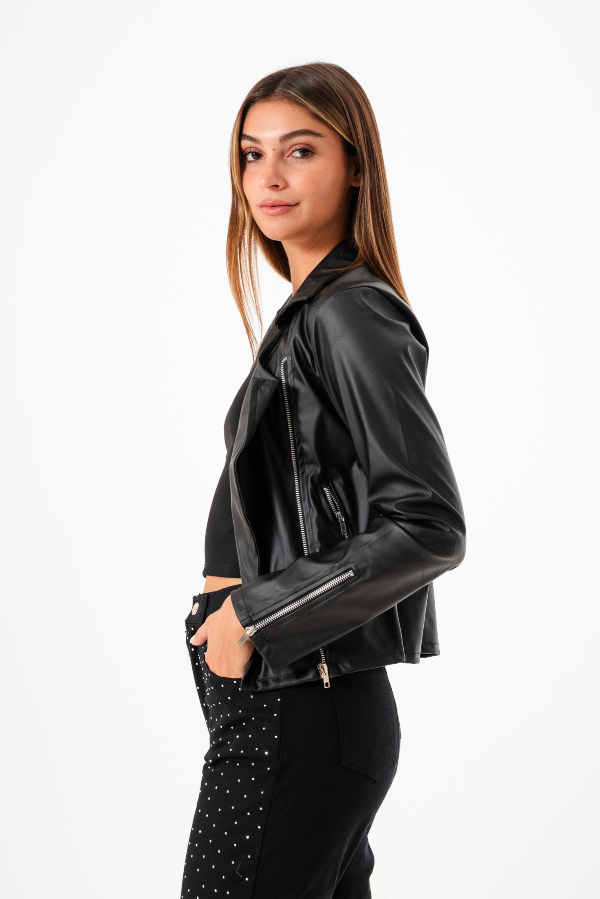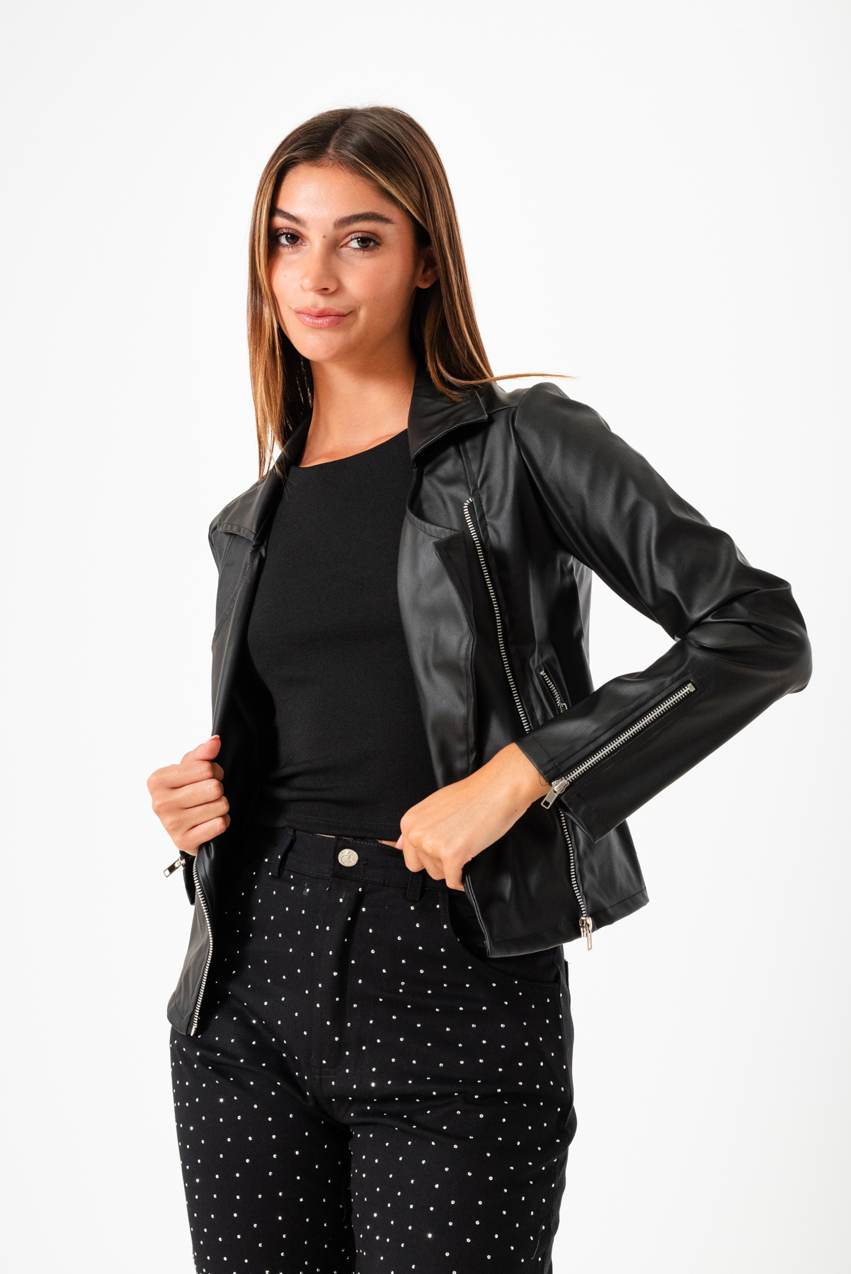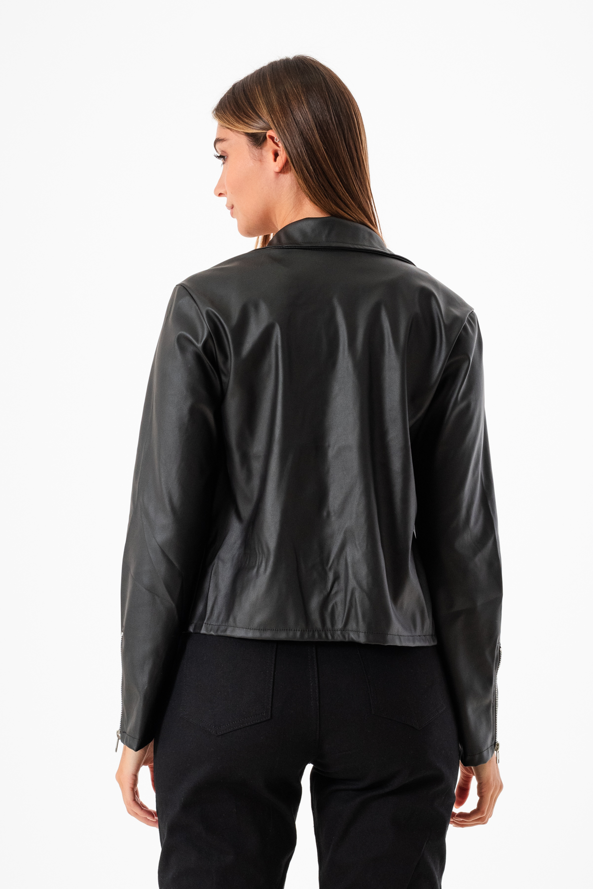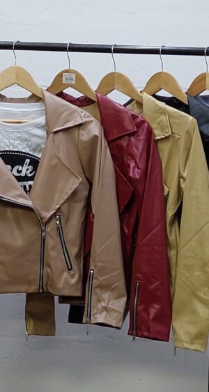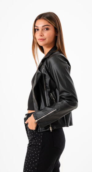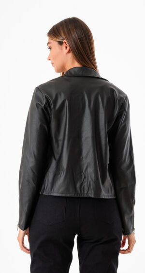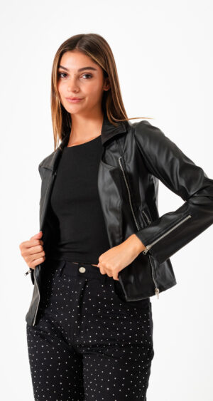 Campera confeccionada en tela de ecocuero con detalle de 4 cierre y bolsillos.