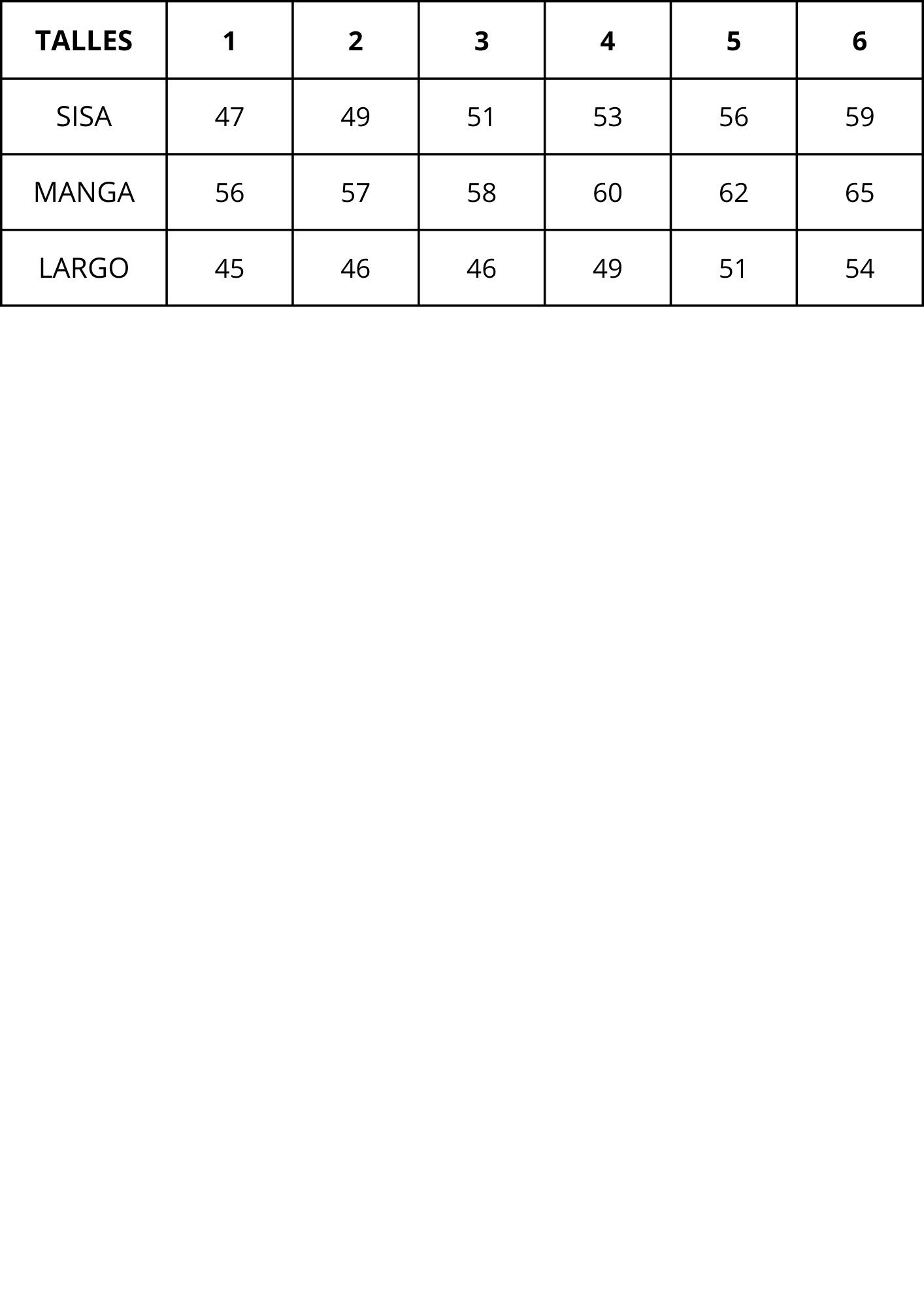 | Talles | 1, 2, 3, 4, 5, 6 |