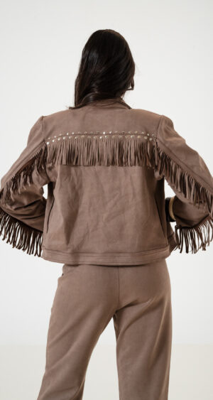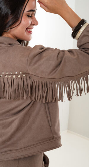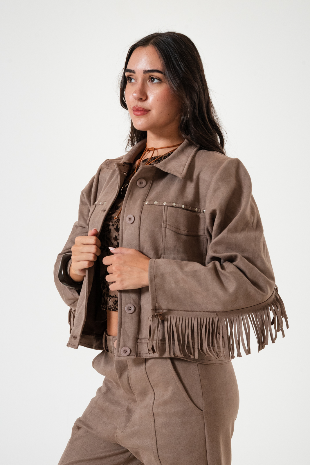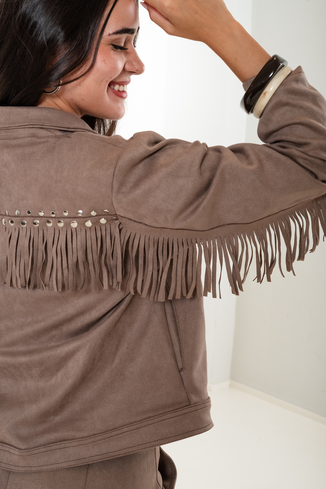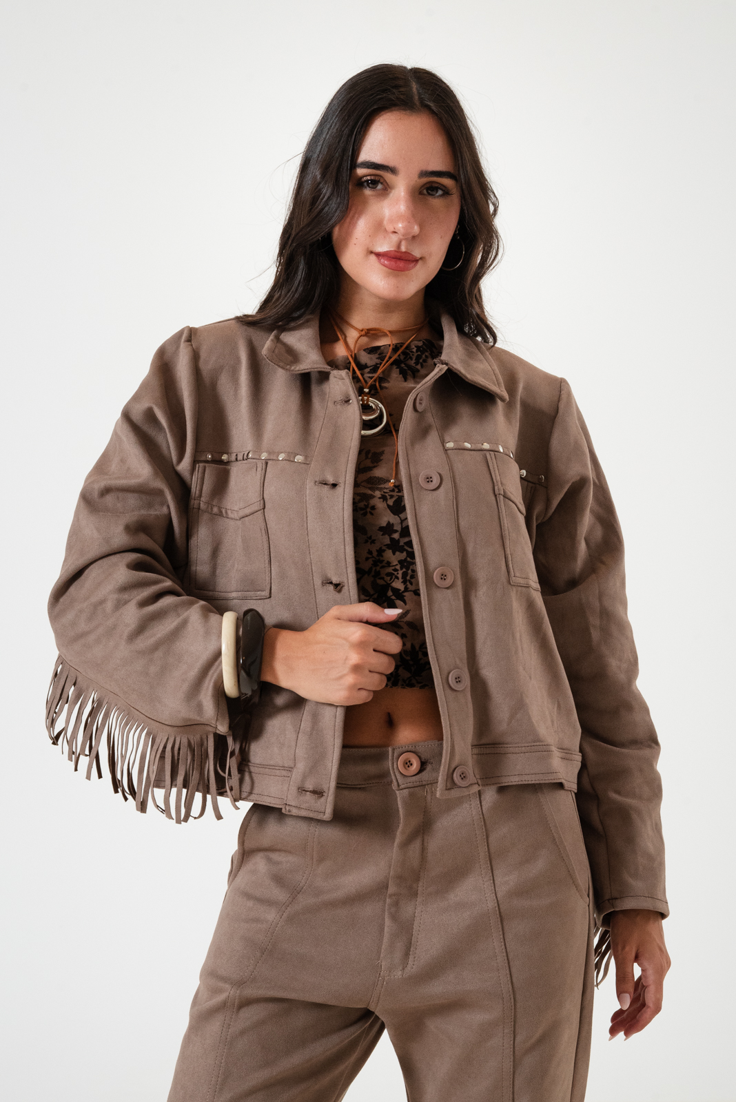 Casaca confeccioanda en tela de sued con detalle de flecos, tachas, bolsillos y botones