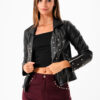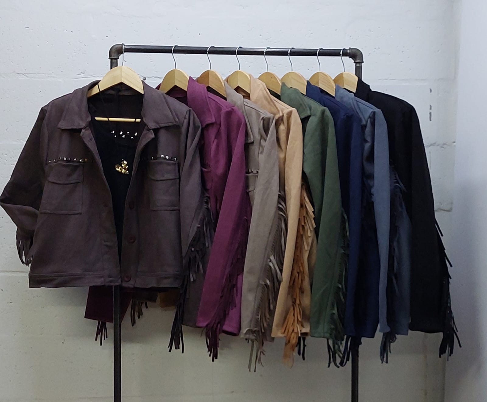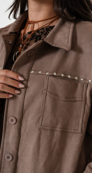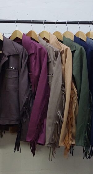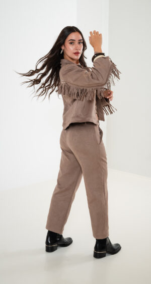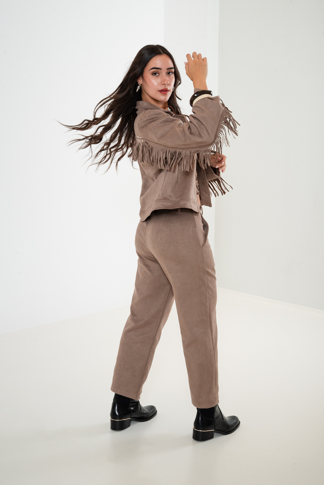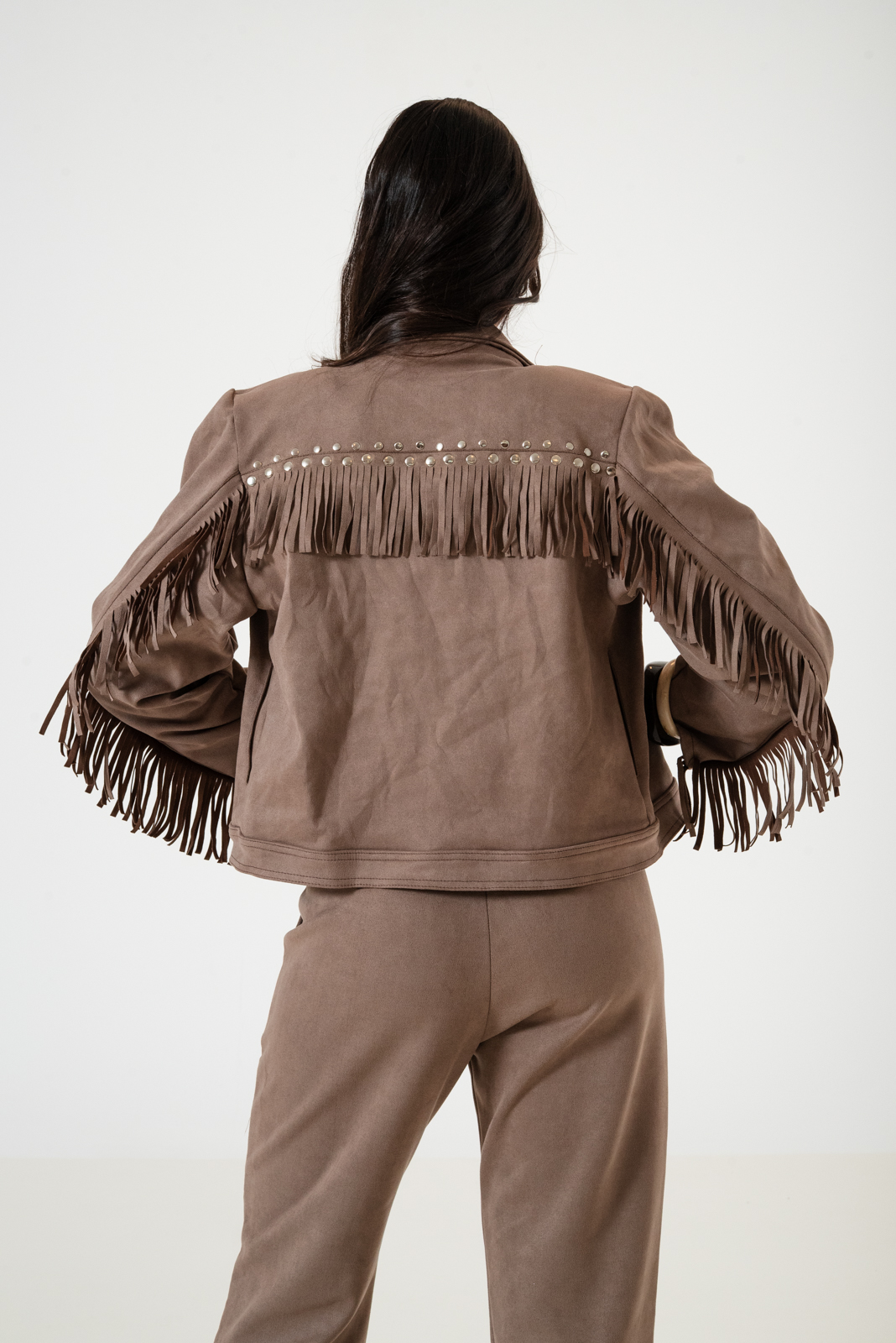 Casaca confeccioanda en tela de sued con detalle de flecos, tachas, bolsillos y botones