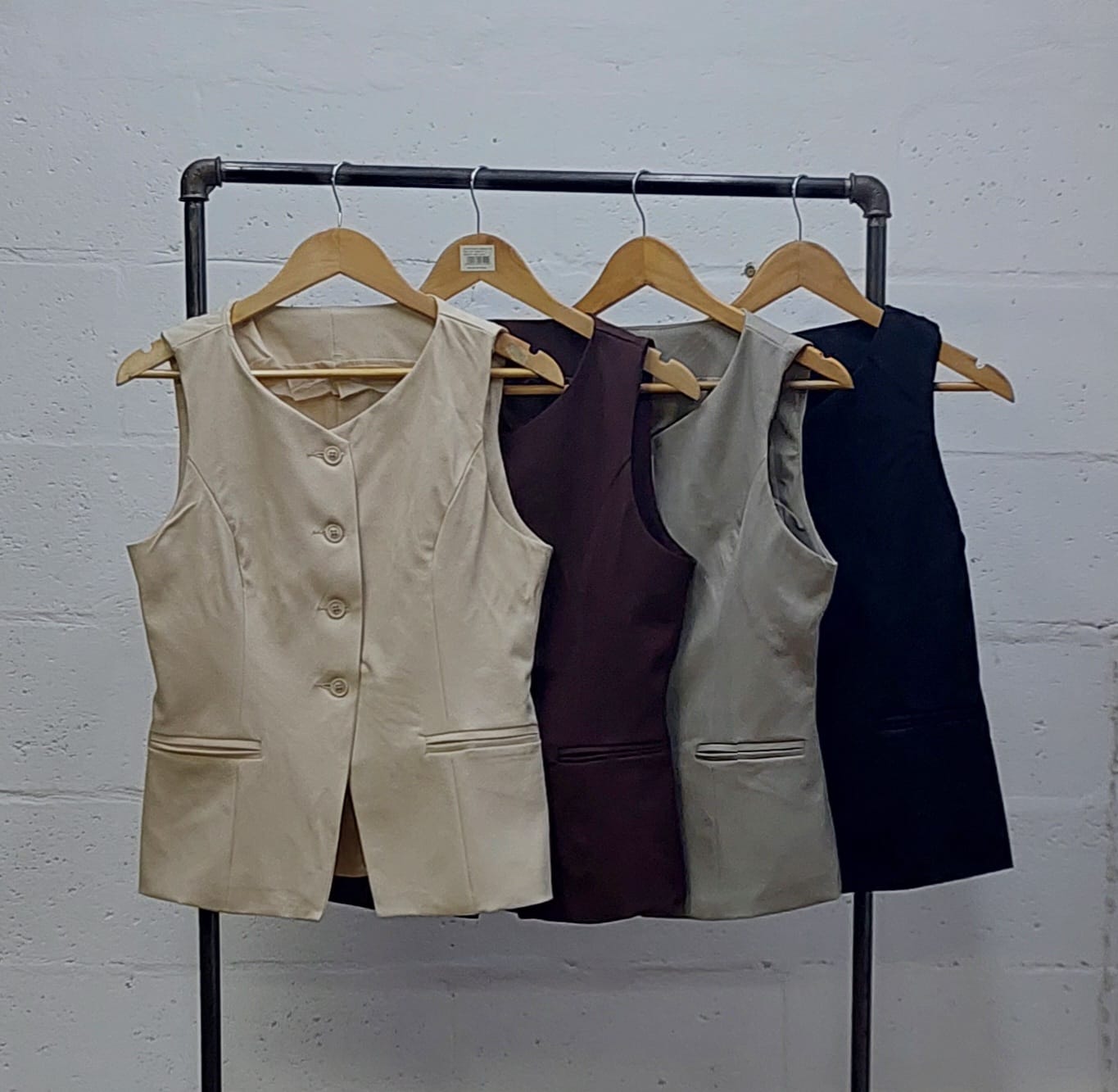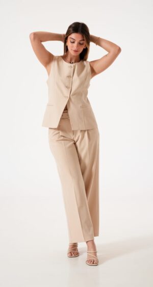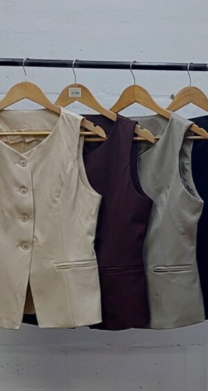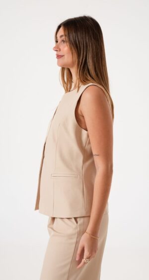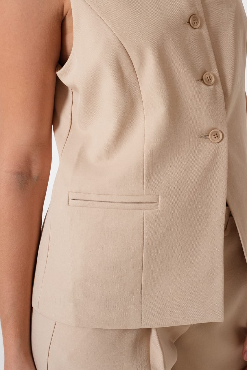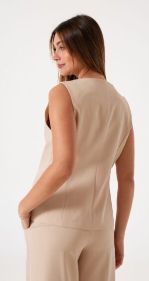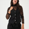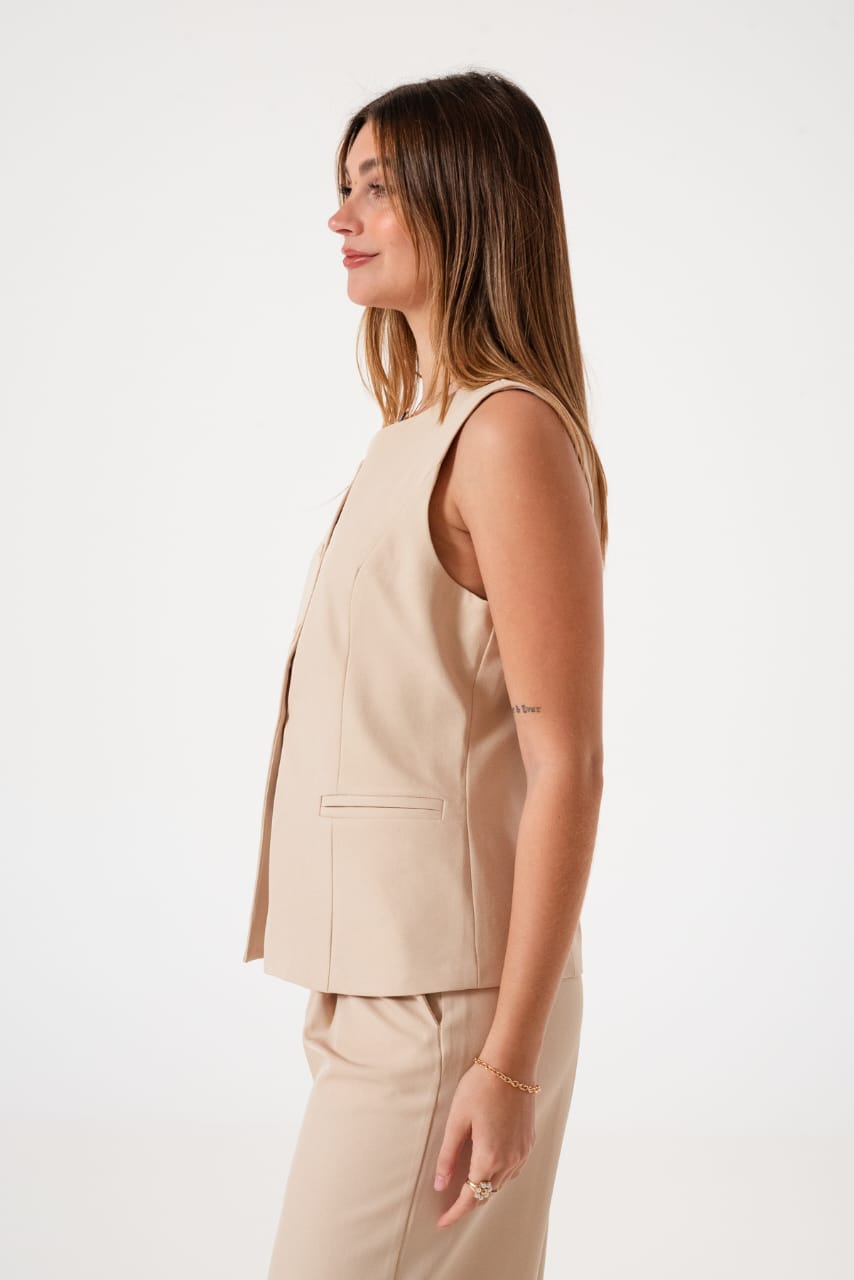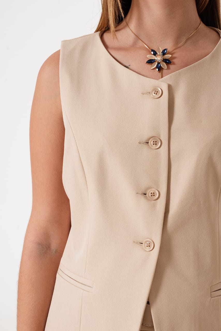 Chaleco estilo largo confeccionado en tela de sasteria con detalle de botones