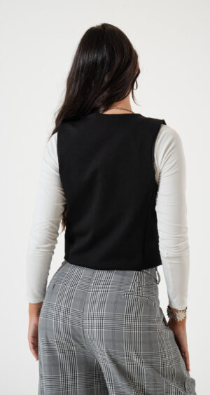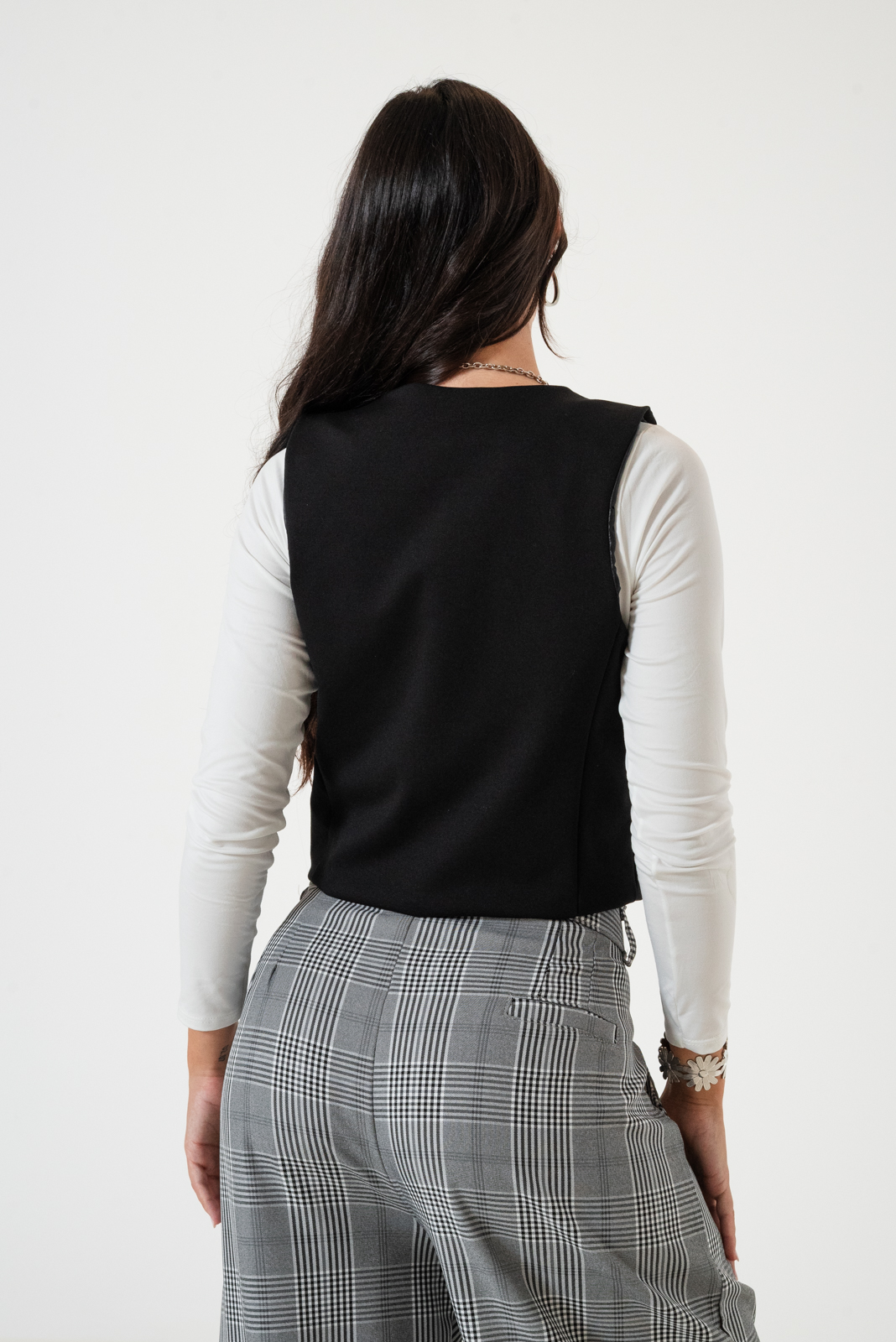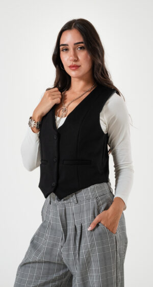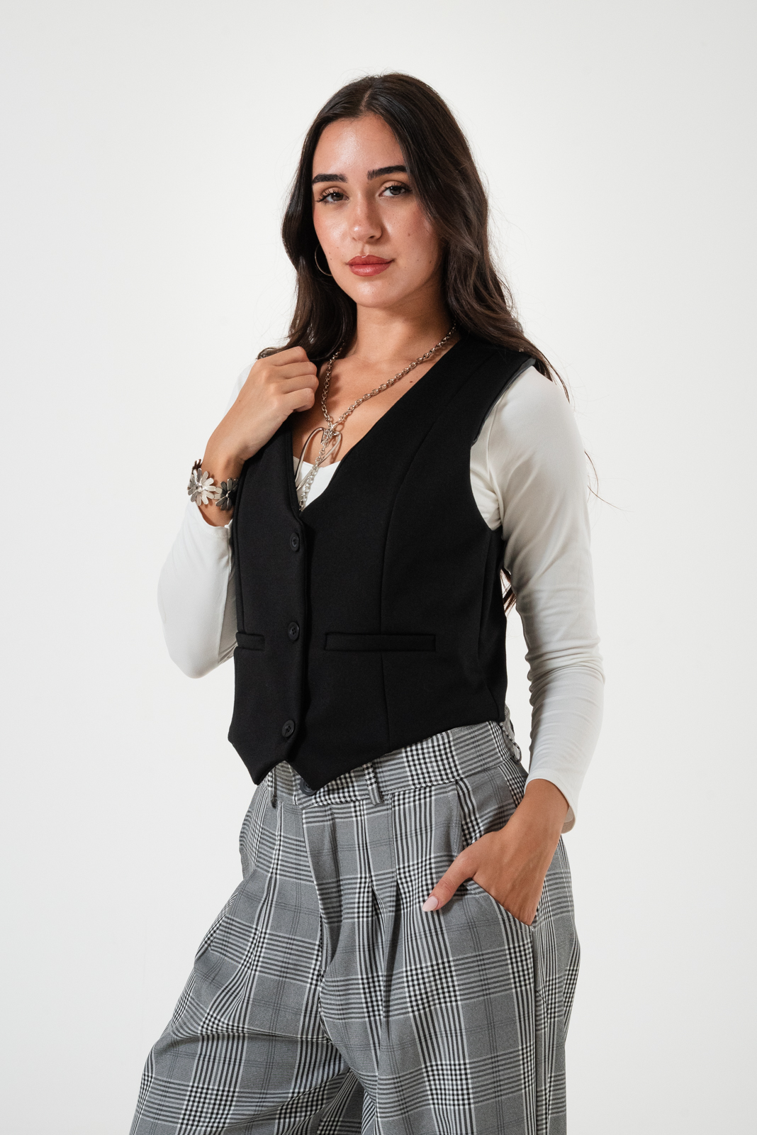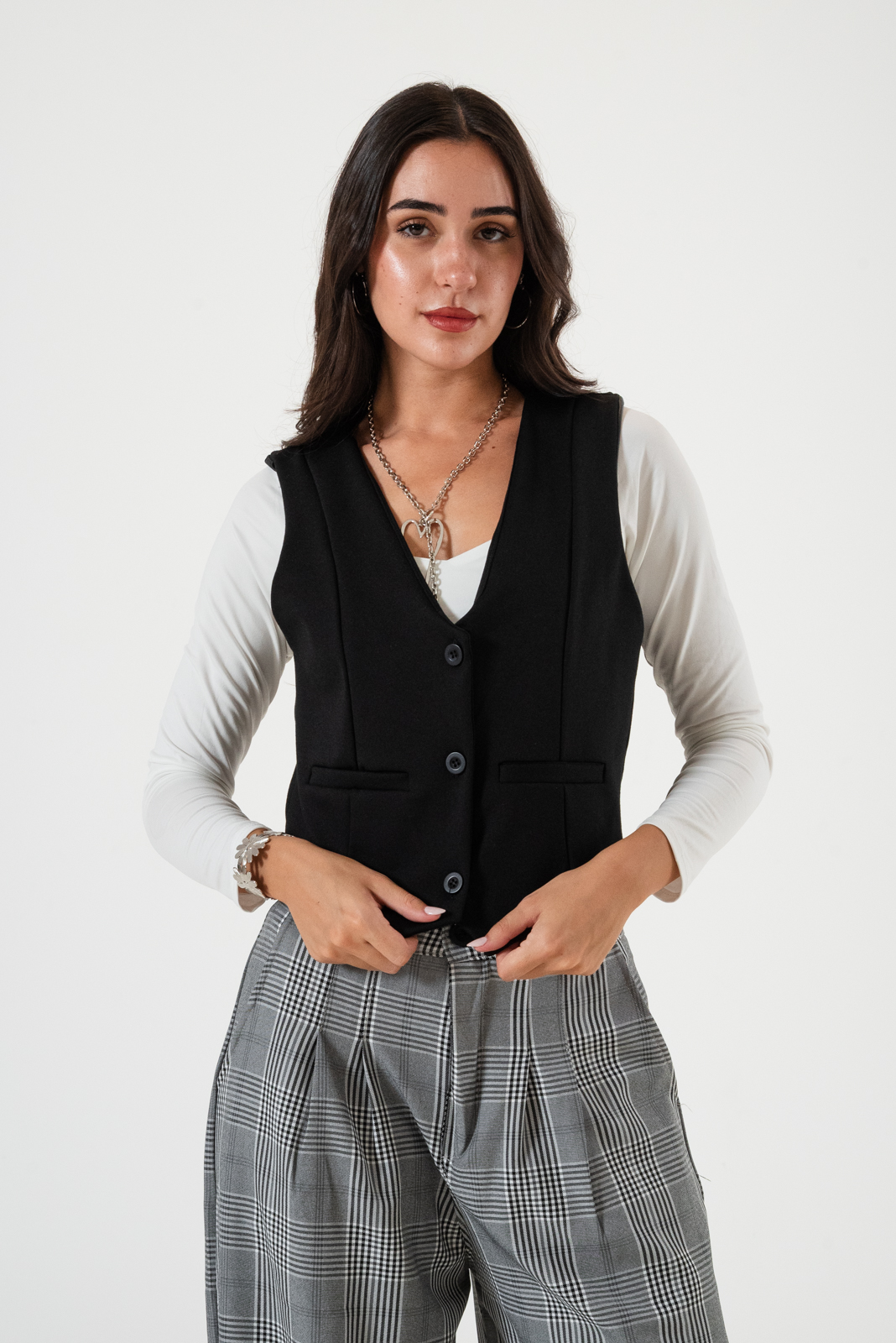 Chaleco confeccionado en tela de punto roma forrado en su interior y detalle de botones