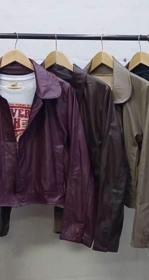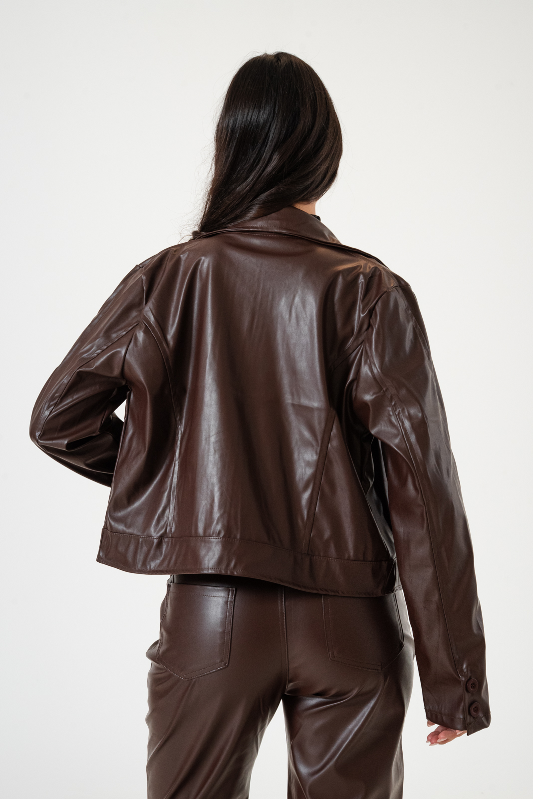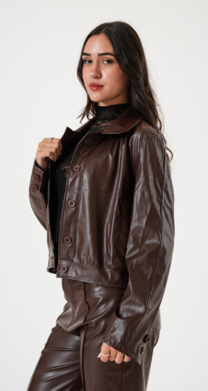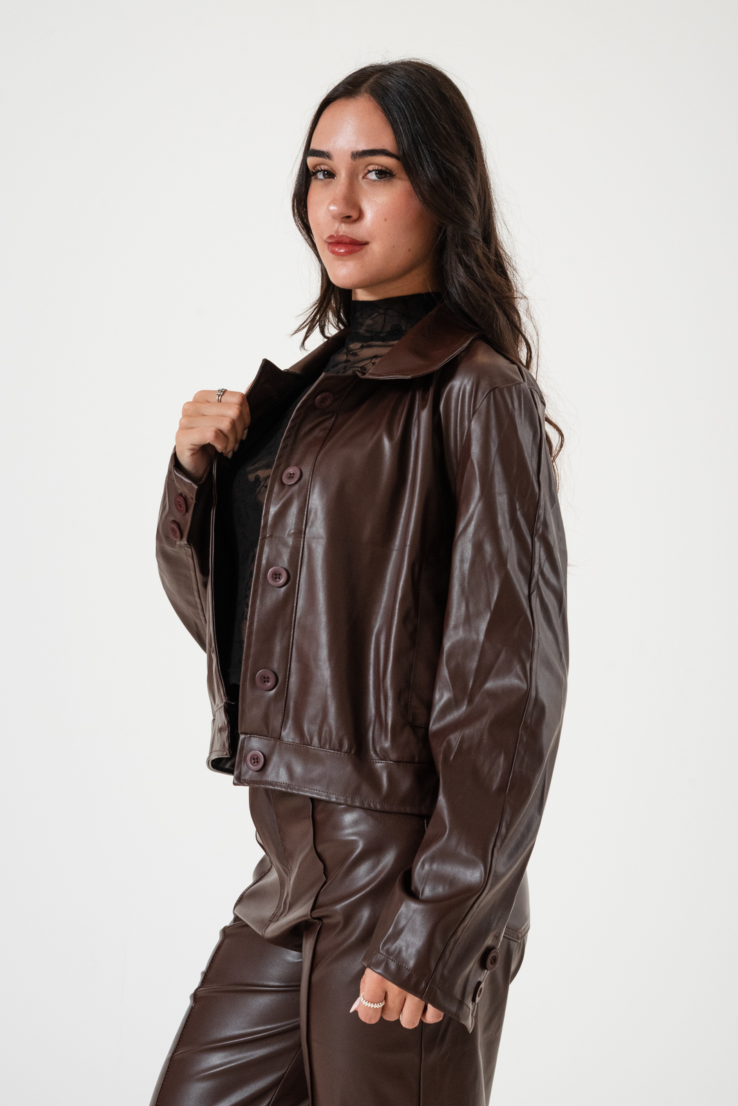 Campera estilo chaqueta confeccionada en tela de ecocuero con detalle de botones y bolsillos.