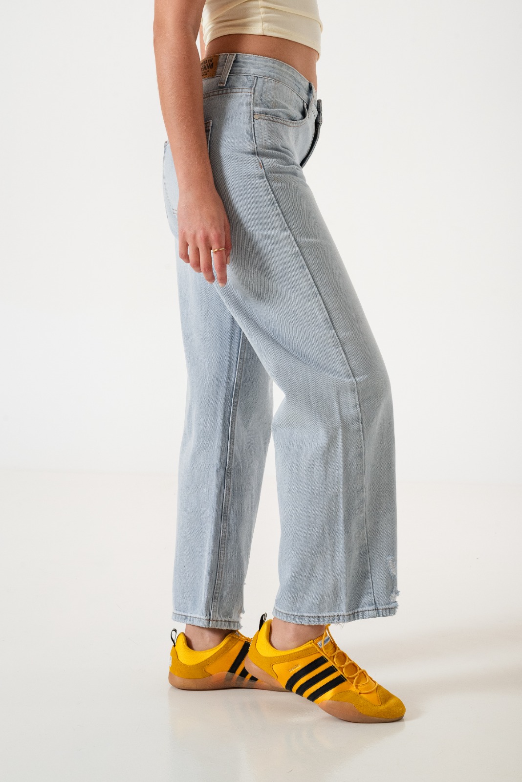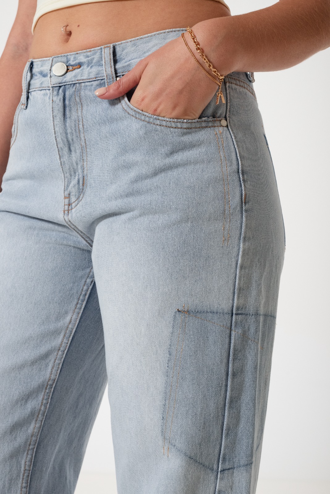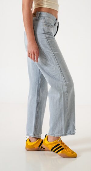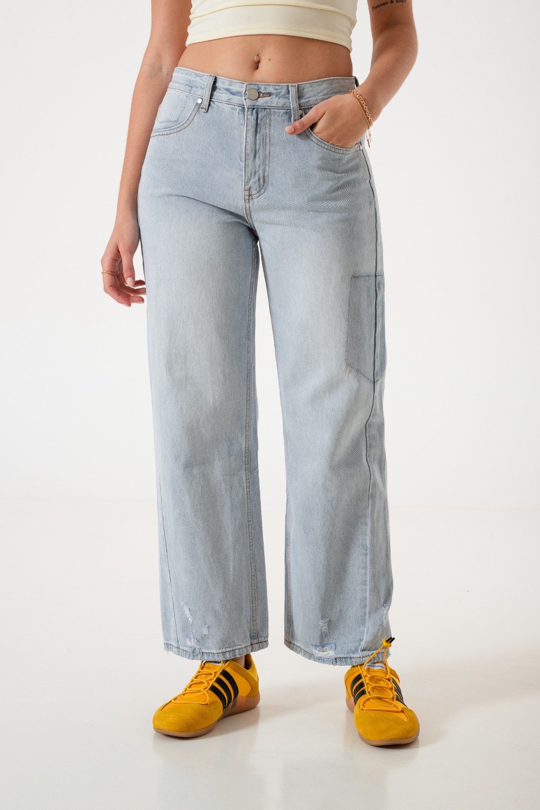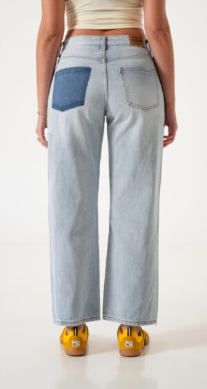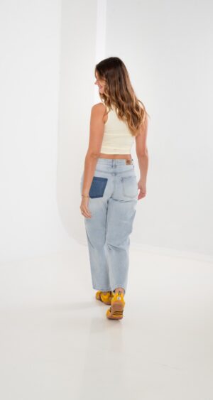 Jean estilo wid leg con detalle de bolsillos, pasacinto, cierre y boton