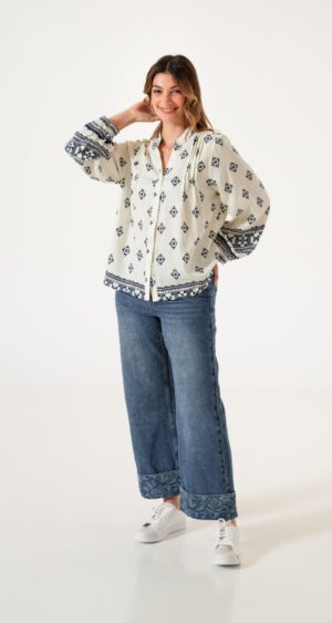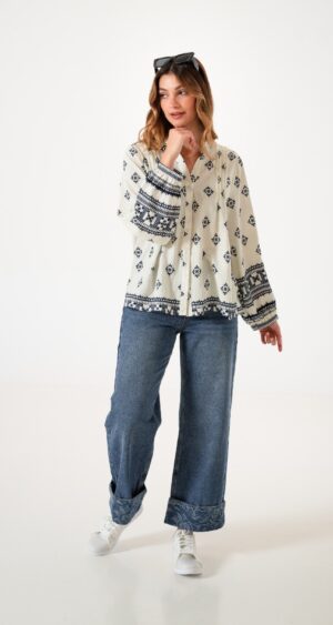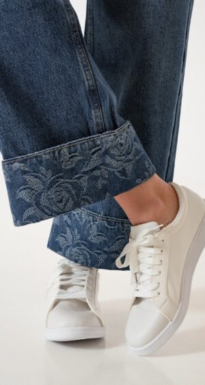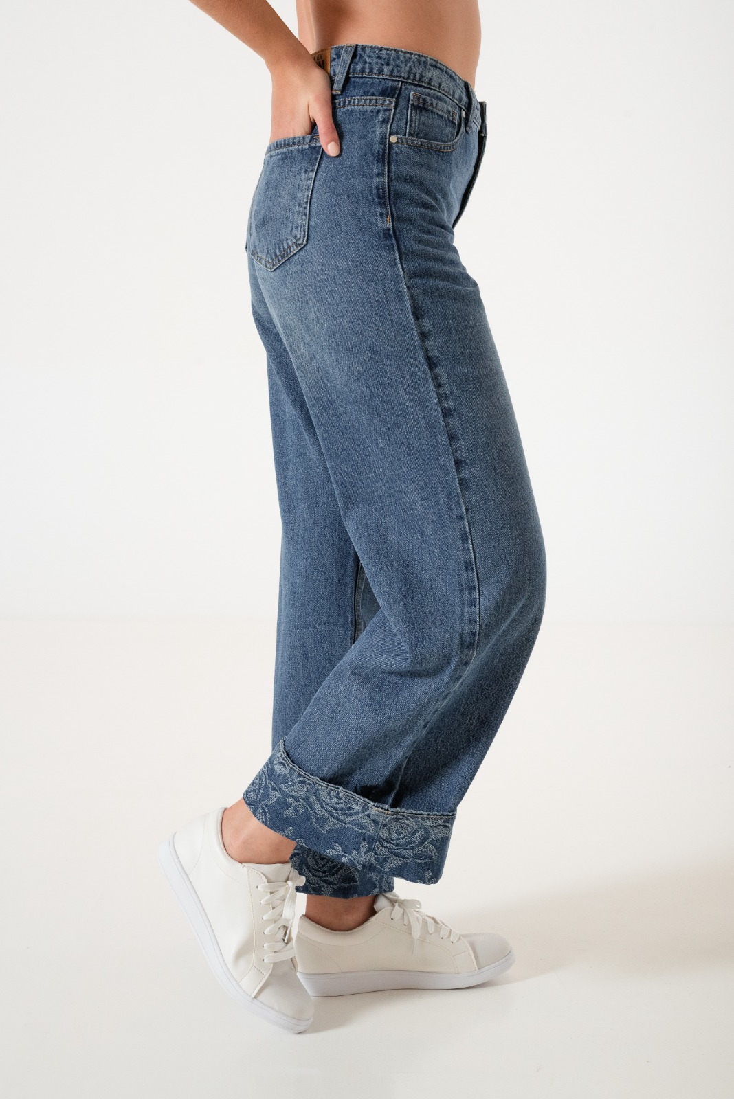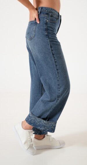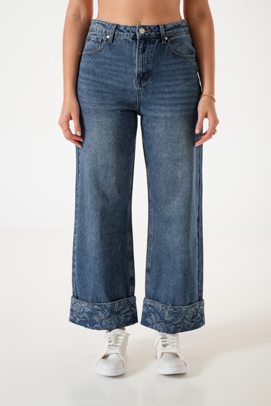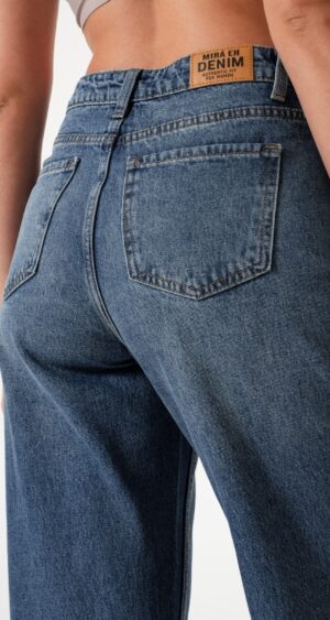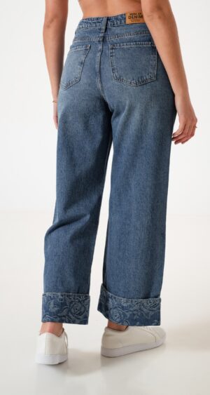 Jean estilo wid leg botamanga con detalle de bolsillos, pasacinto, cierre y boton