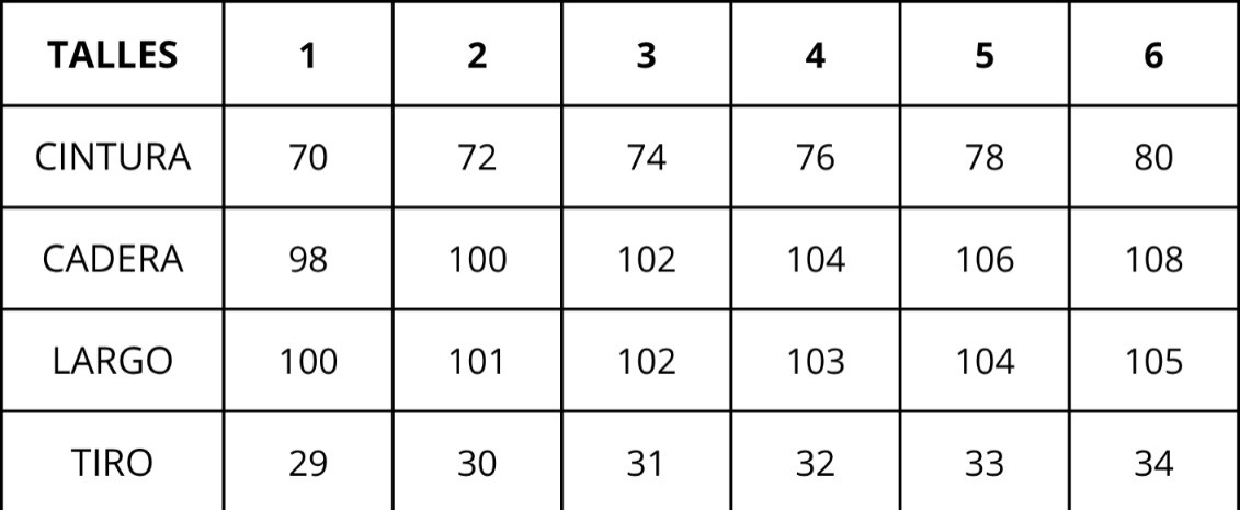 | Talles | 1, 2, 3, 4, 5, 6 |