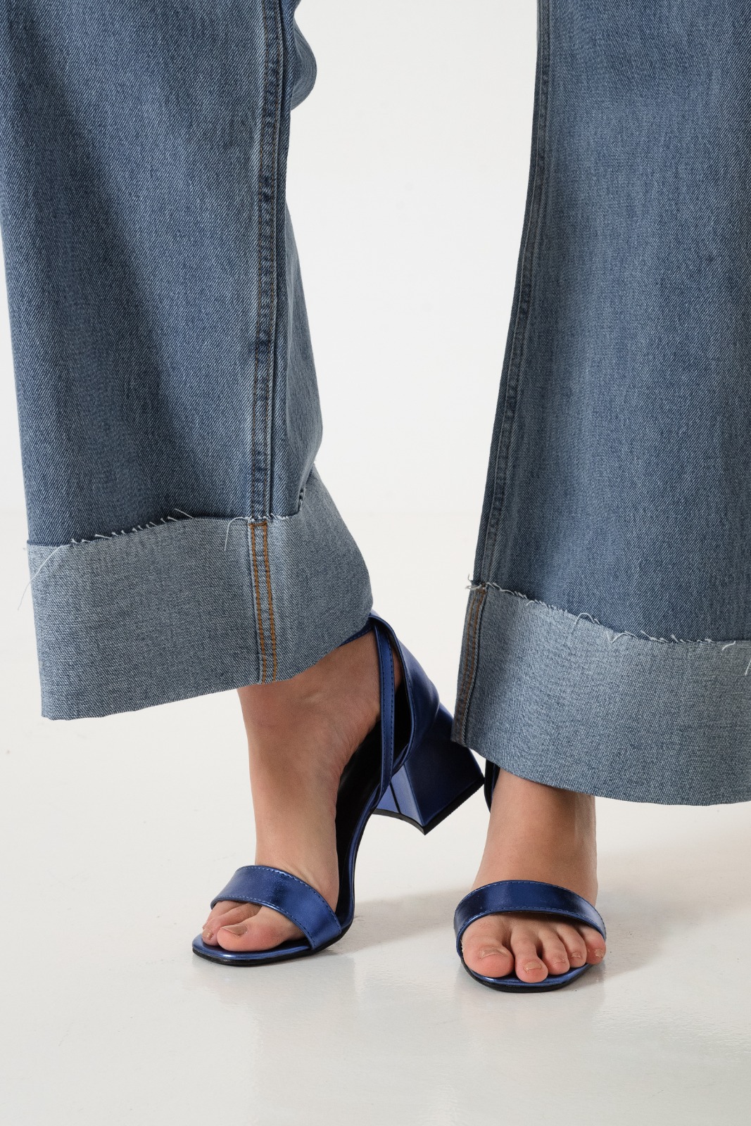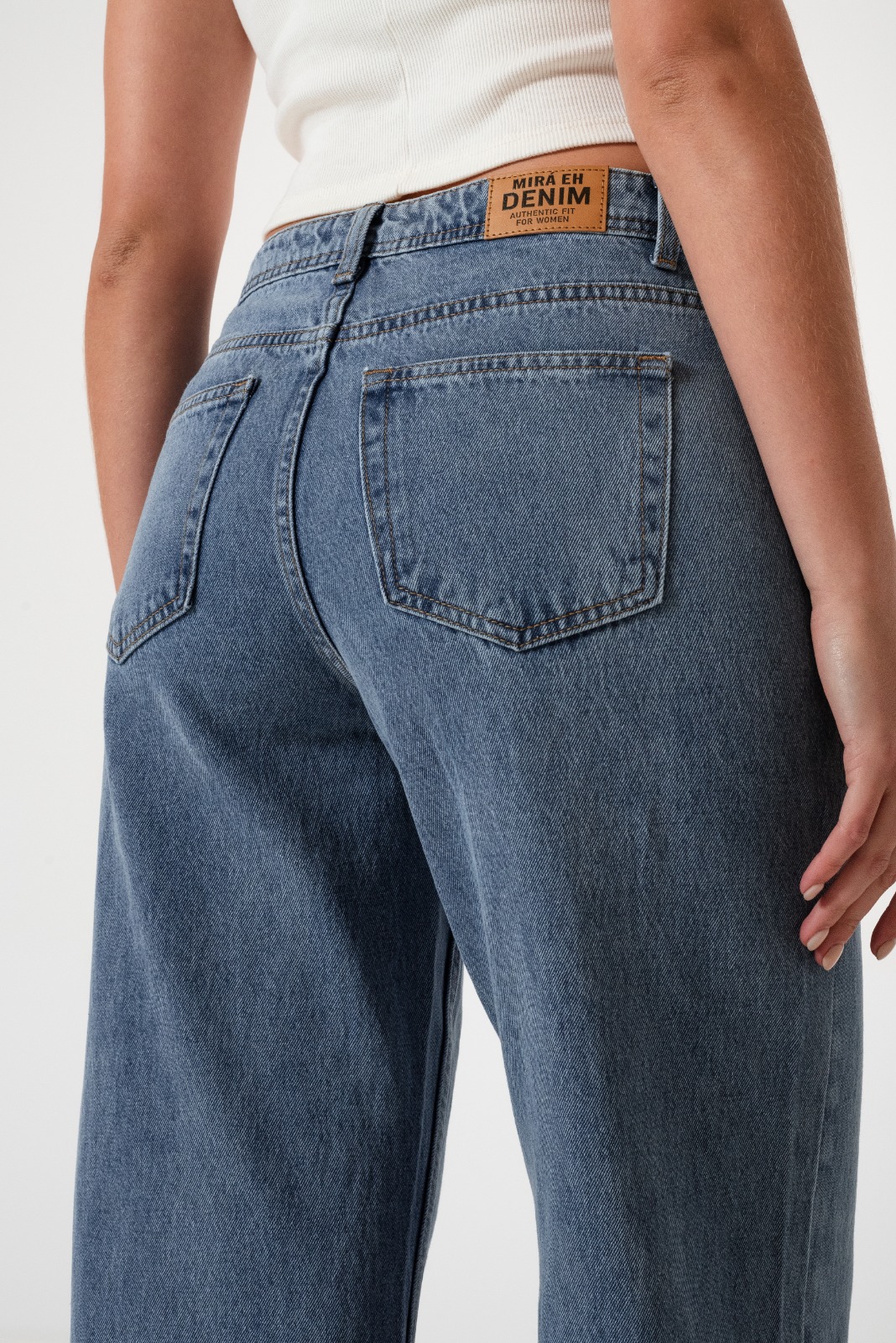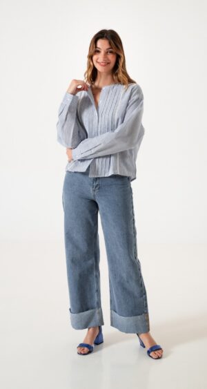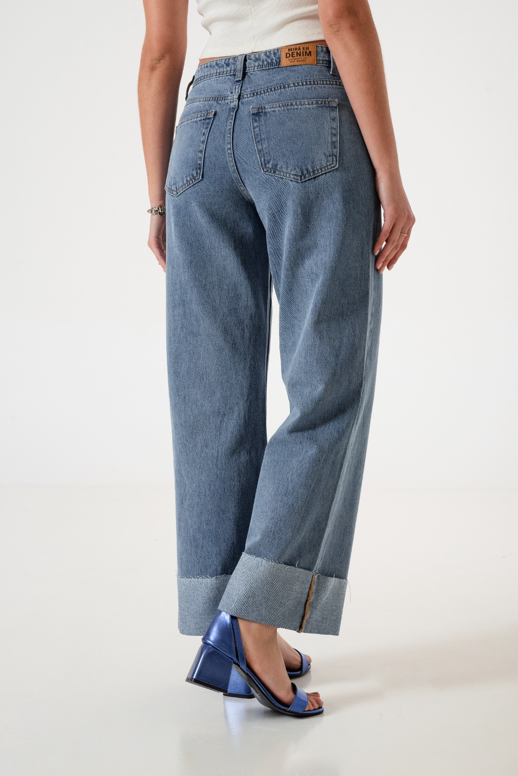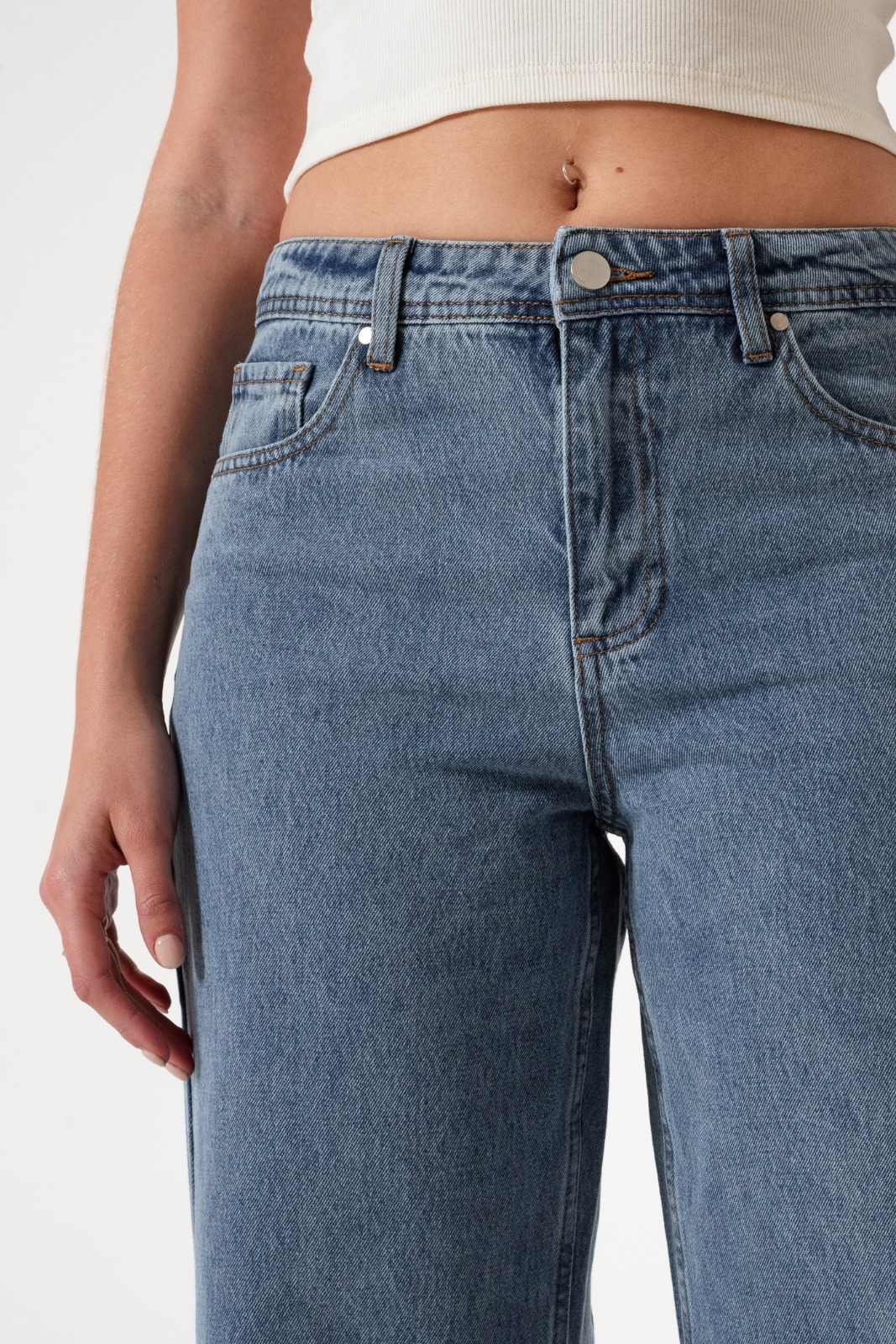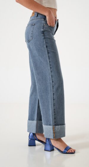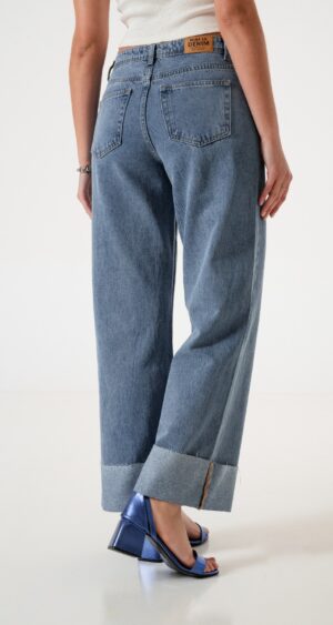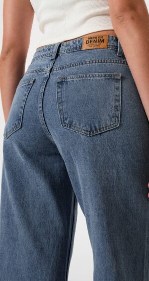 Jean estilo wid leg con detalle de botamanga con detalle de bolsillos, pasacinto, cierre y boton