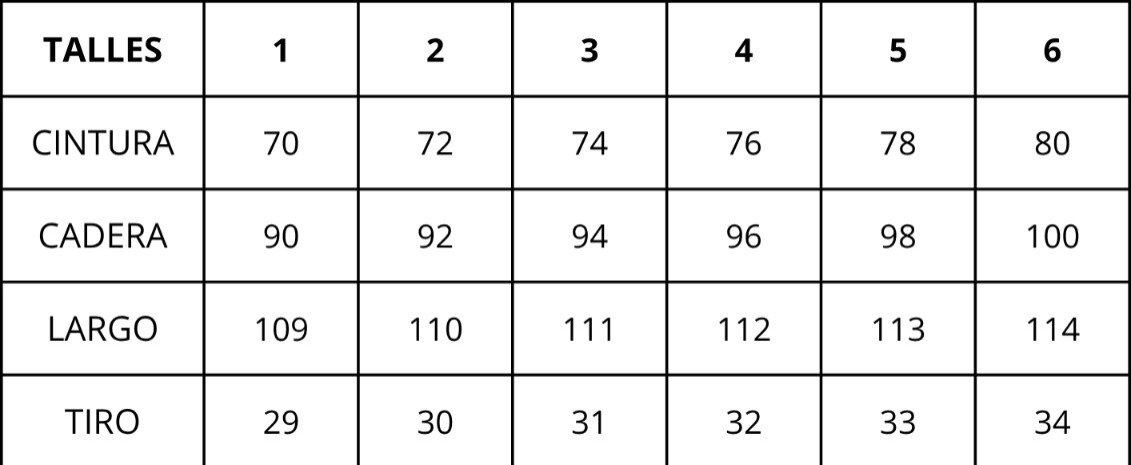 | Talles | 1, 2, 3, 4, 5, 6 |