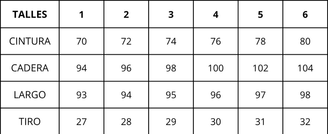 | Talles | 1, 2, 3, 4, 5, 6 |