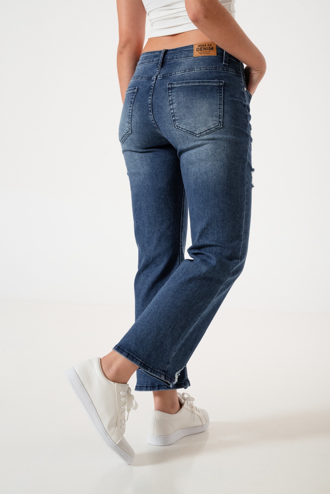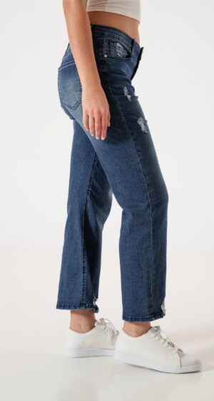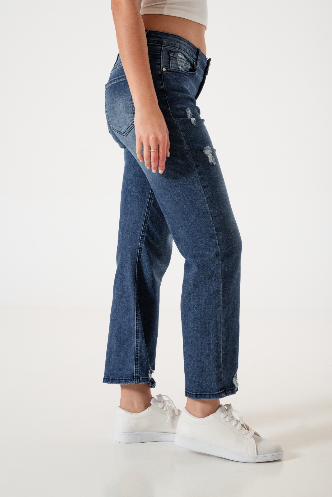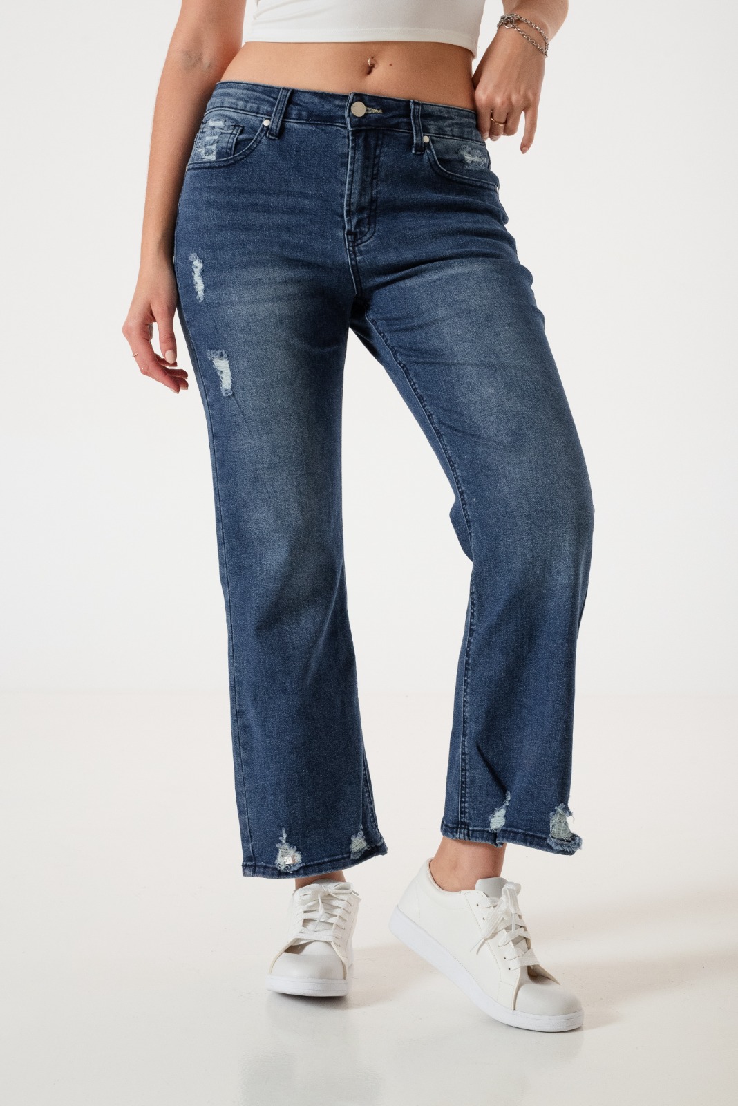 Jean estilo wid leg con detalle de roturas, bolsillos, pasacinto, cierre y boton