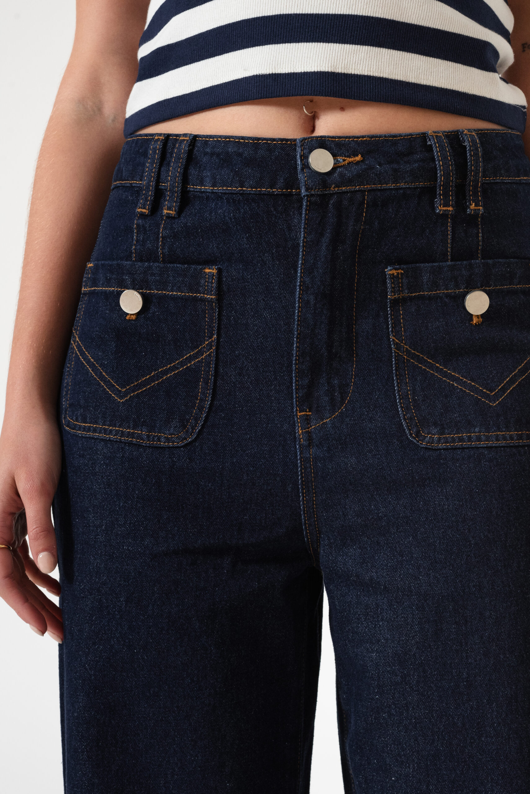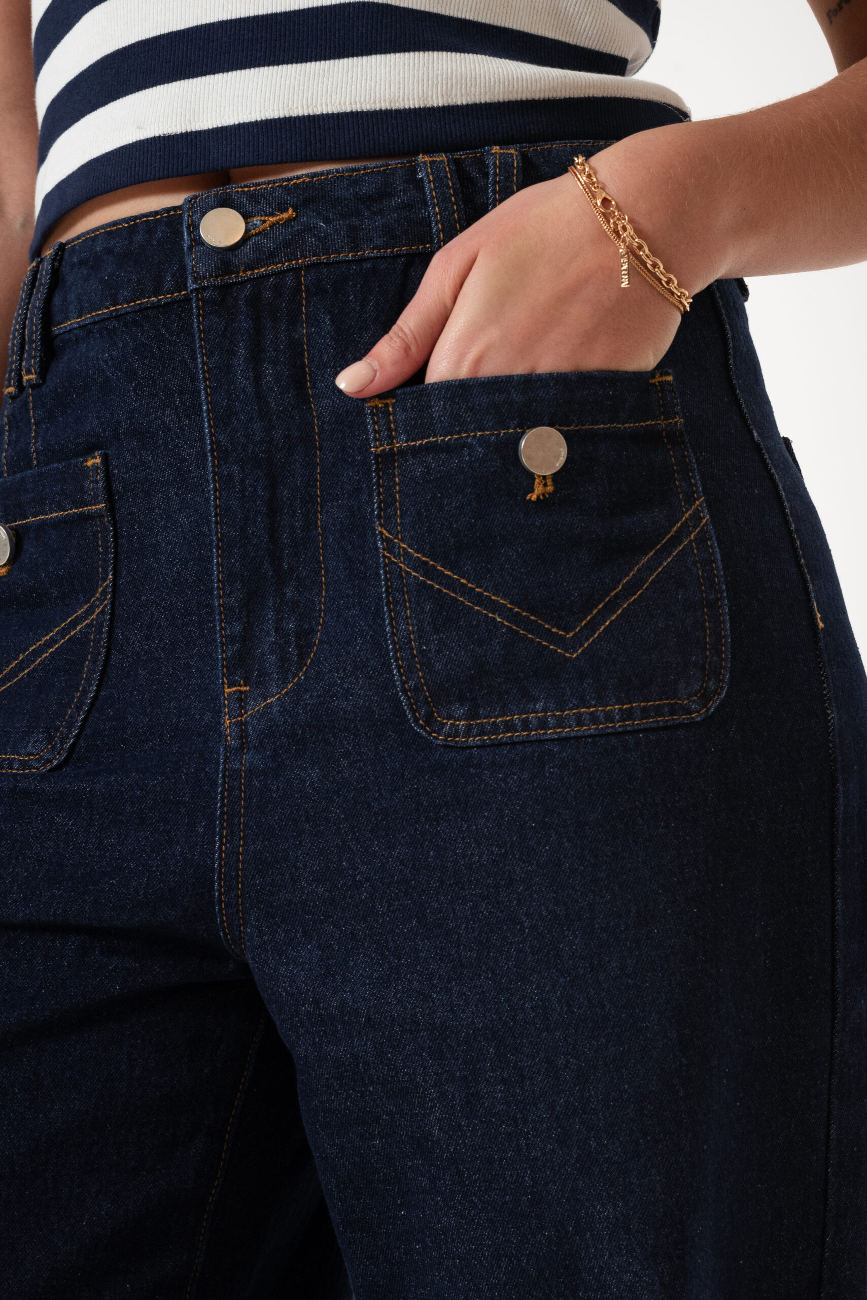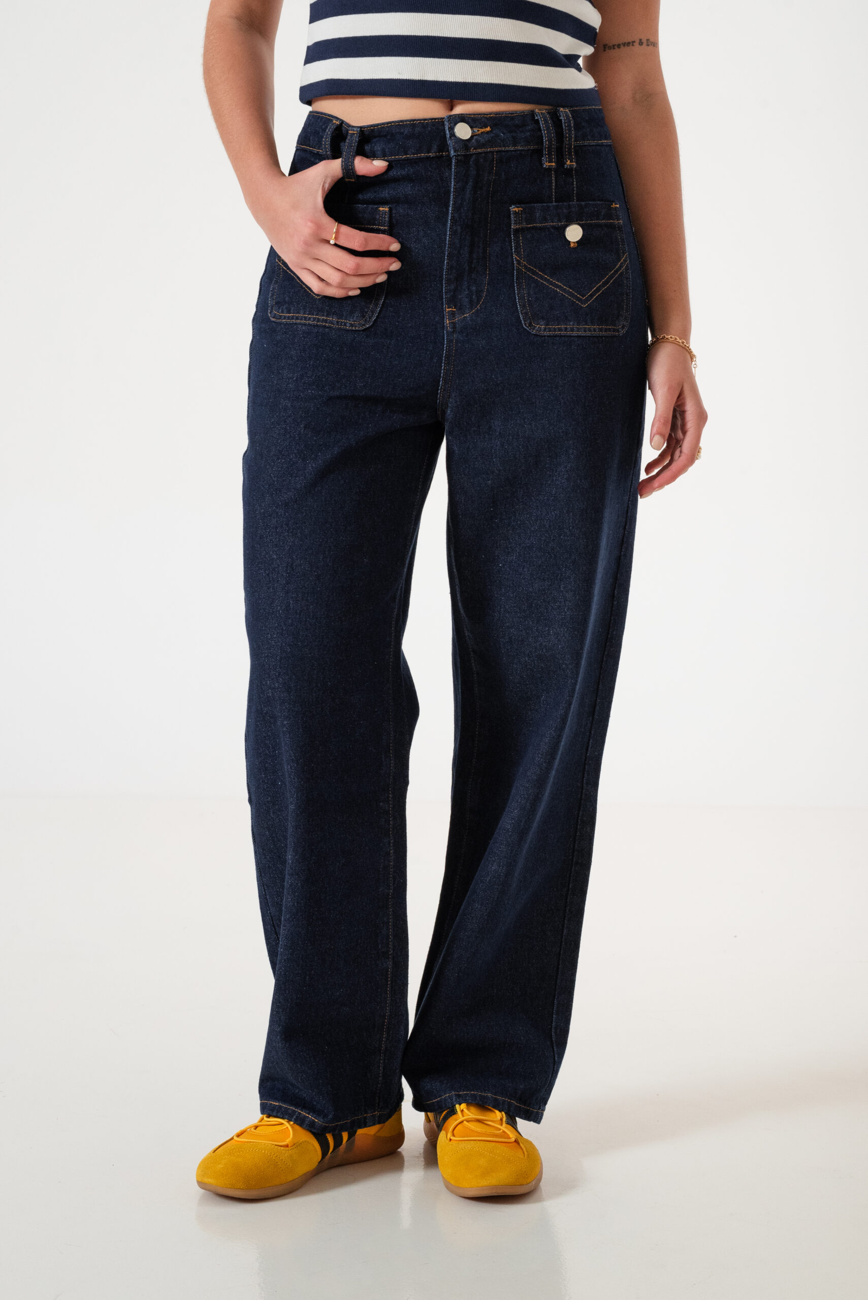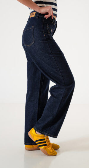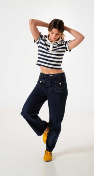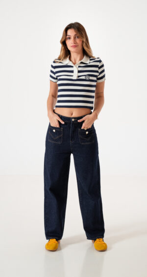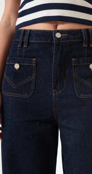Jean estilo wid leg con detalle de bolsillos frontales, pasacinto, cierre y boton