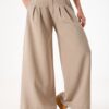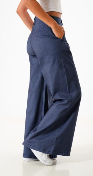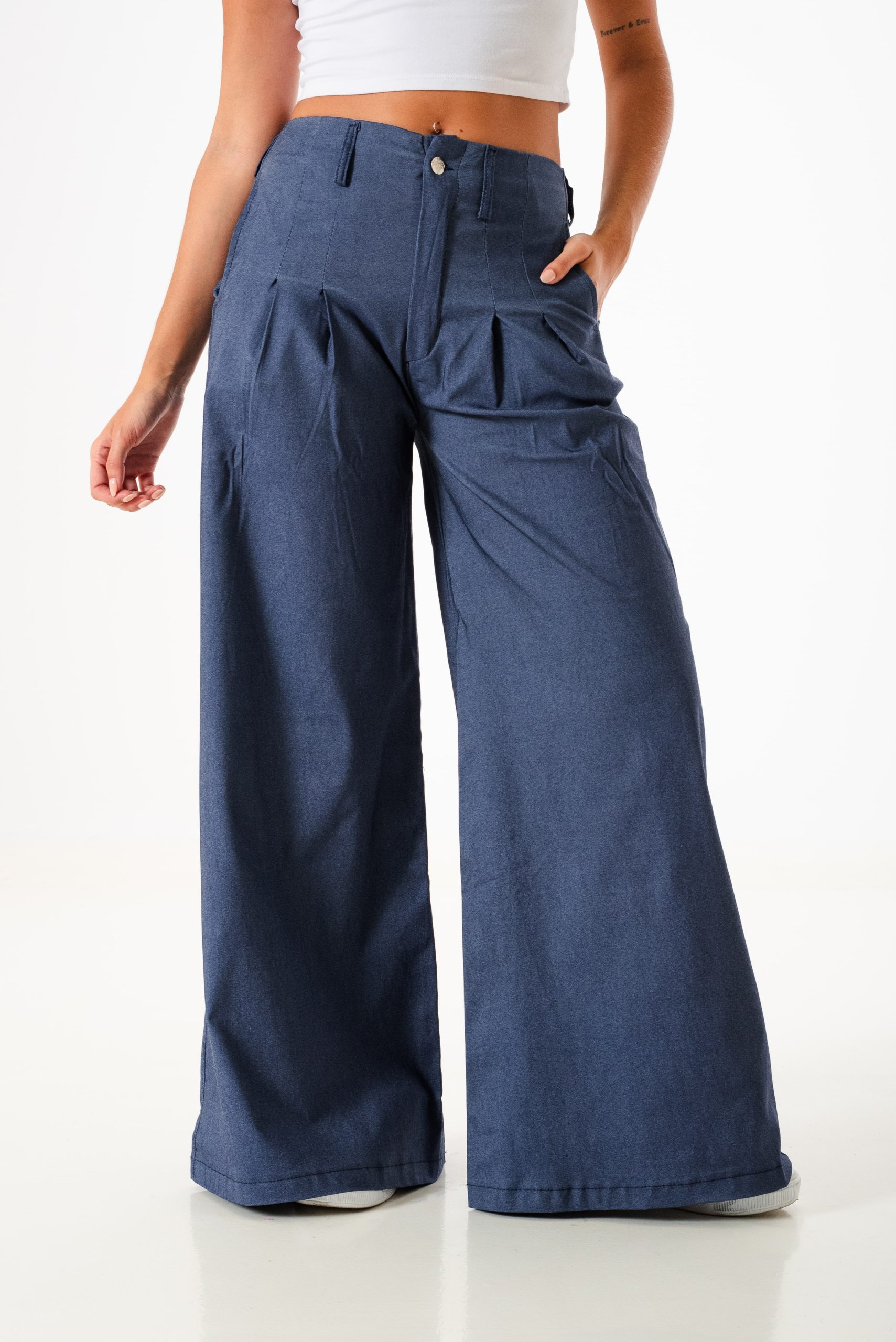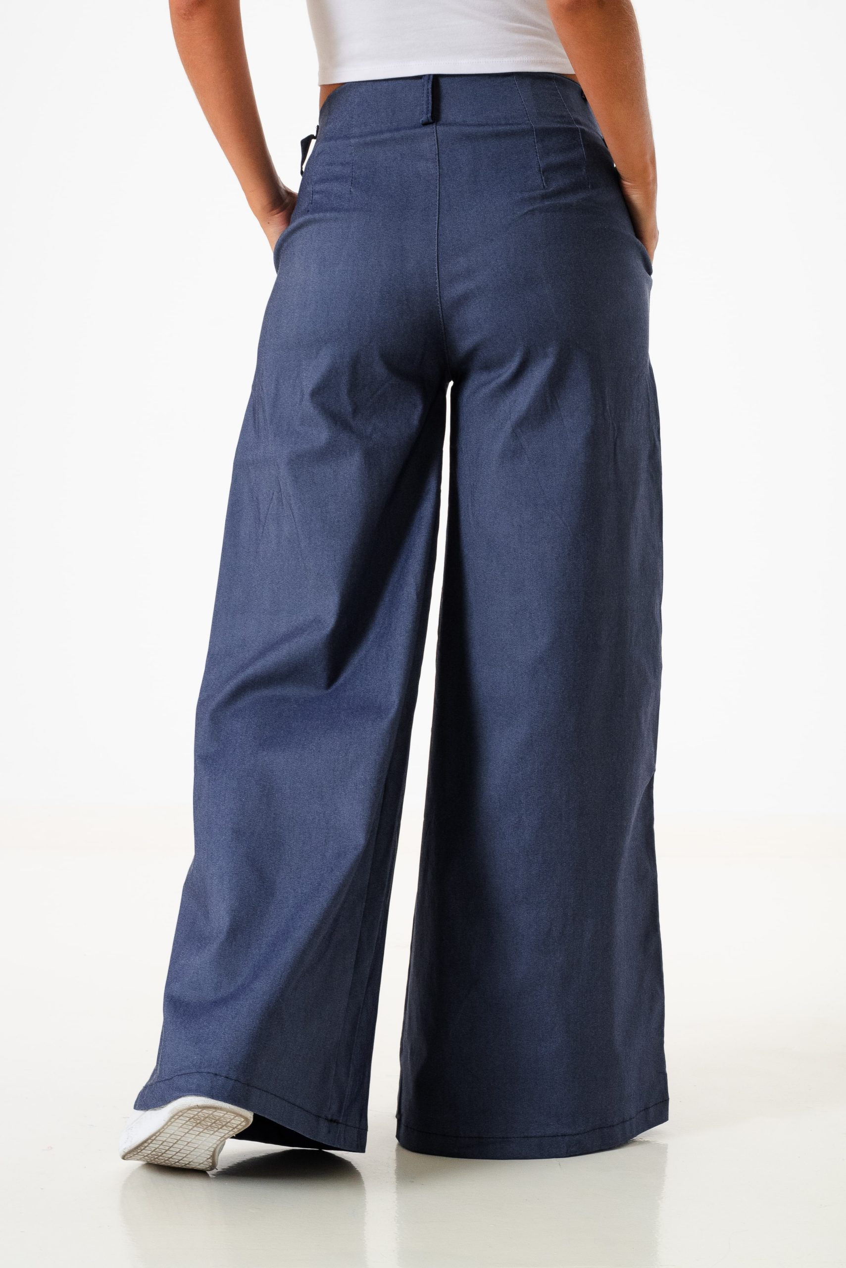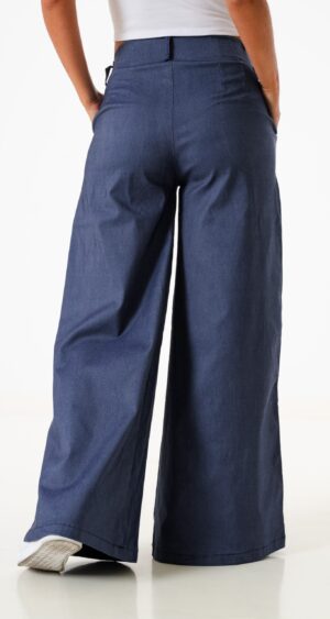 Pantalon estilo maxi palazo confeccionado en tela de bengalina simil jean con detalle de cintura avispa, bolsillos, cierre y boton.