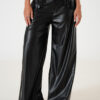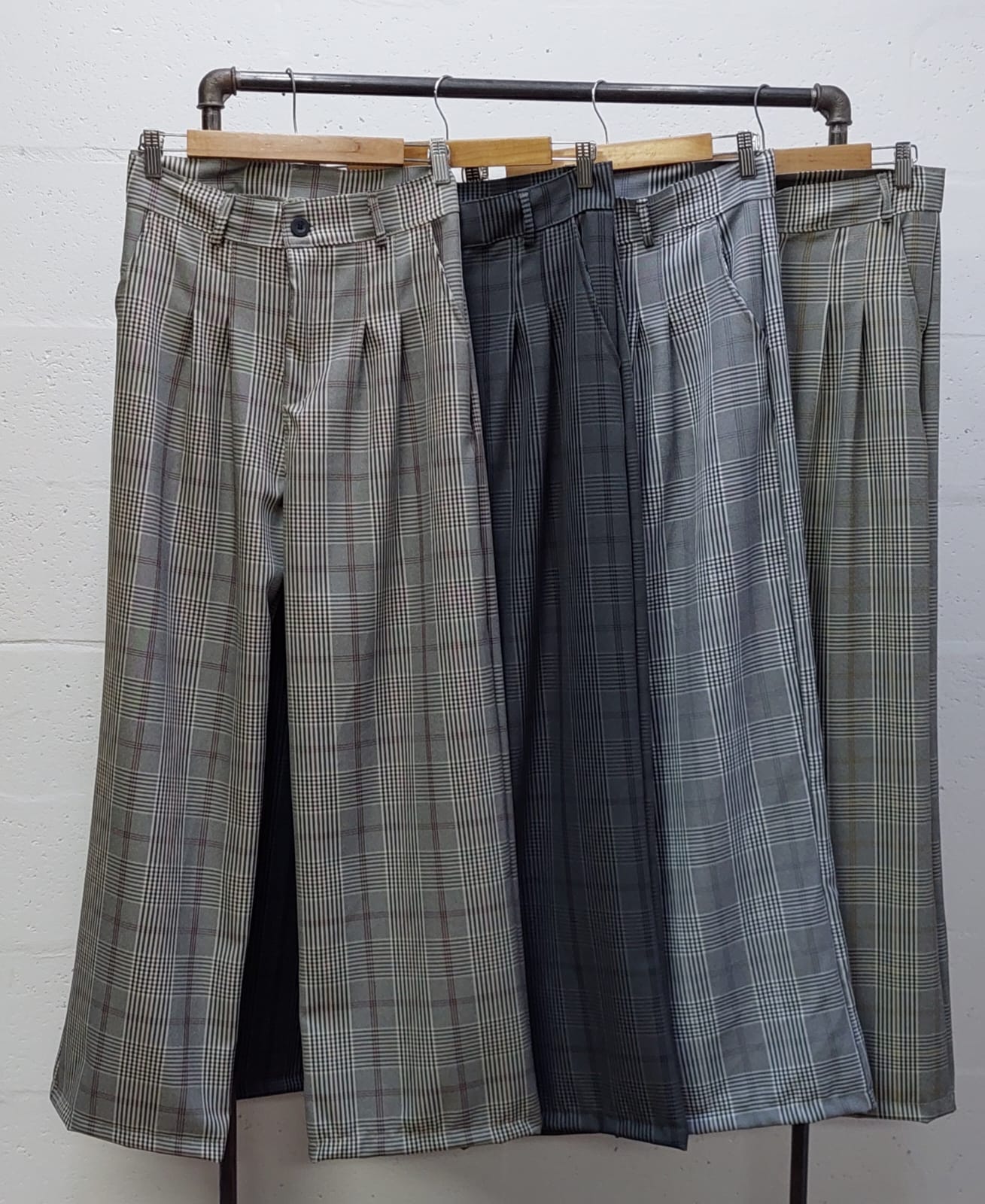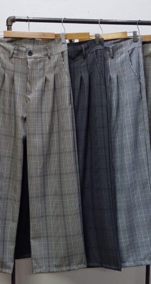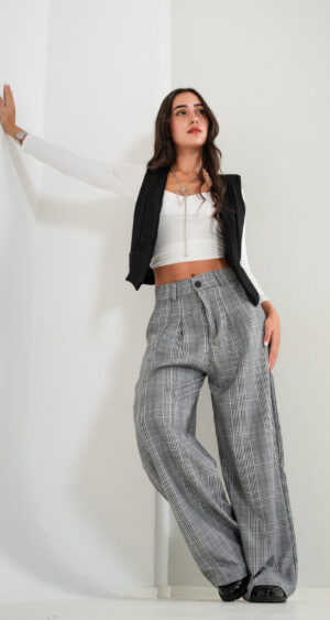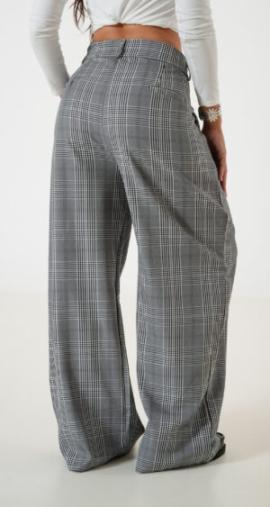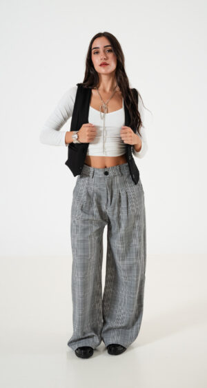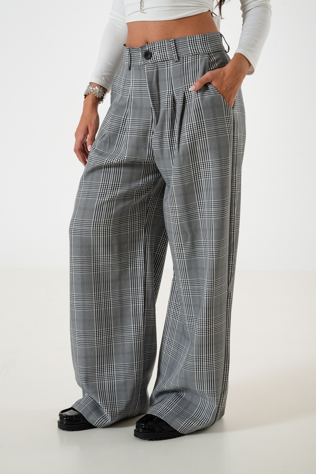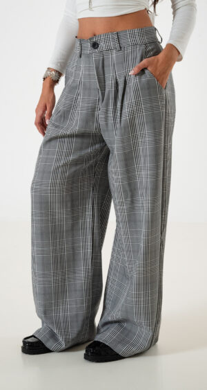 Pantalon estilo maxi palazo confeccionado en tela de sastrero escoses con de pinzas delanteras, bolsillos, pasacinto, cierre y boton.