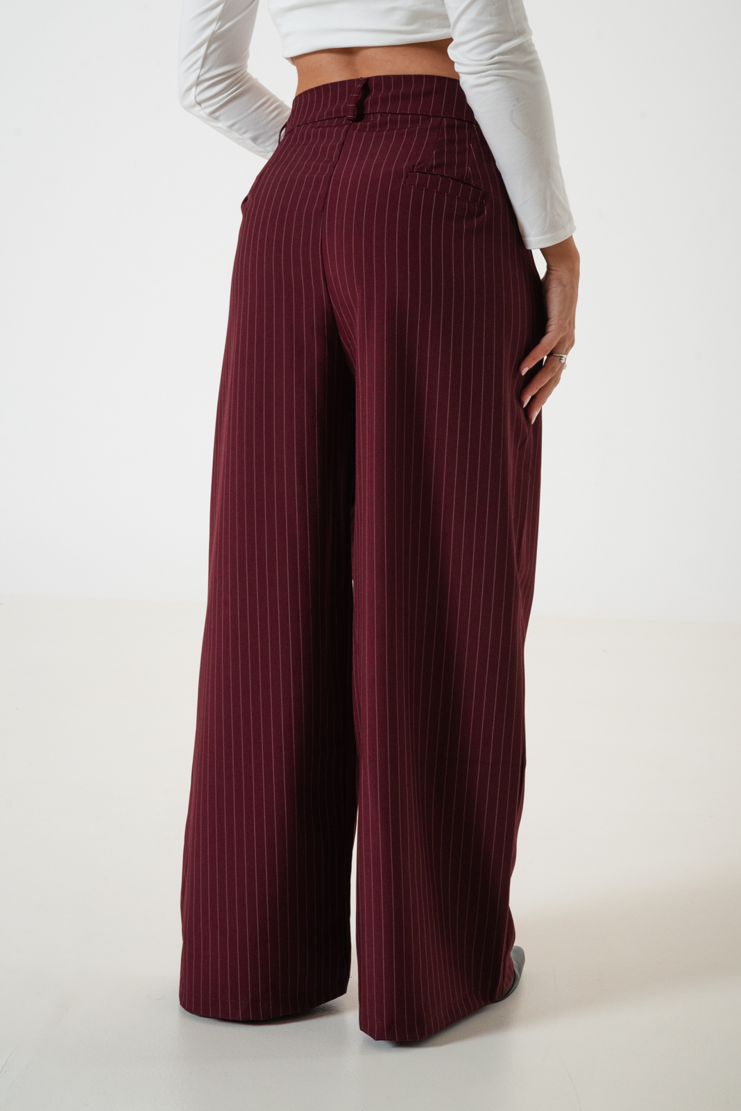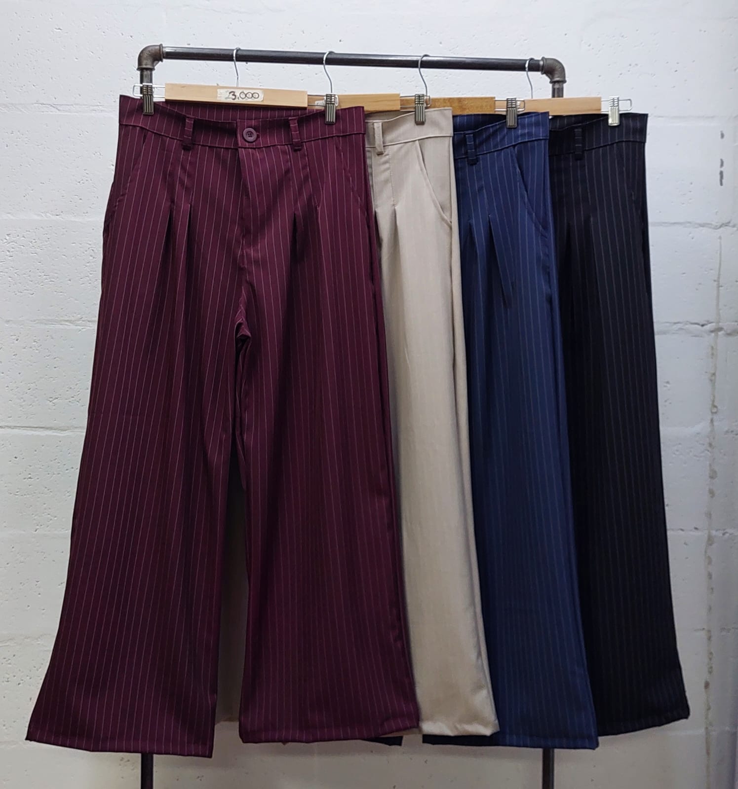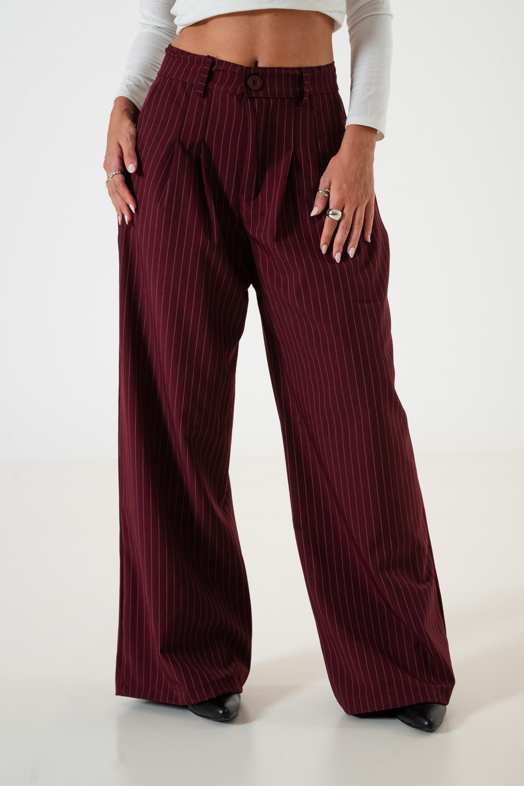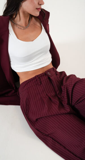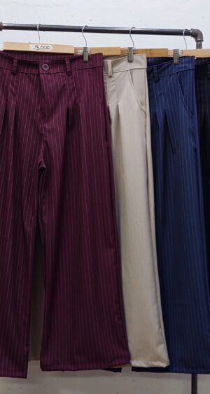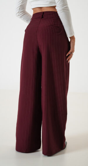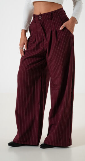 Pantalon estilo maxi palazo confeccionado en tela de sastrero rayado con detalle de doble pinzas delanteras, bolsillos, pasacinto, cierre y boton.