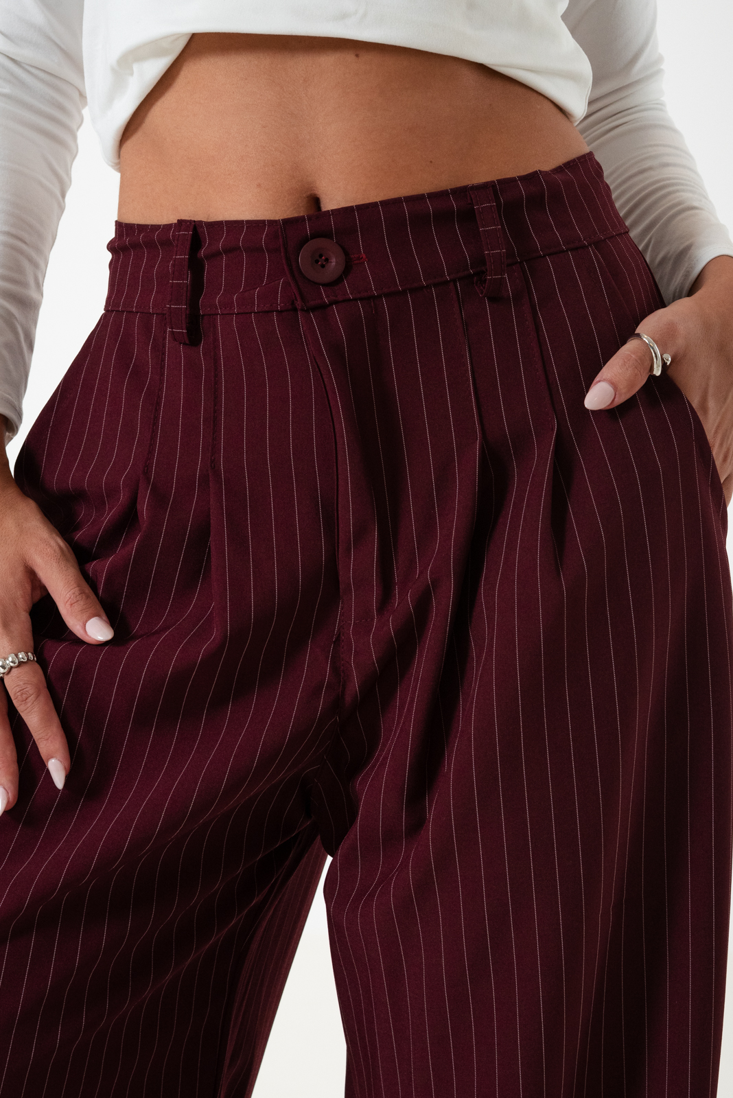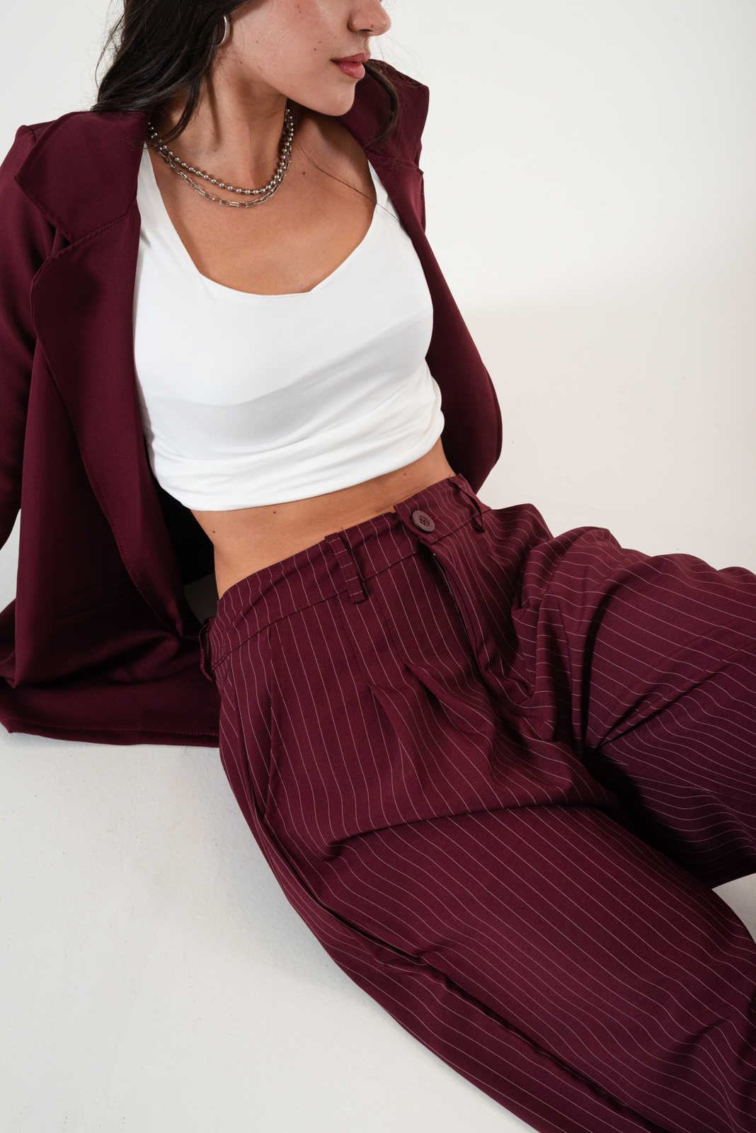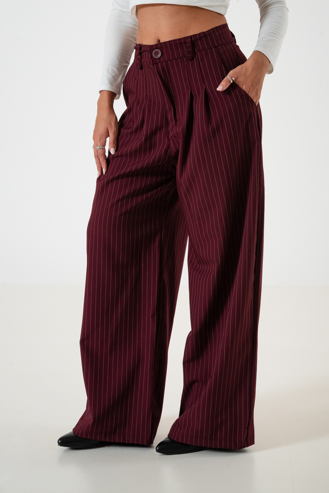 Pantalon estilo maxi palazo confeccionado en tela de sastrero rayado con detalle de doble pinzas delanteras, bolsillos, pasacinto, cierre y boton.