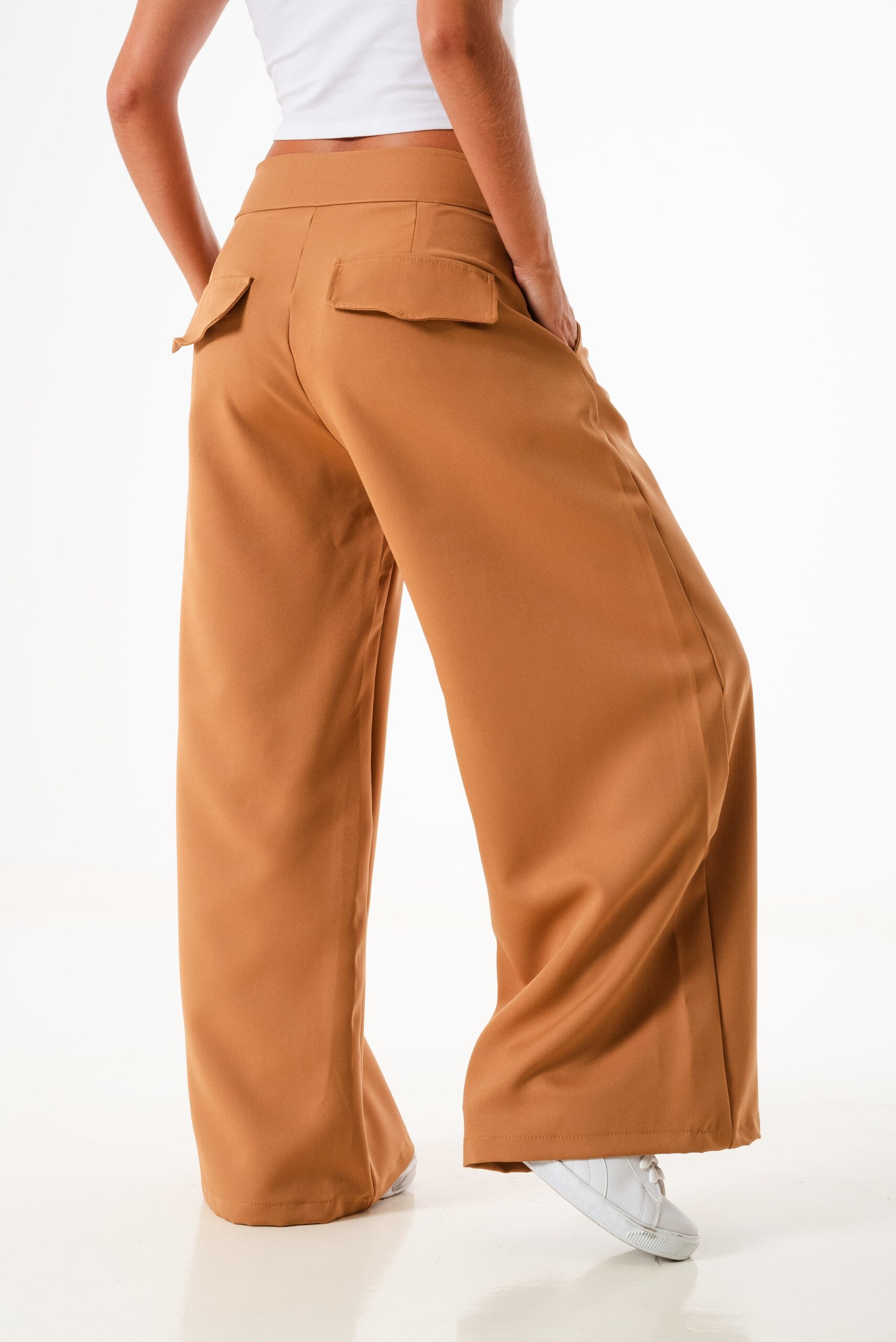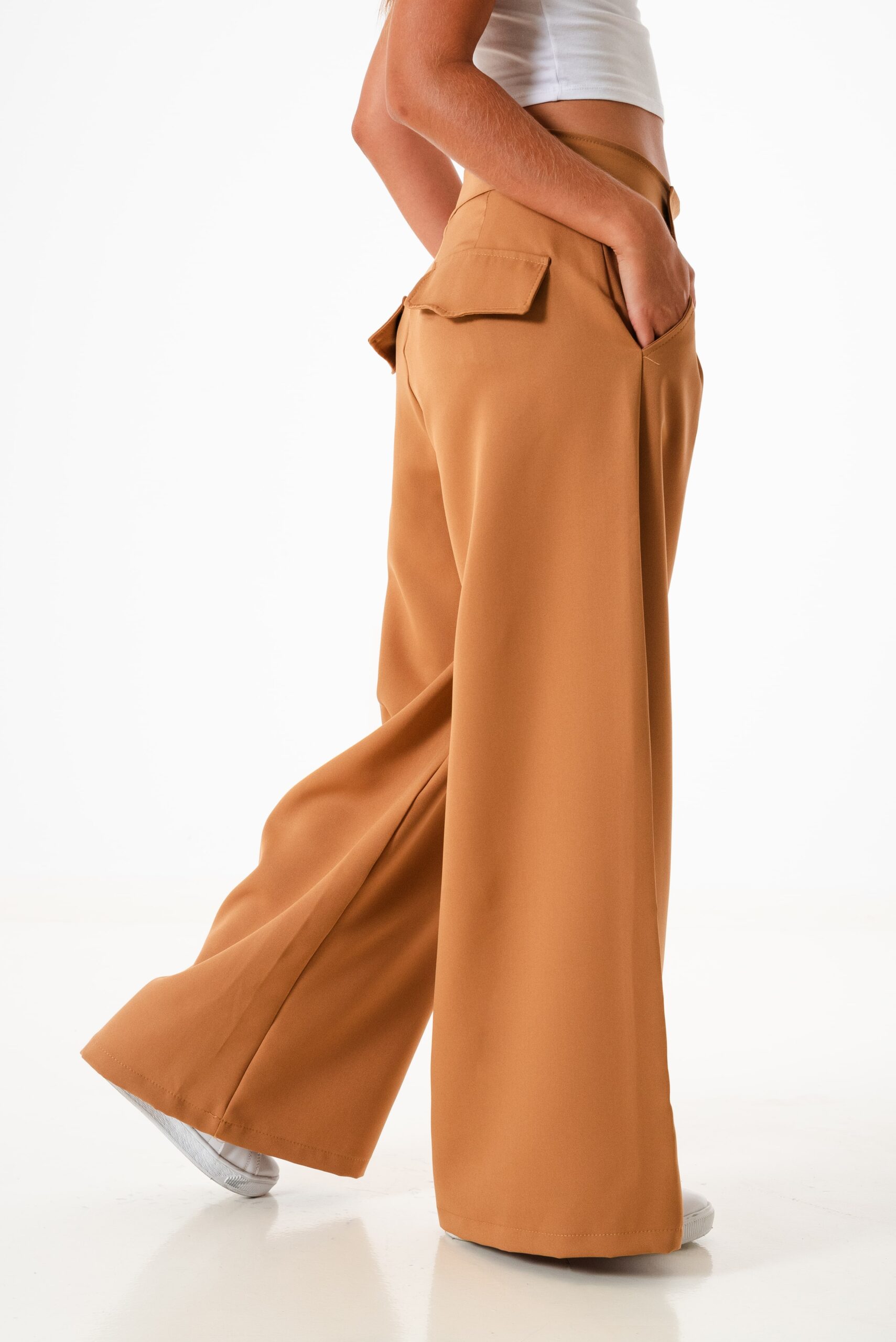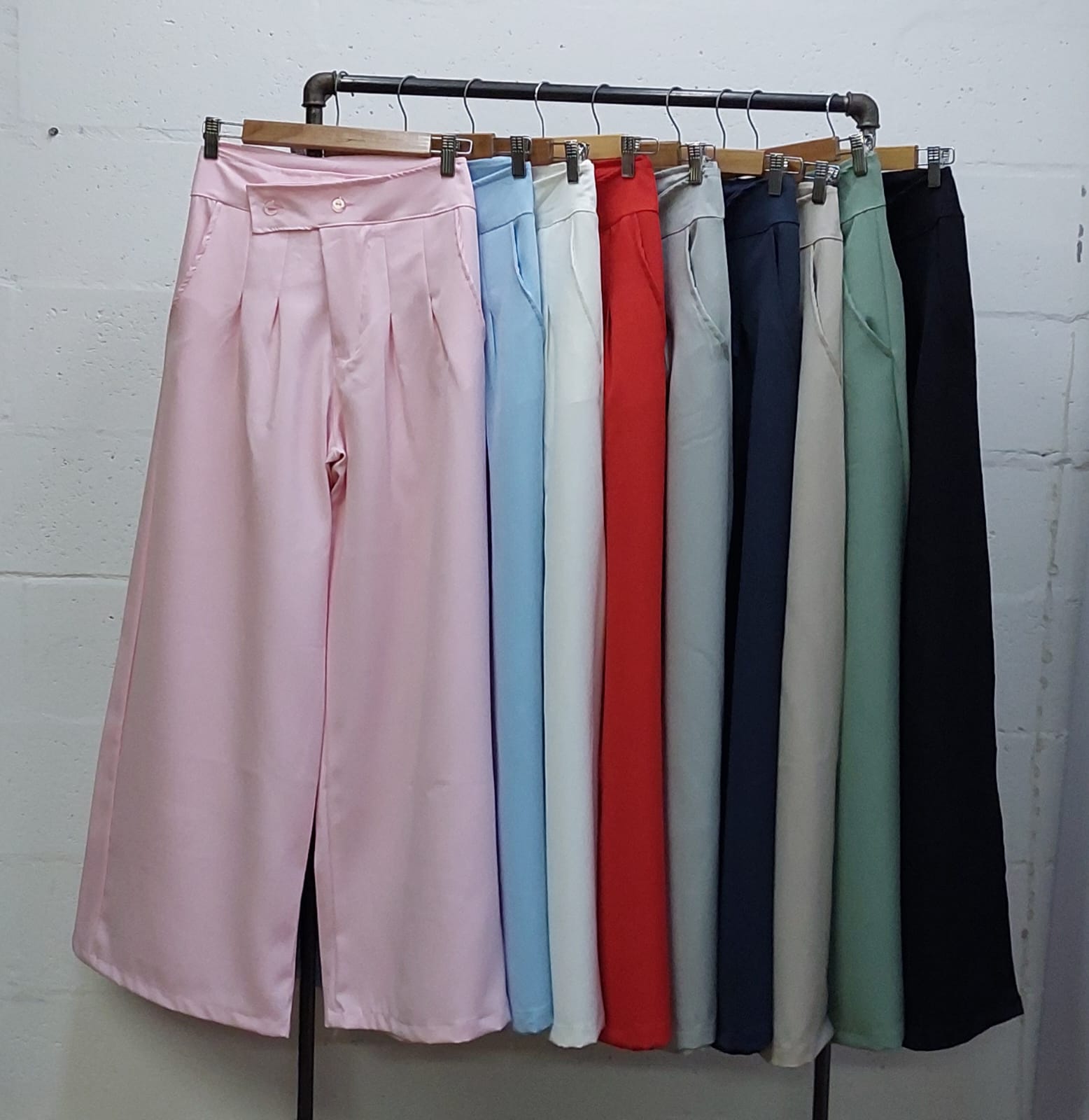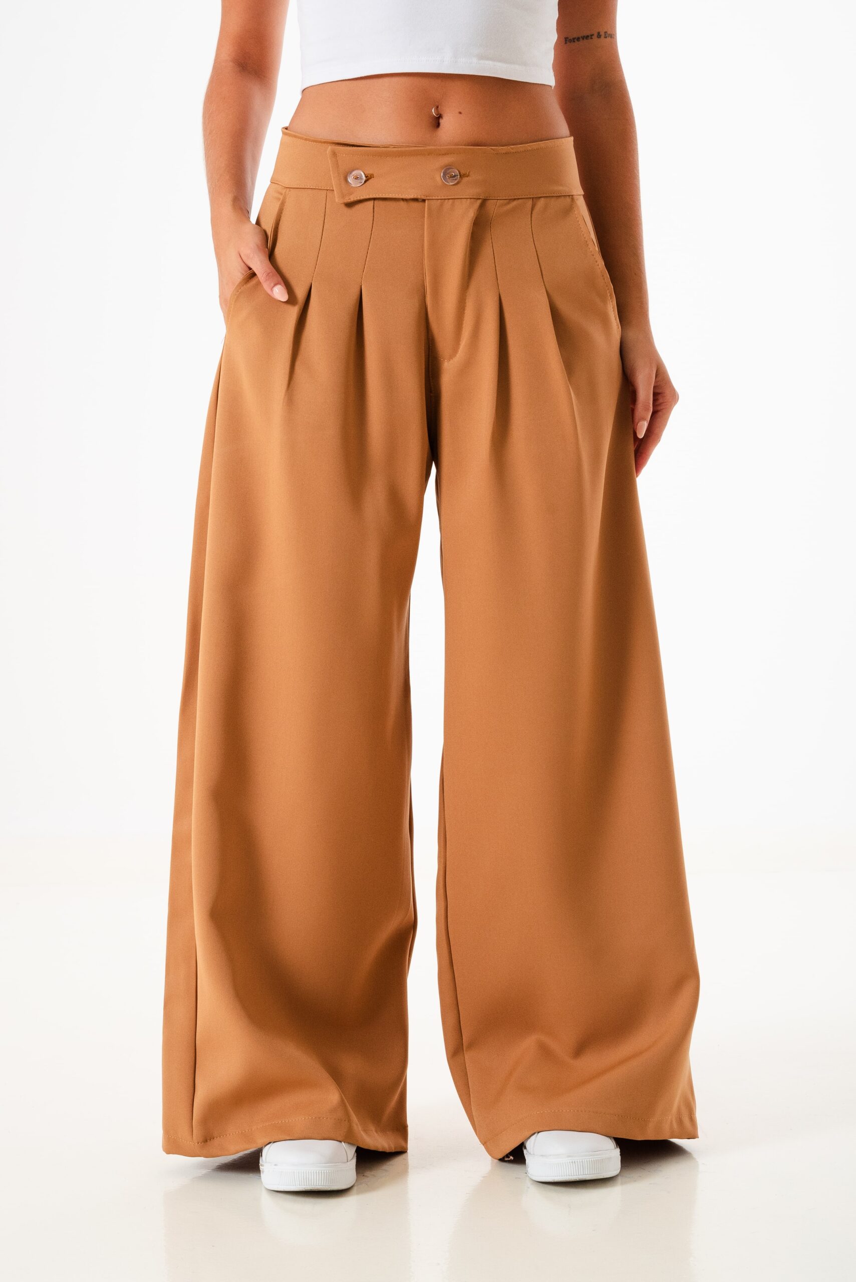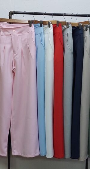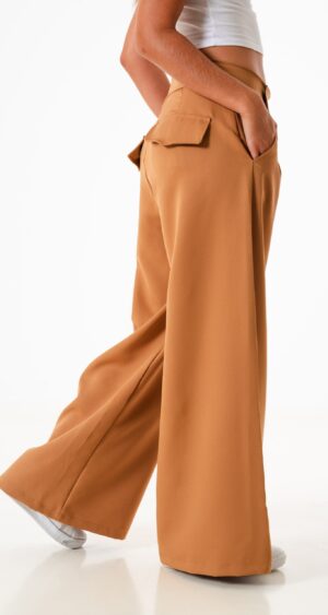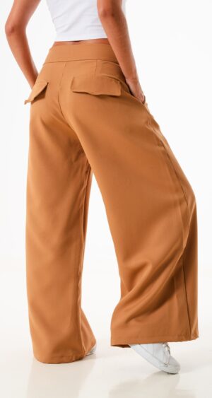 Pantalon estilo maxi palazo confeccionado en tela sastrero con detalle de doble boton cruzado, bolsillos, pasacinto, cierre y boton.