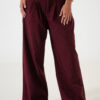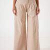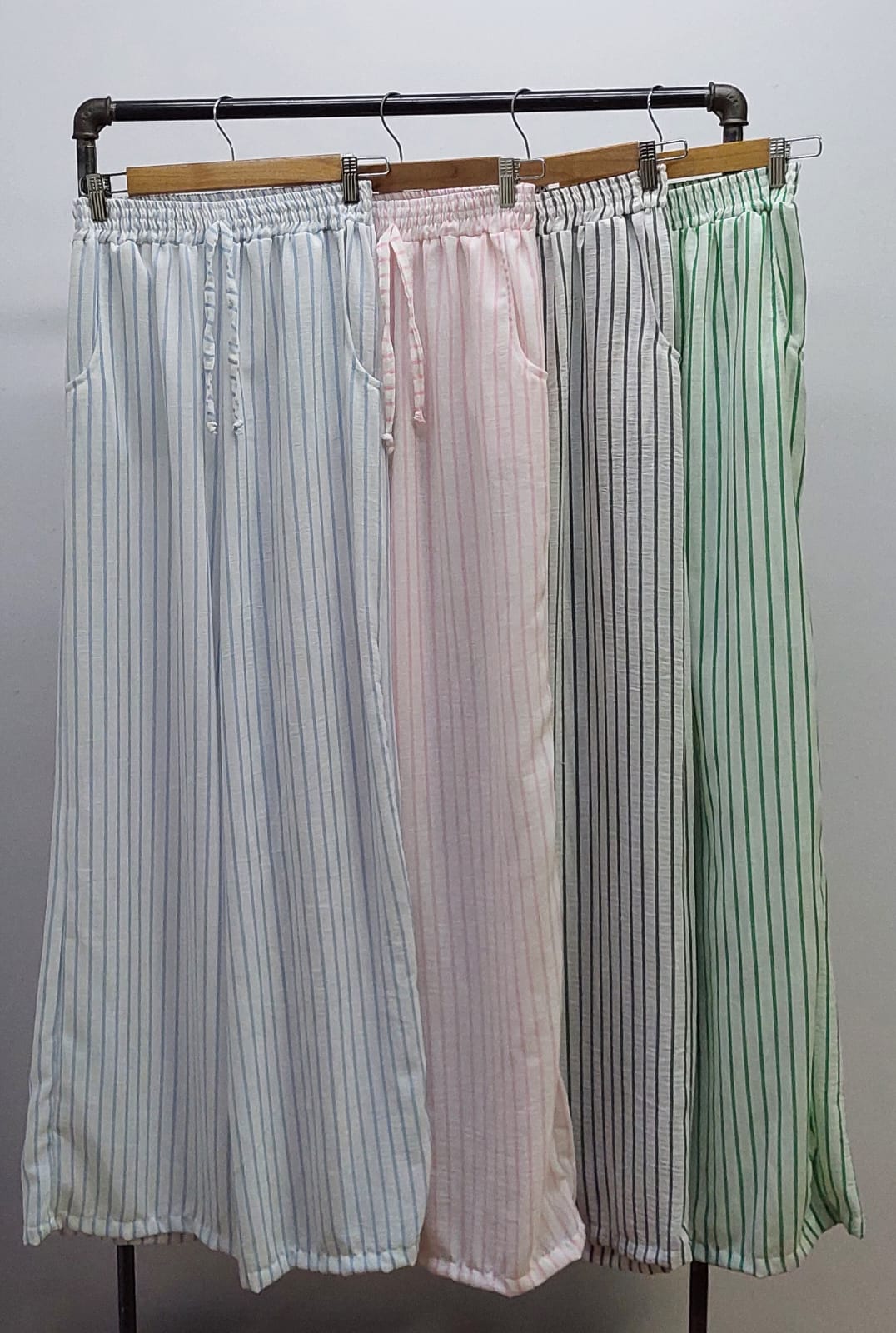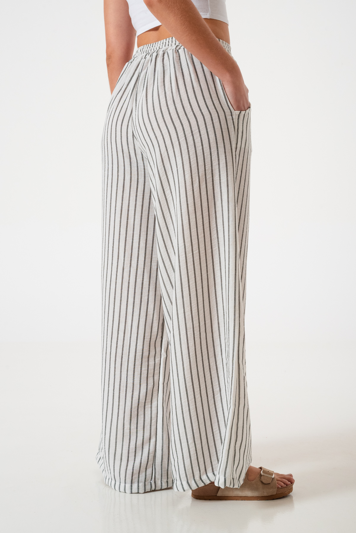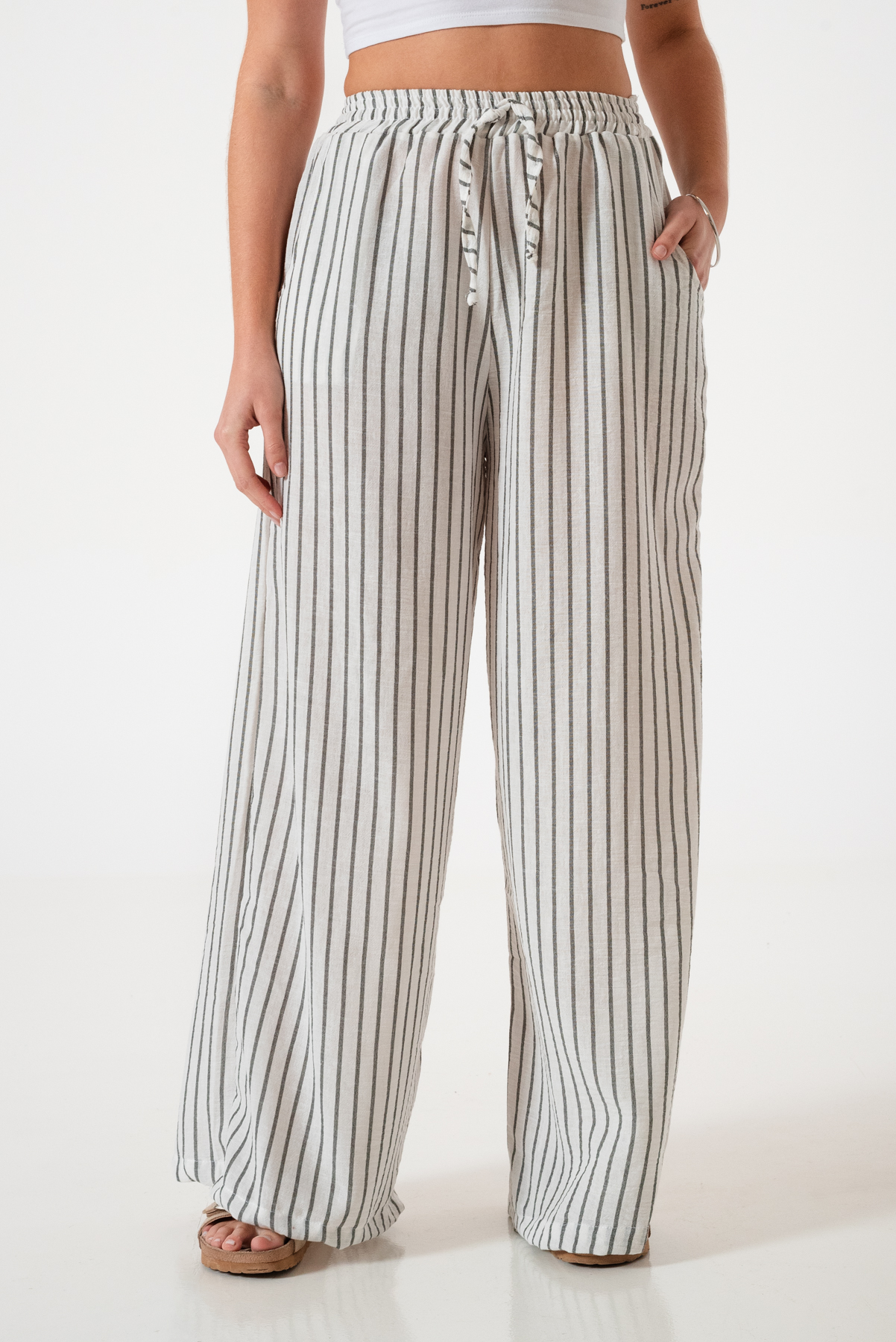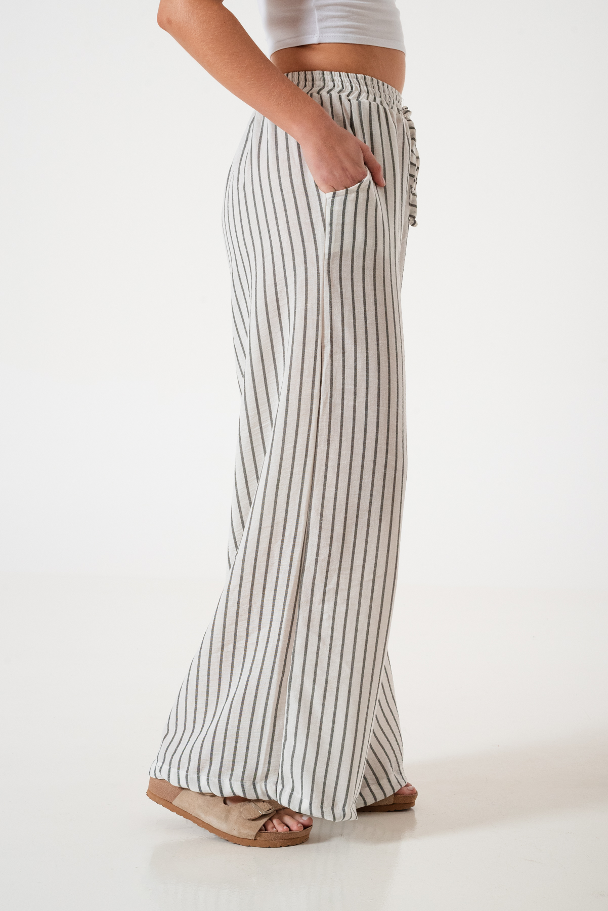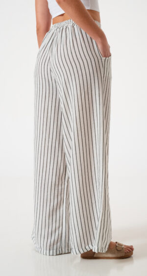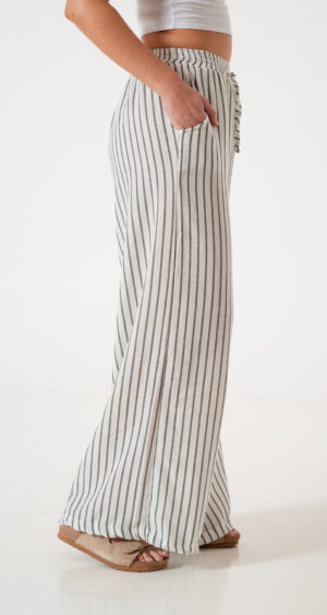 Pantalon estilo maxi palazo confeccionado en tela de lino rayado con detalle de cintura elastizada y bolsillos.
