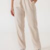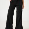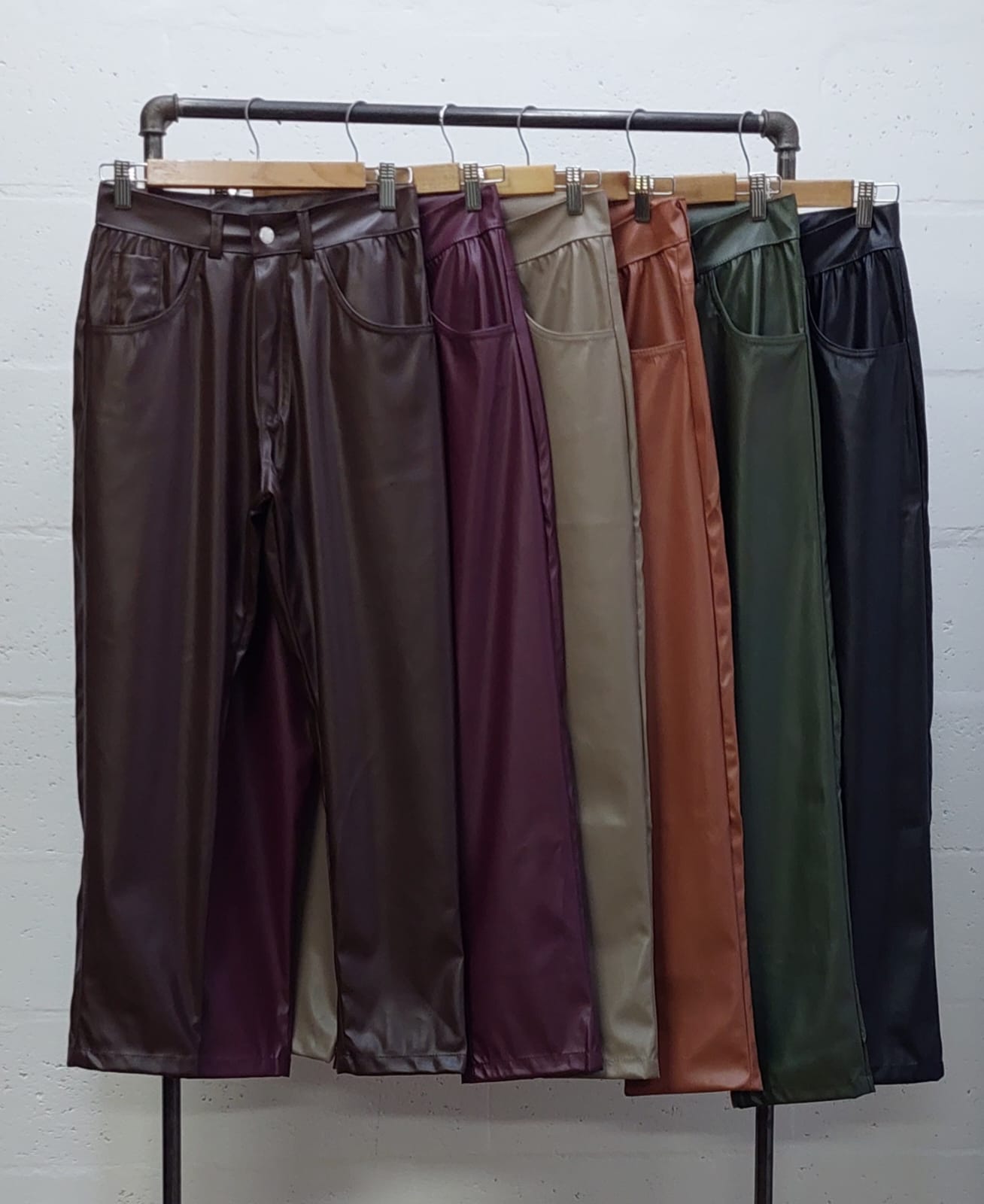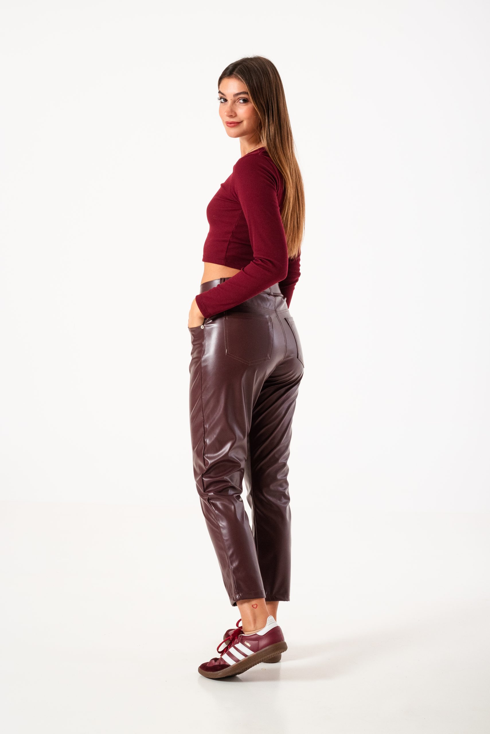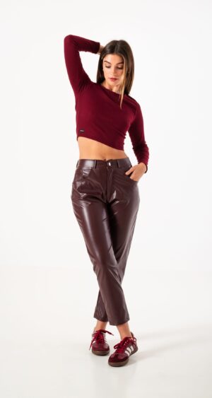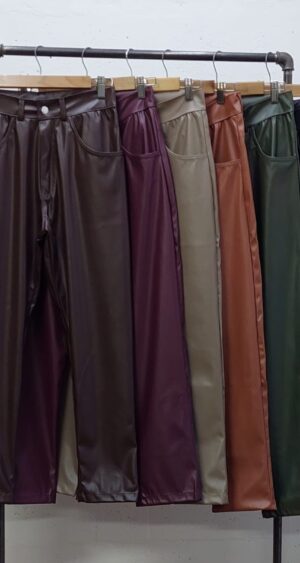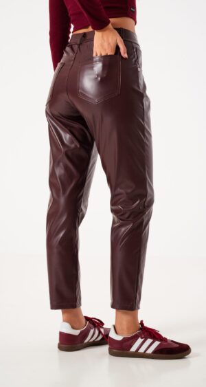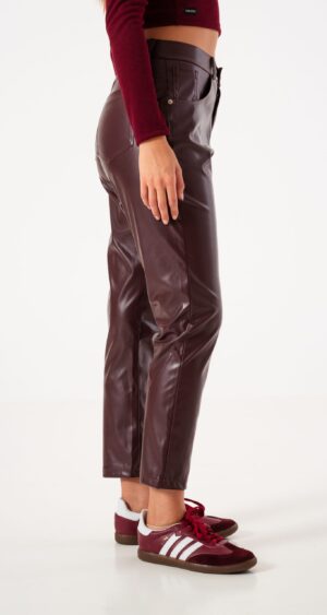 Pantalon estilo mom fit confeccionado en tela de ecocuero con detalle de bolsillos, pasacinto, cierre y boton.