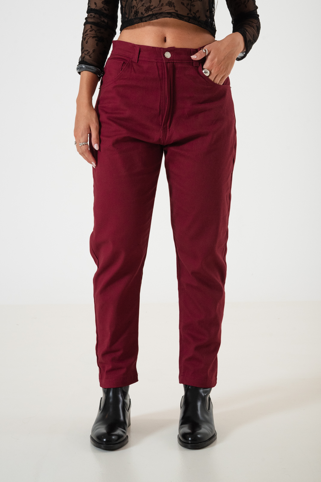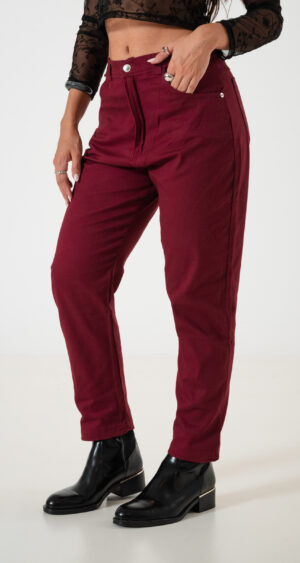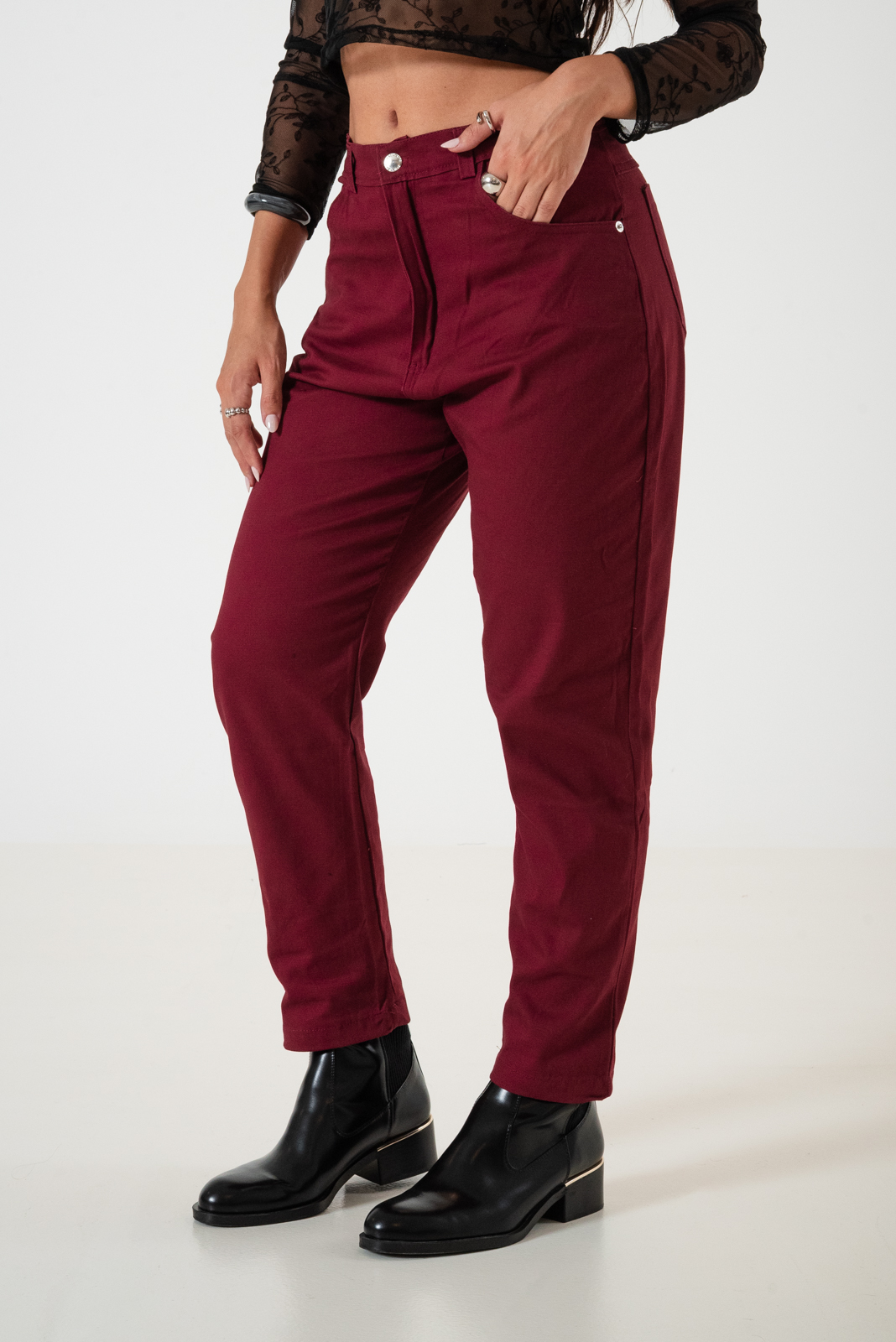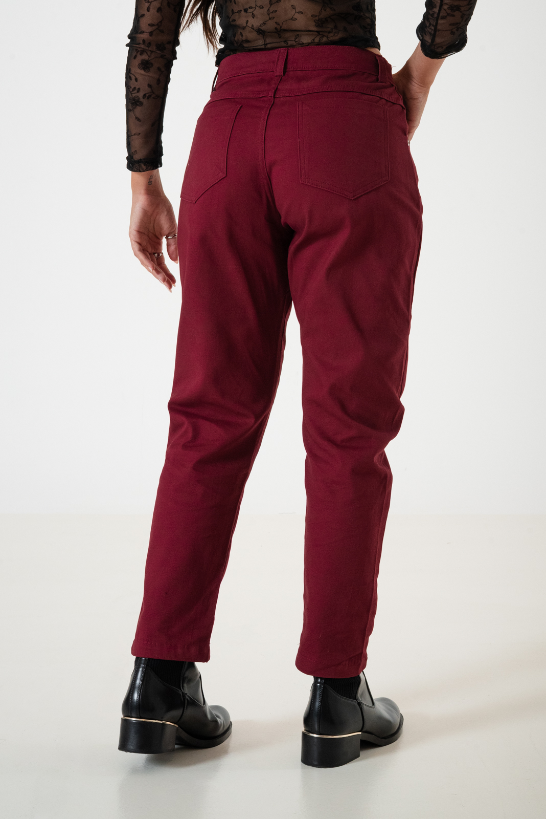 Pantalon estilo mom fit confeccionado en tela de gabardina con detalle de bolsillos, pasacinto, cierre y boton.