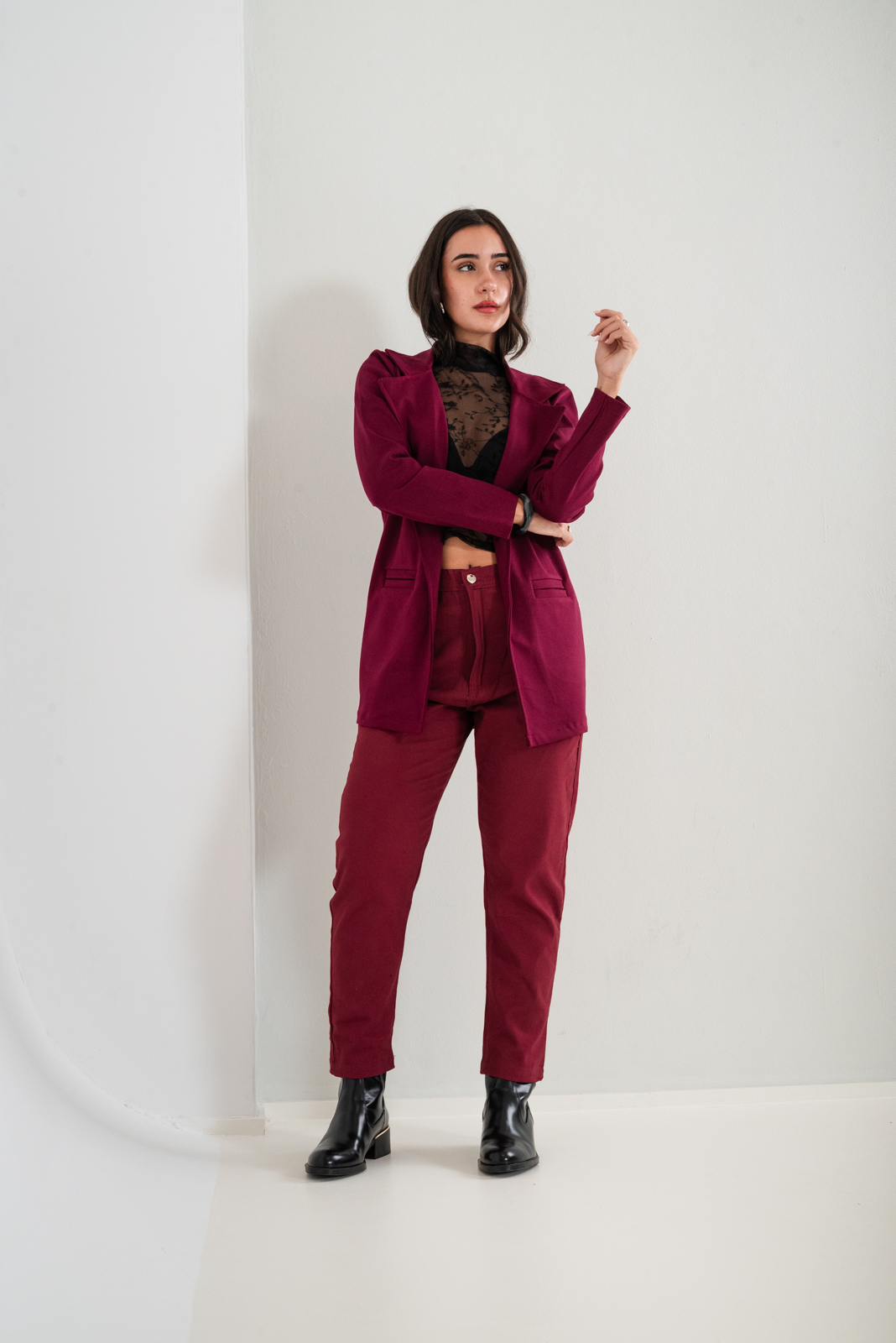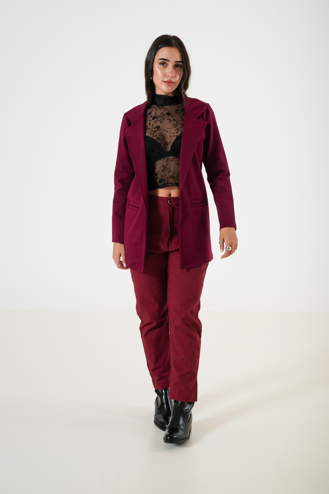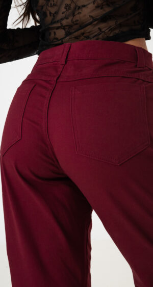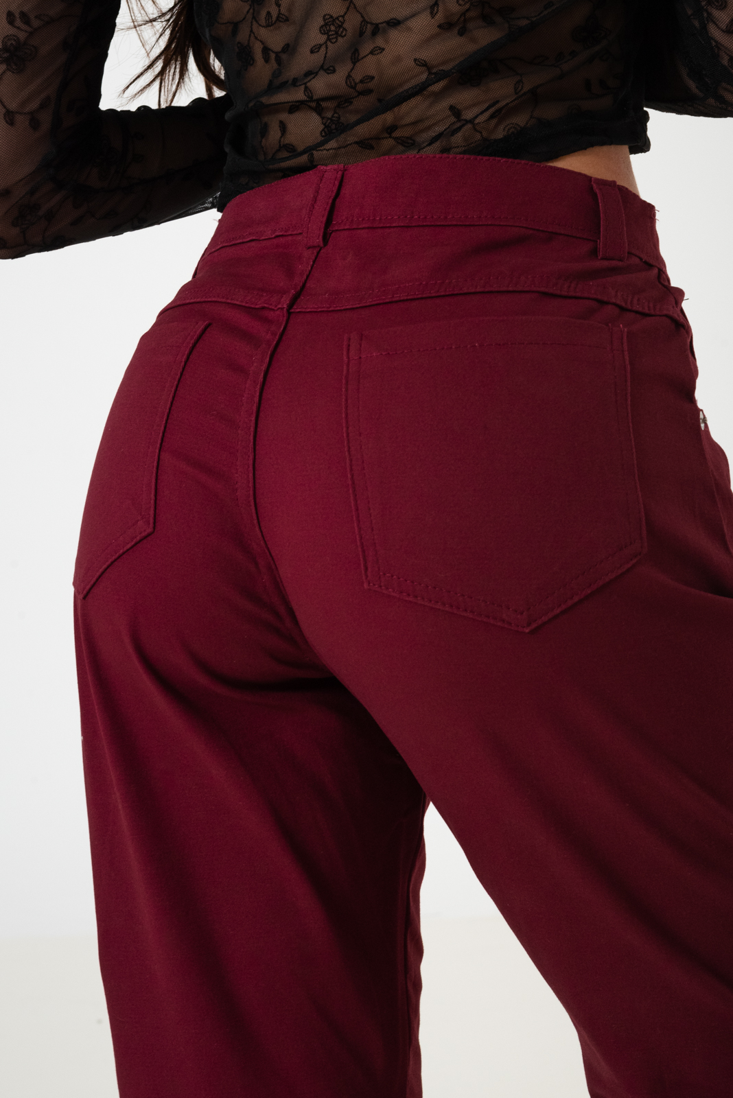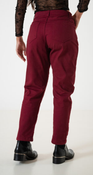 Pantalon estilo mom fit confeccionado en tela de gabardina con detalle de bolsillos, pasacinto, cierre y boton.