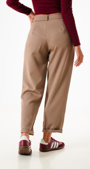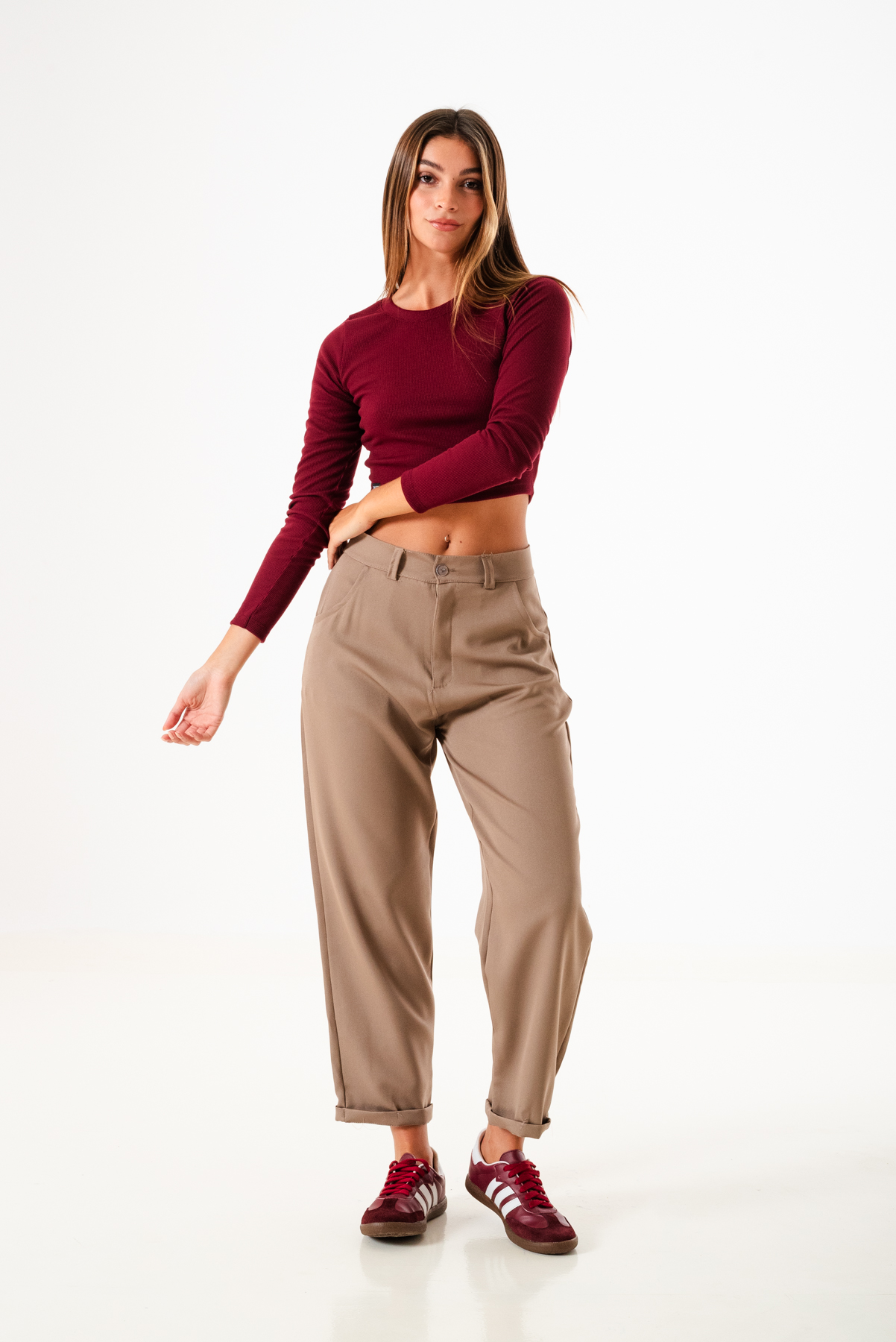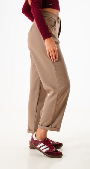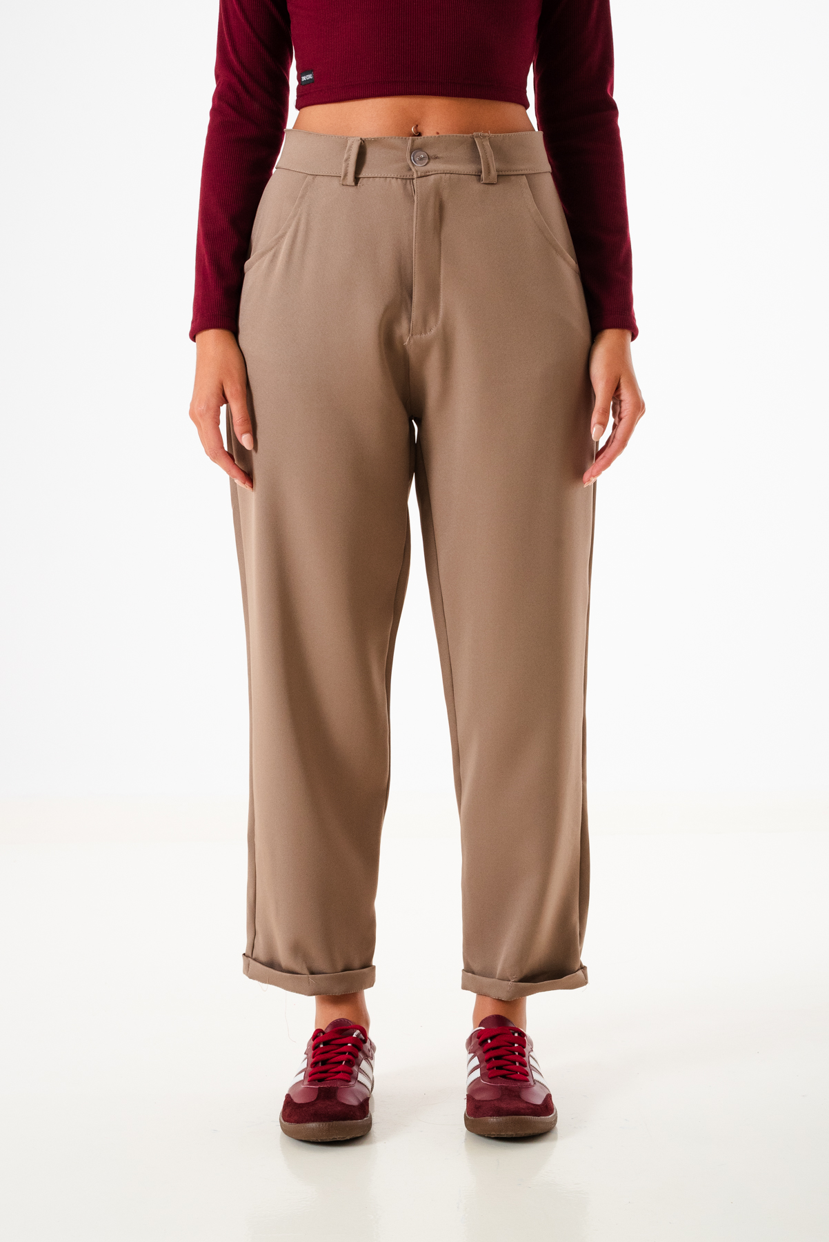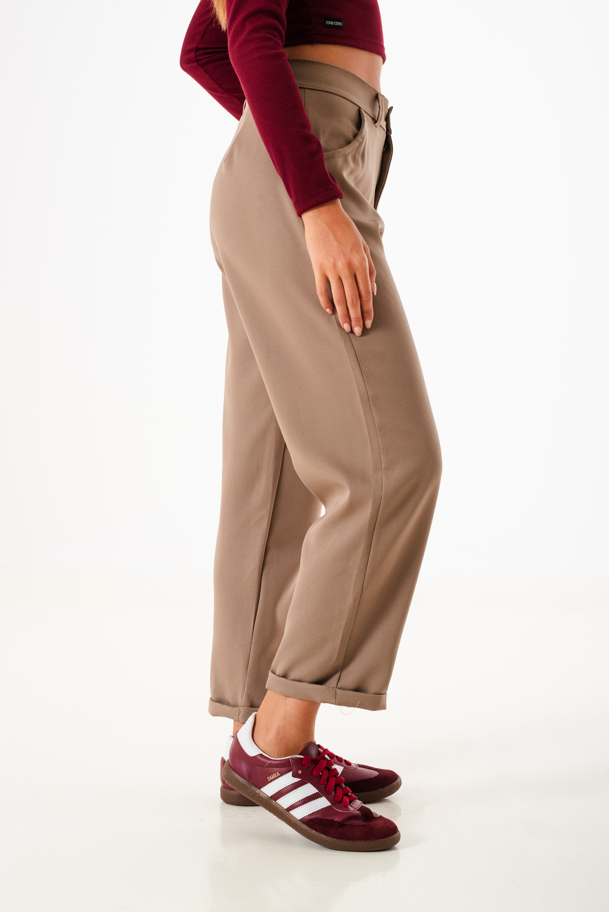 Pantalon estilo mom confeccionado en tela de sastreria con detalle de bolsillos, pasacinto, cierre y boton