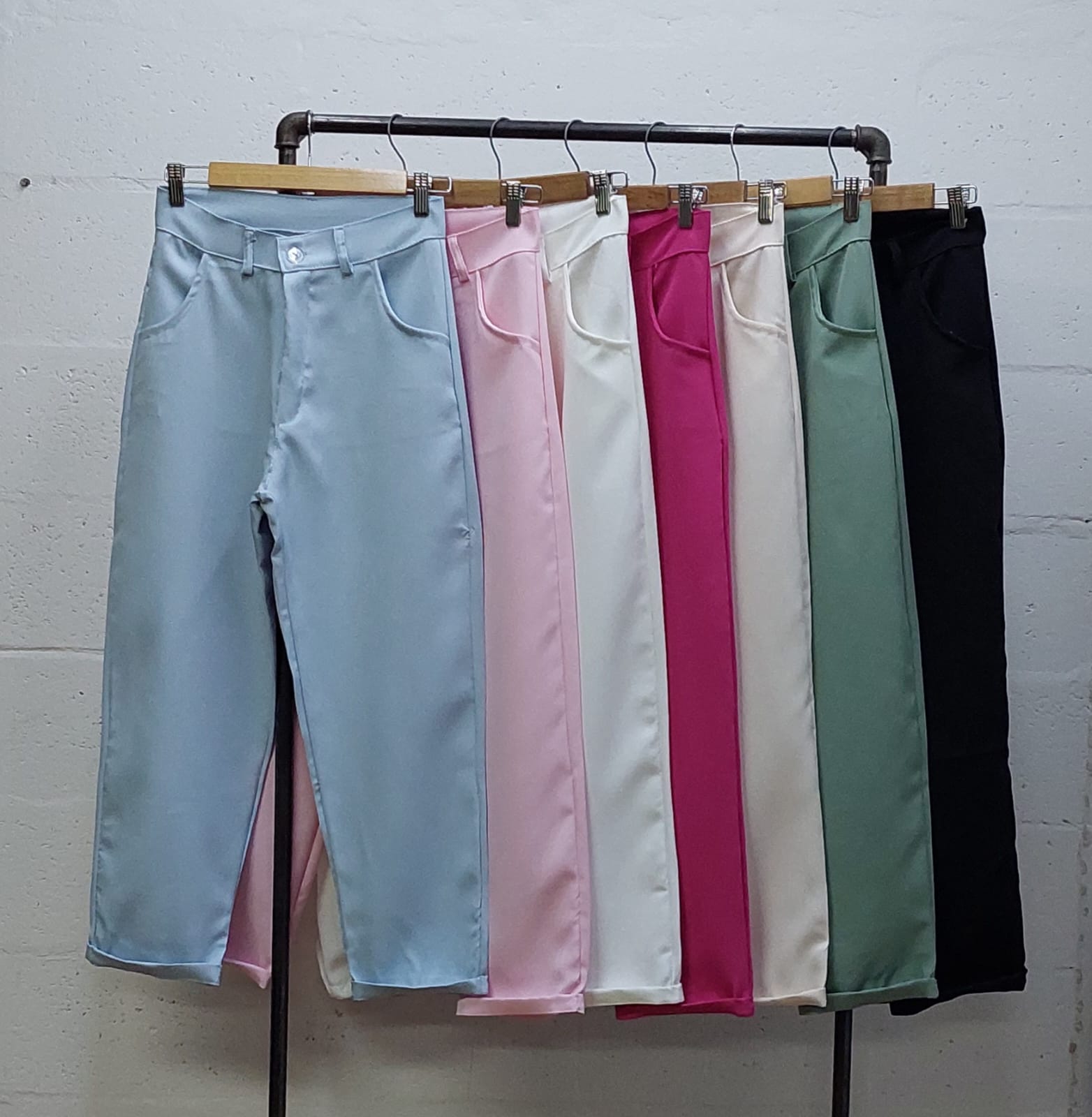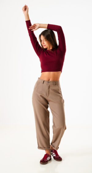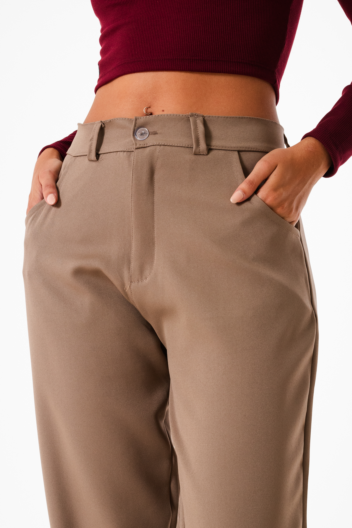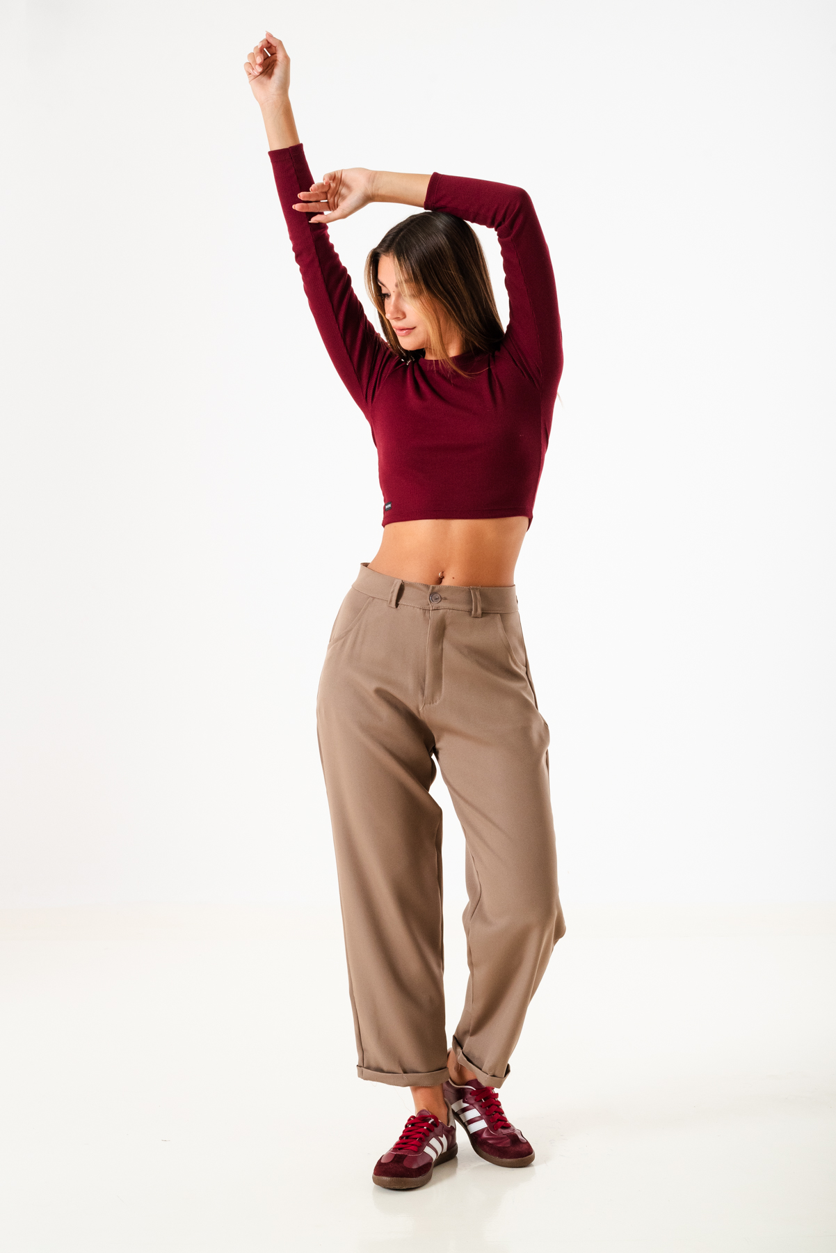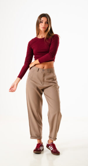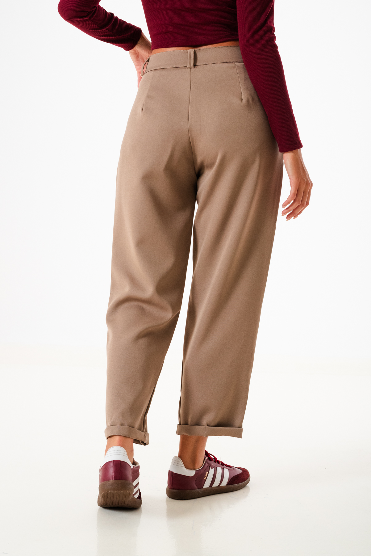 Pantalon estilo mom confeccionado en tela de sastreria con detalle de bolsillos, pasacinto, cierre y boton