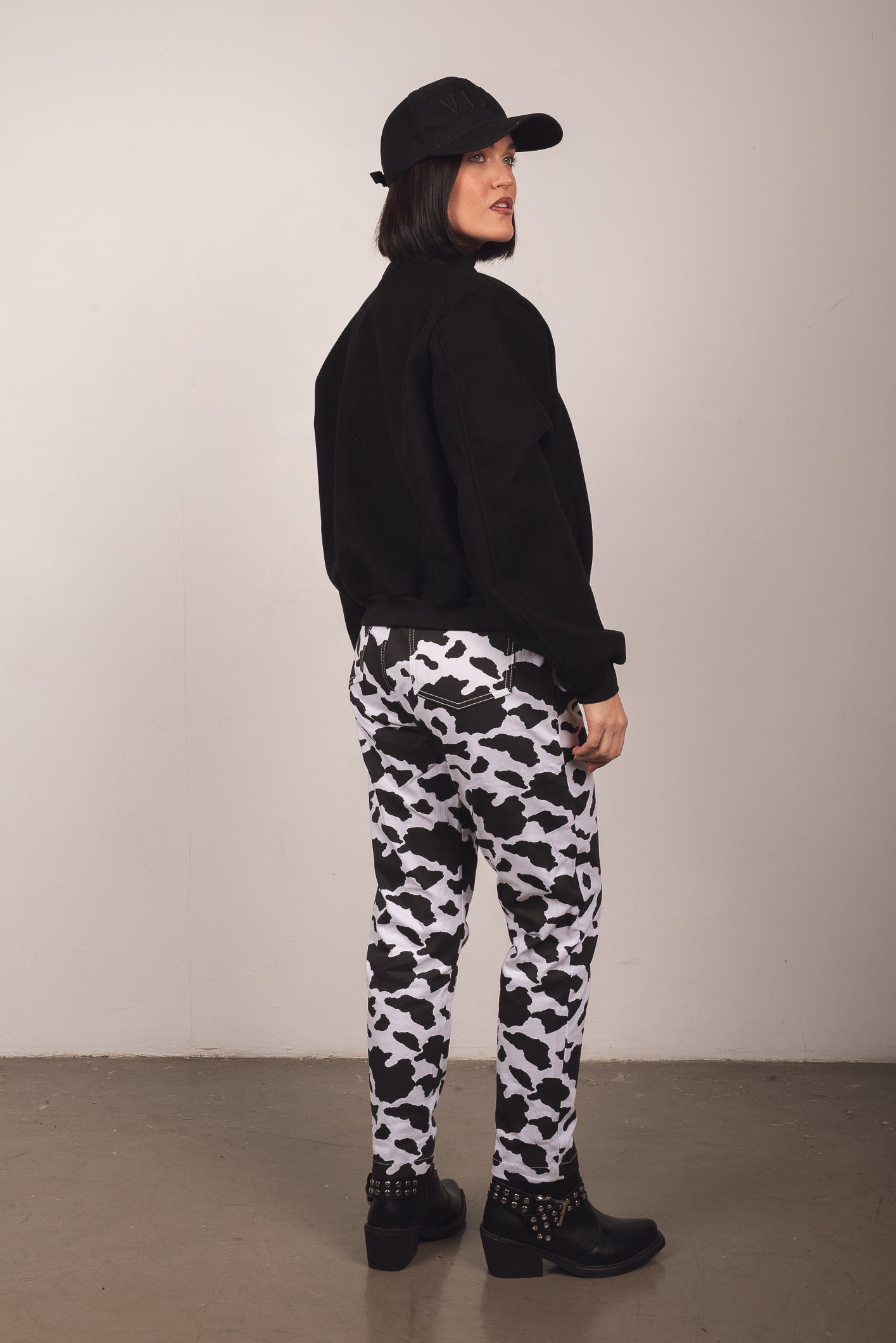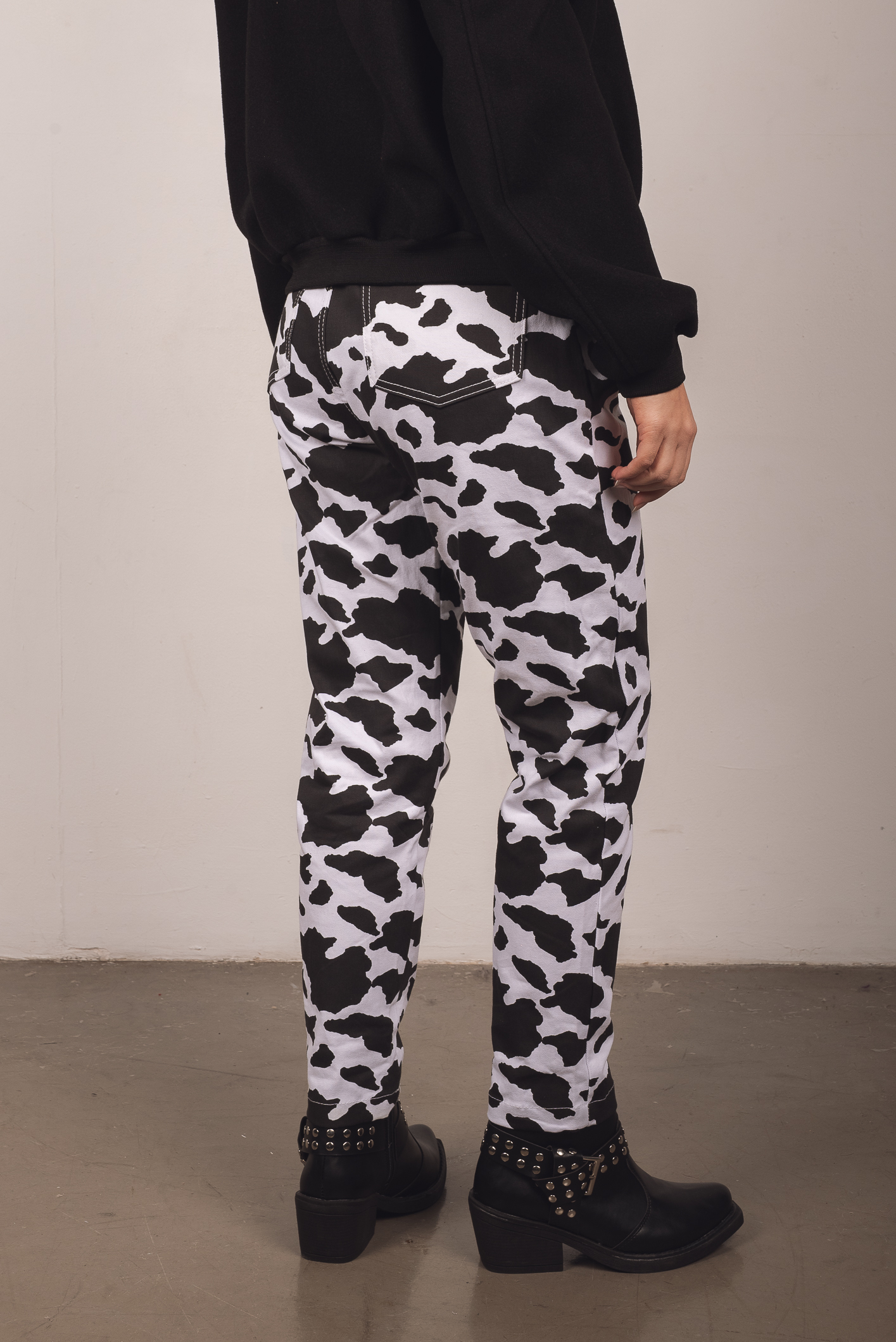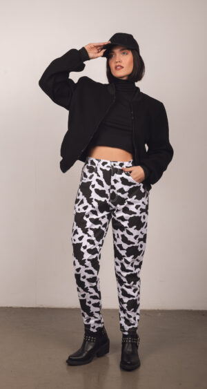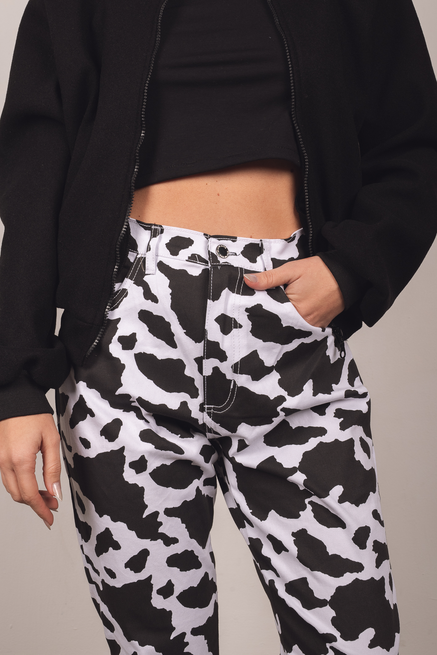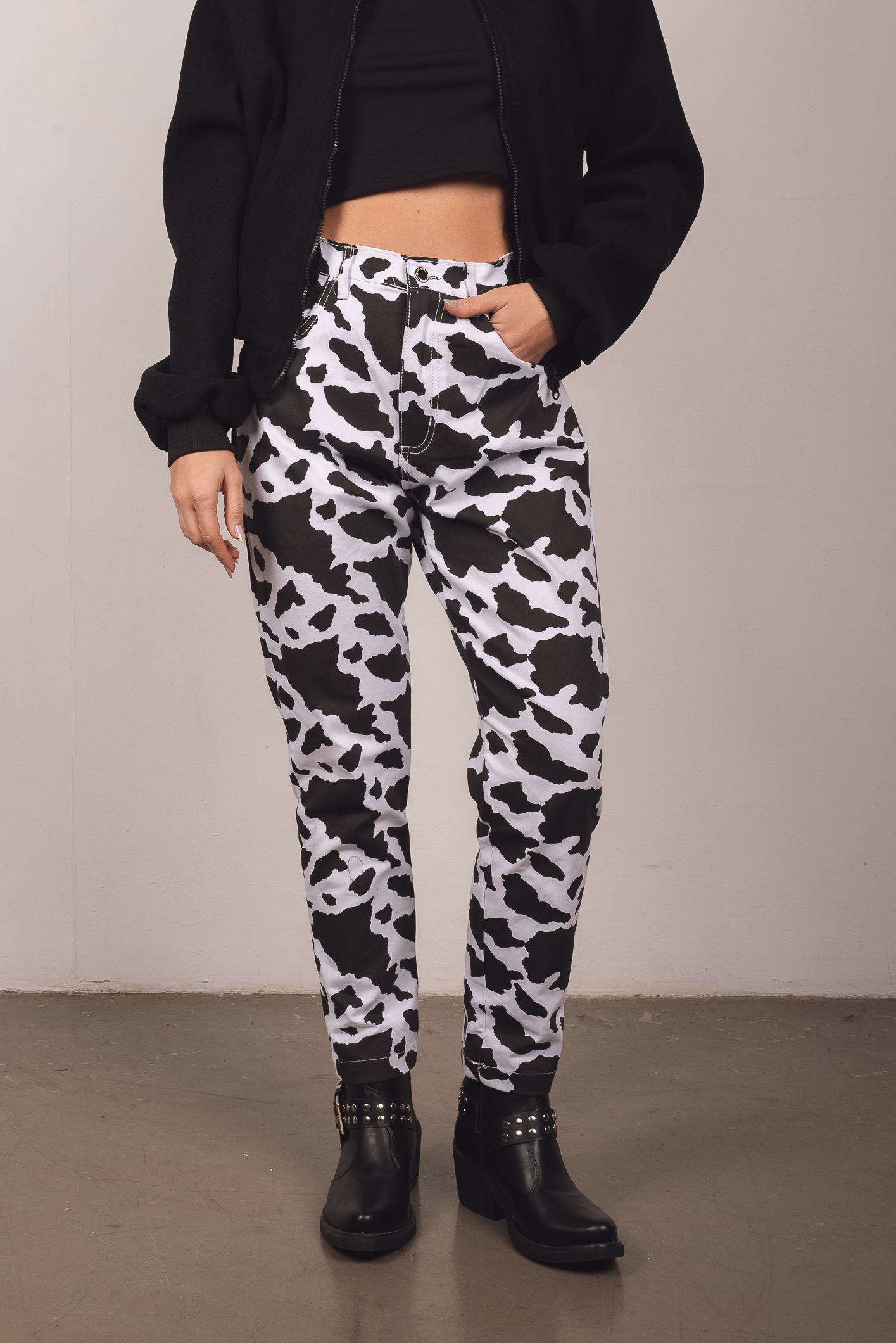 Pantalon estilo mom confeccionado en tela de gabardina estampado print/vaca con detalle de bolsillos, pasacinto, cierre y boton