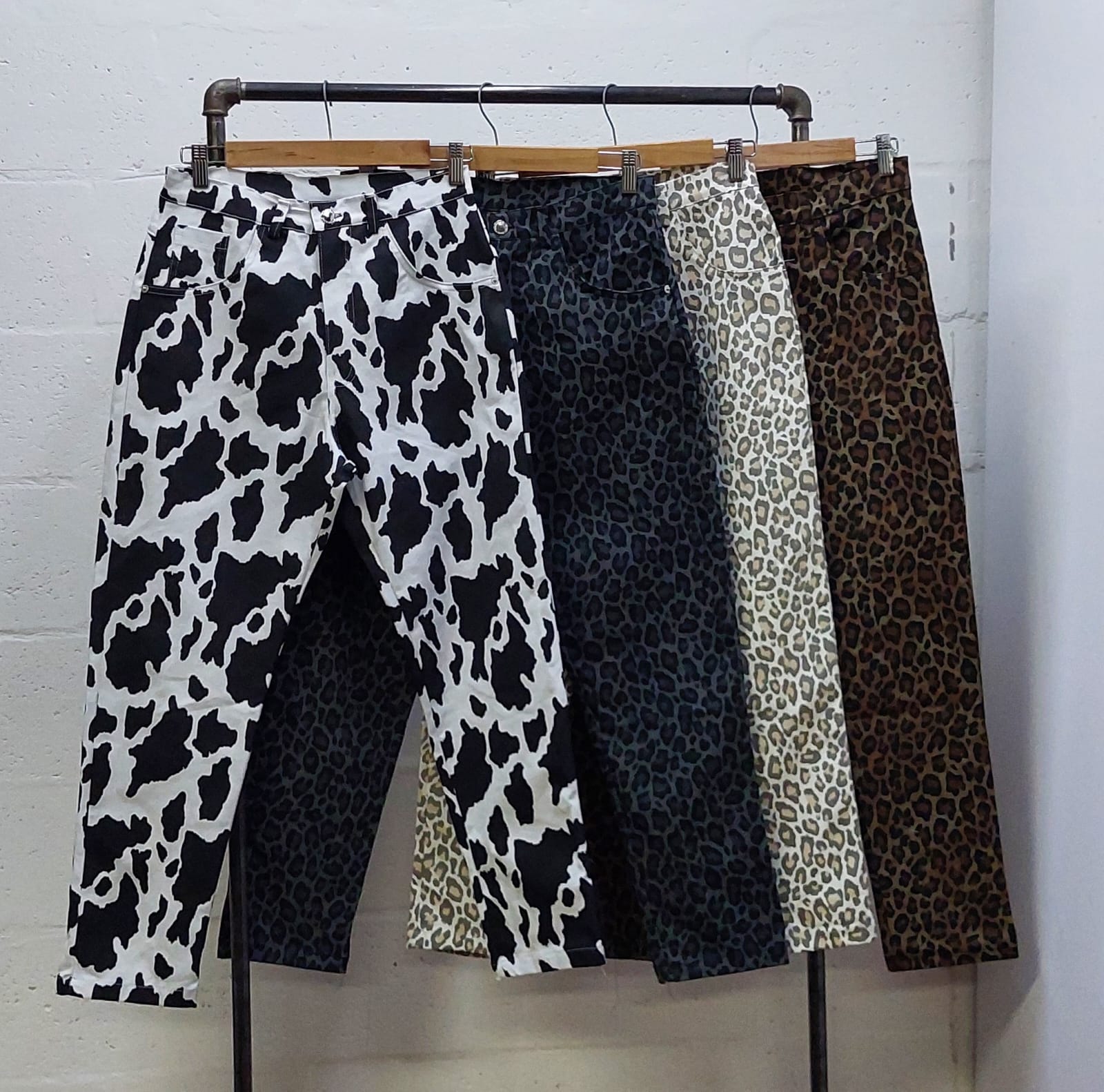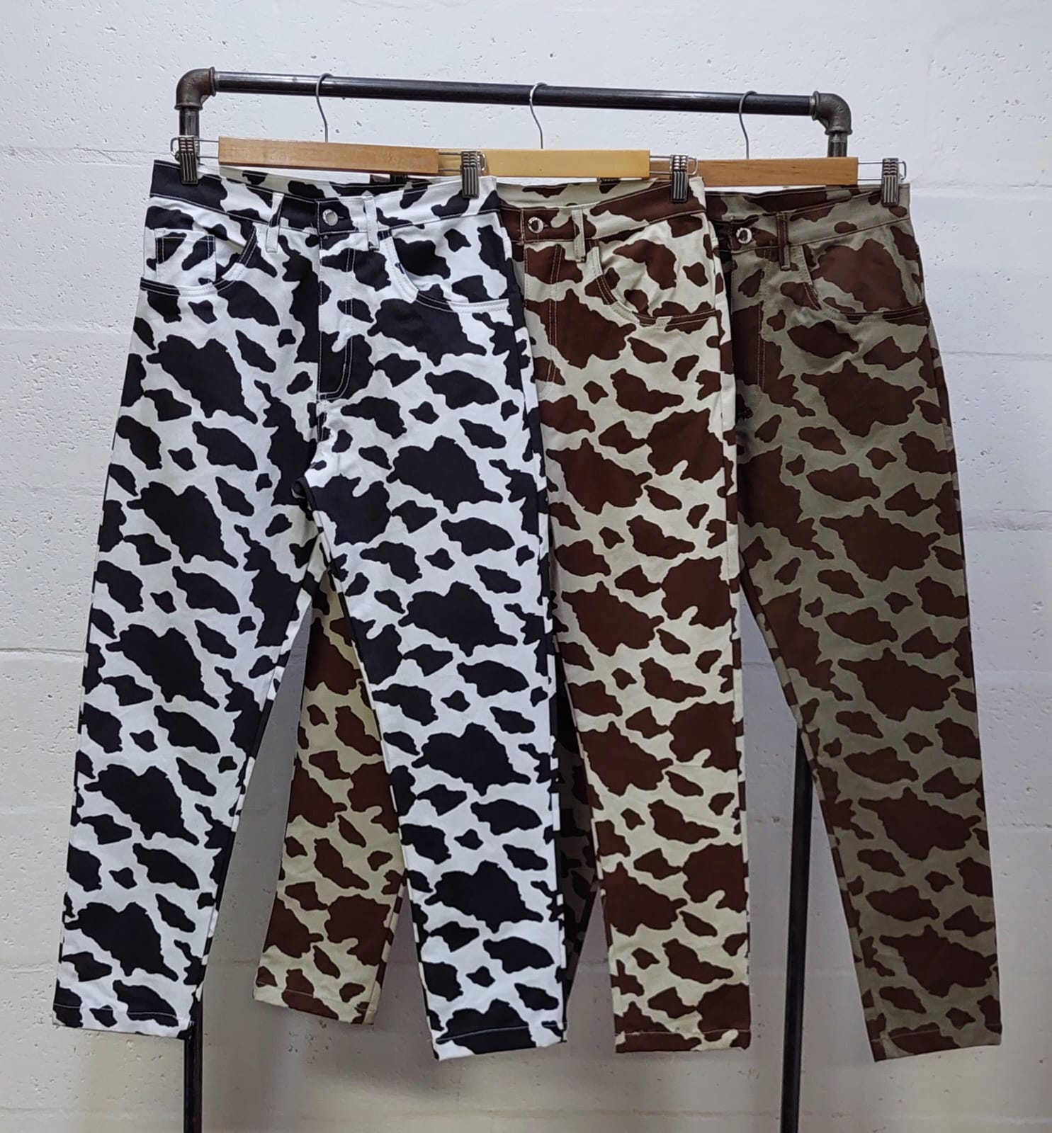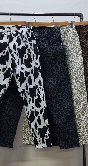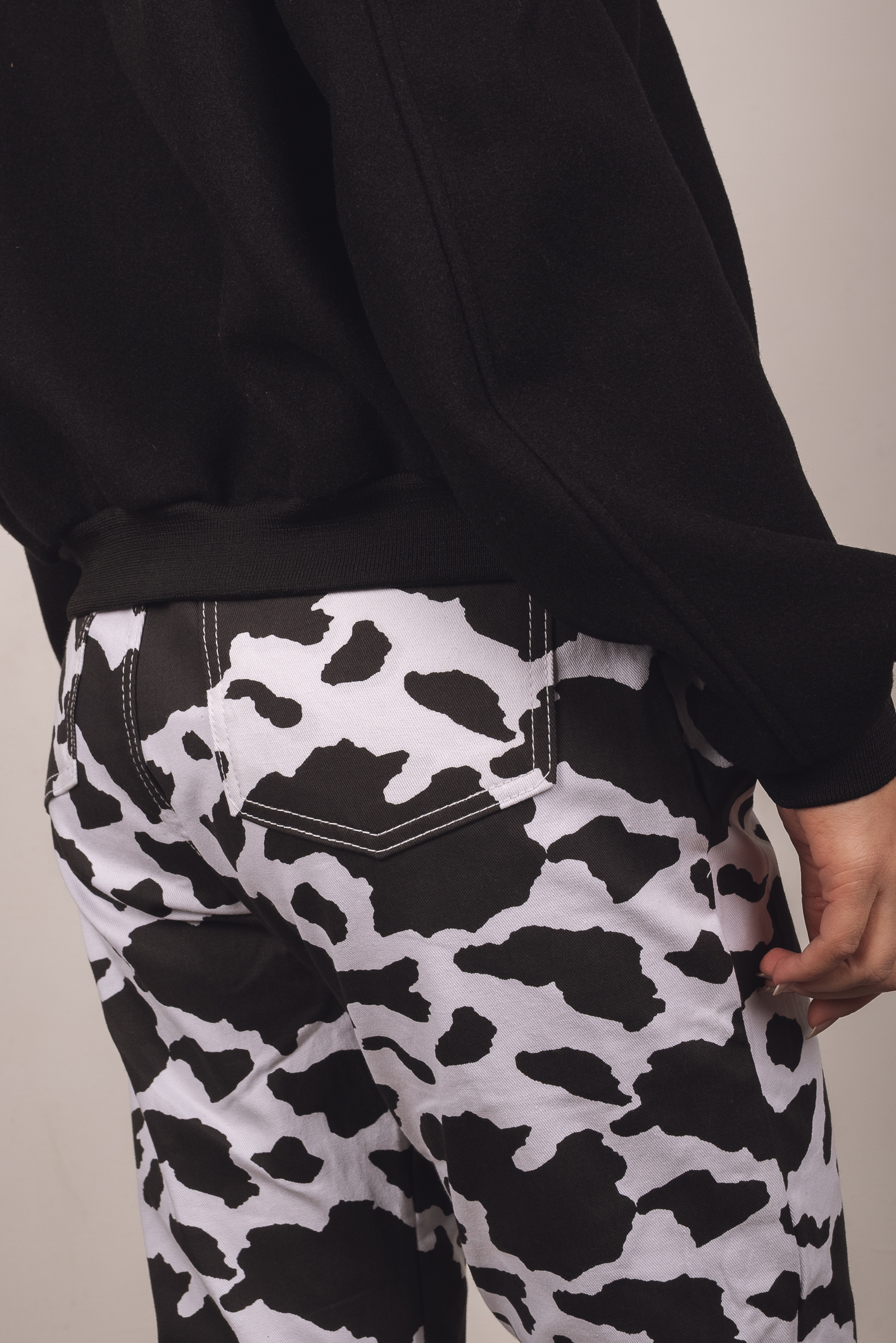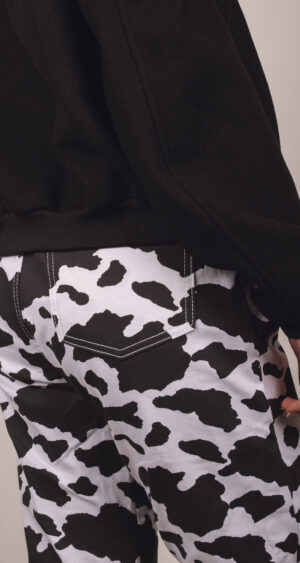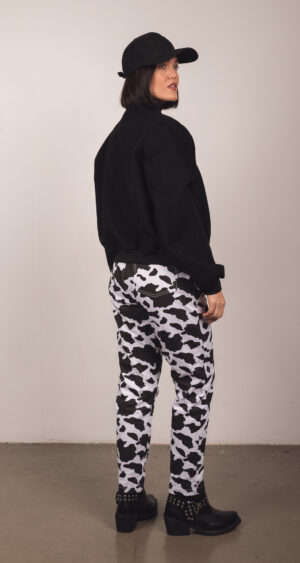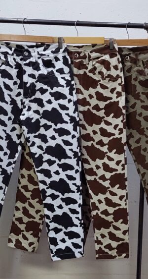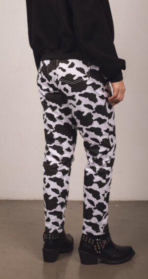 Pantalon estilo mom confeccionado en tela de gabardina estampado print/vaca con detalle de bolsillos, pasacinto, cierre y boton