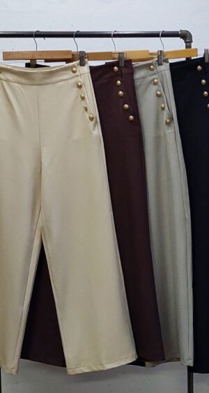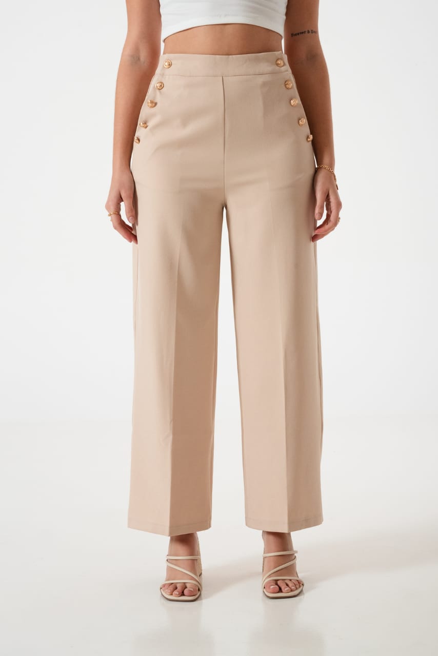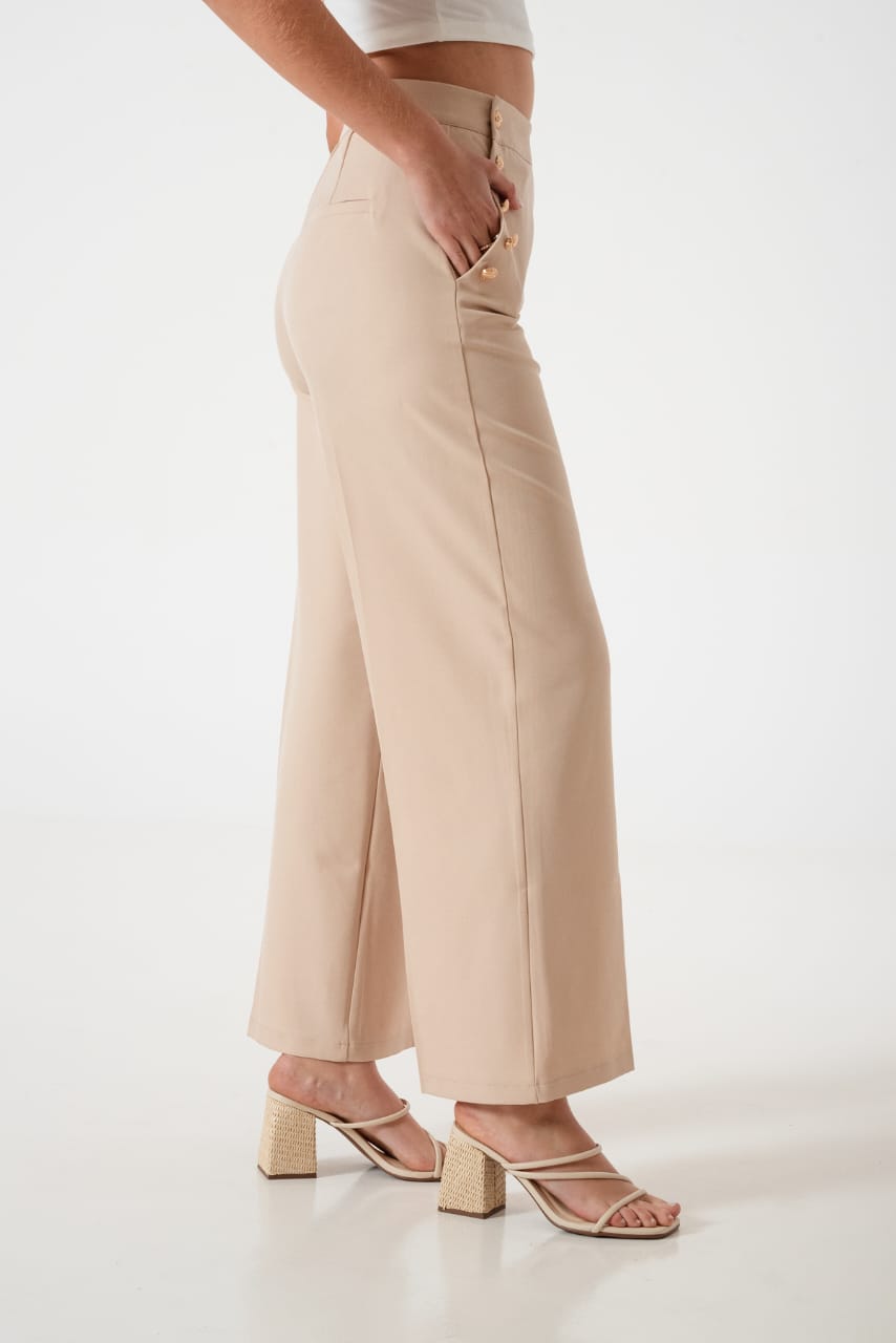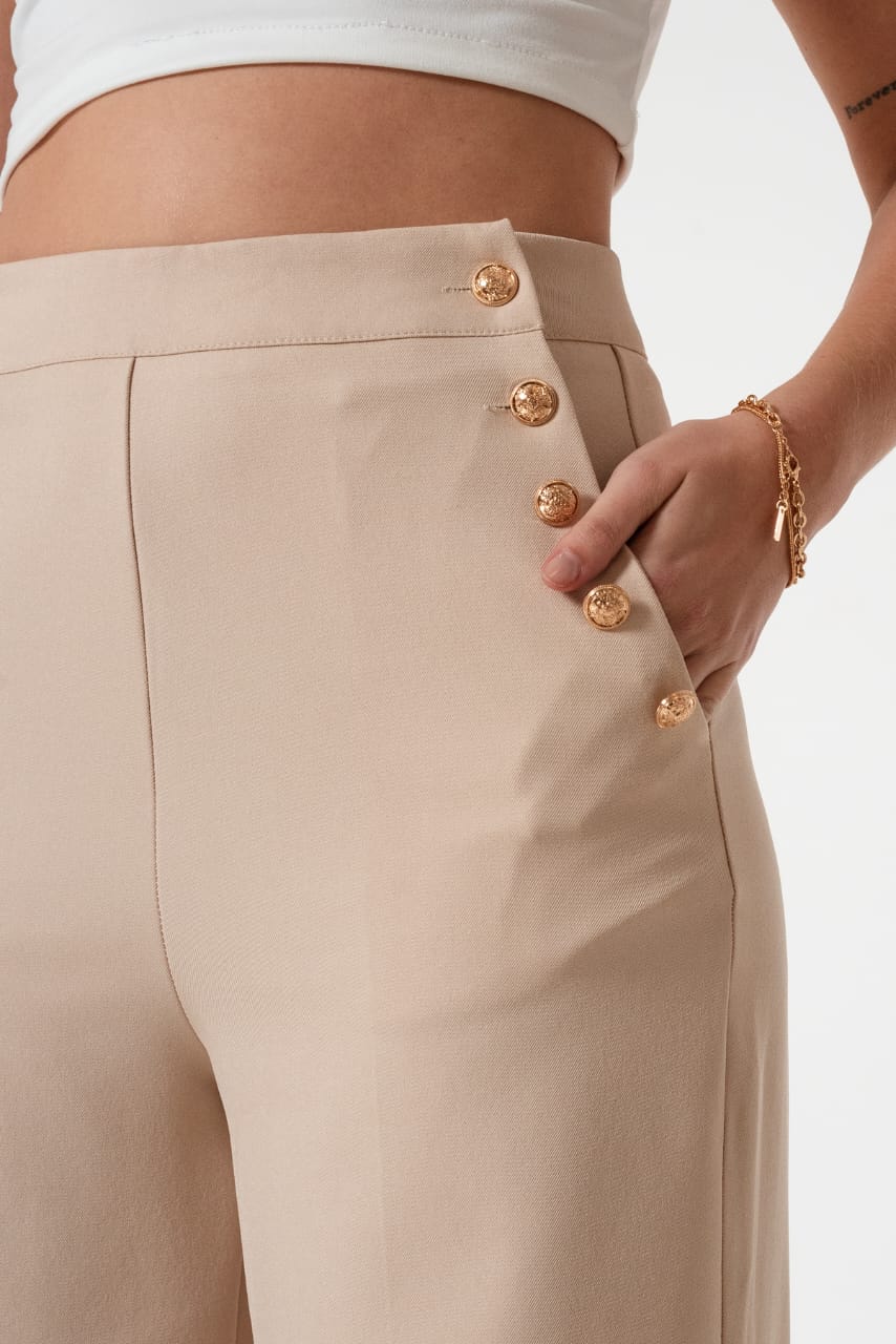 Pantalon estilo palazo confeccionado en tela de sastreria con bolsillos y botones