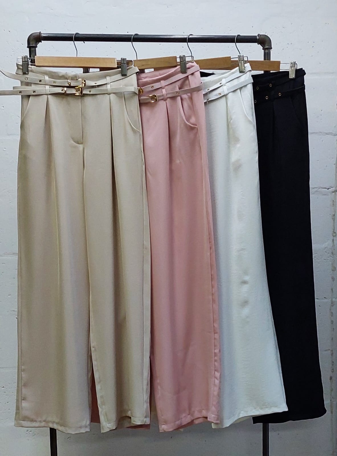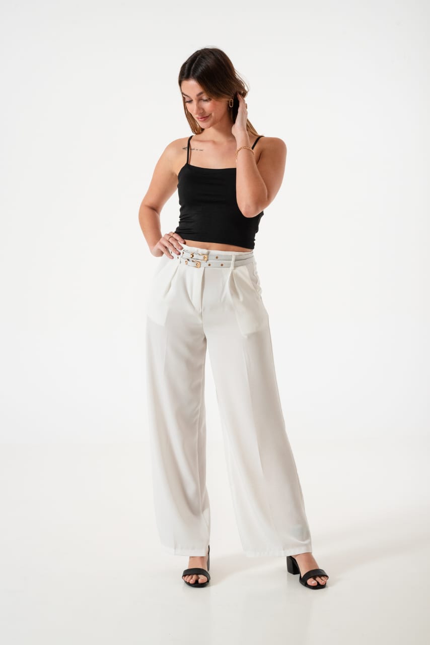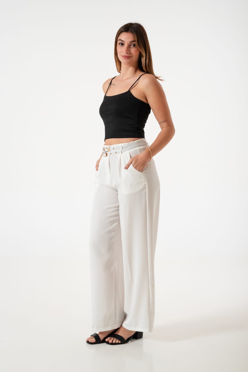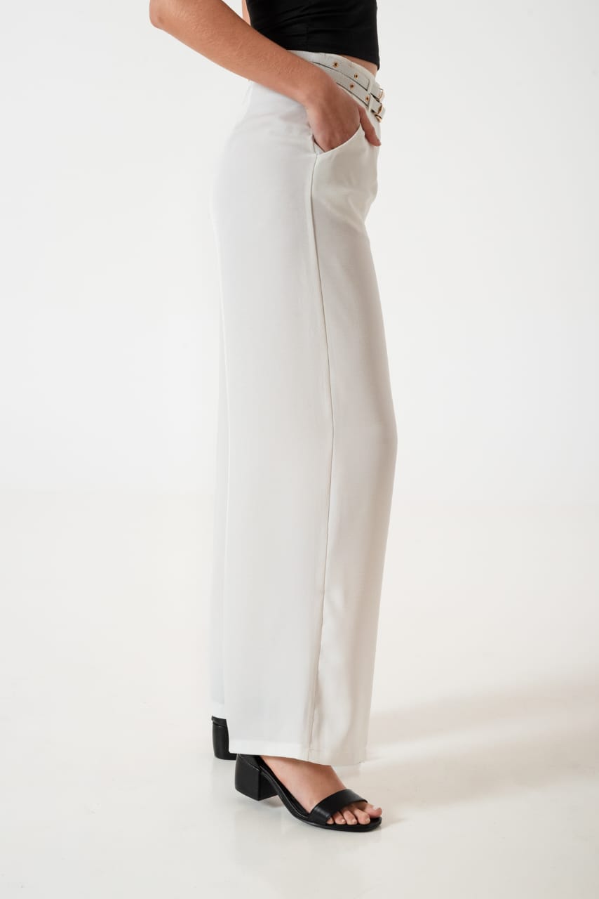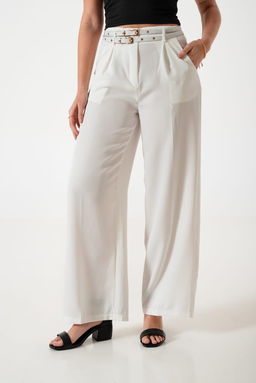 Pantalon estilo palazo confeccionado en tela de sastreria con detalle de doble cinto
