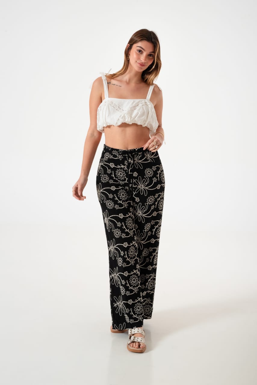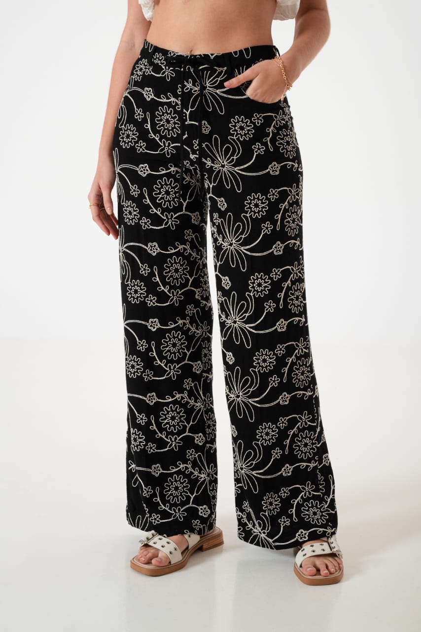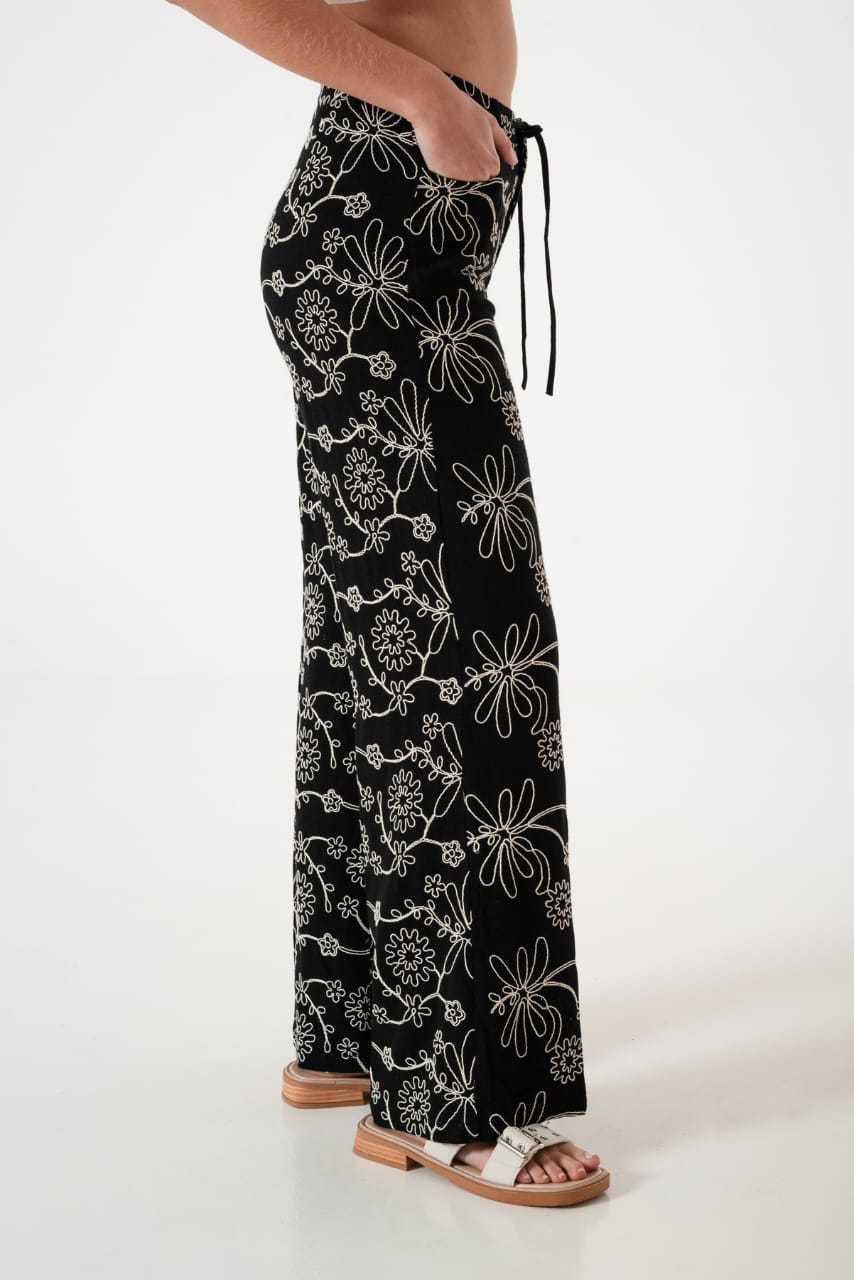 Pantalon estilo palazo confeccionado en tela de lino con detalle de bordados
