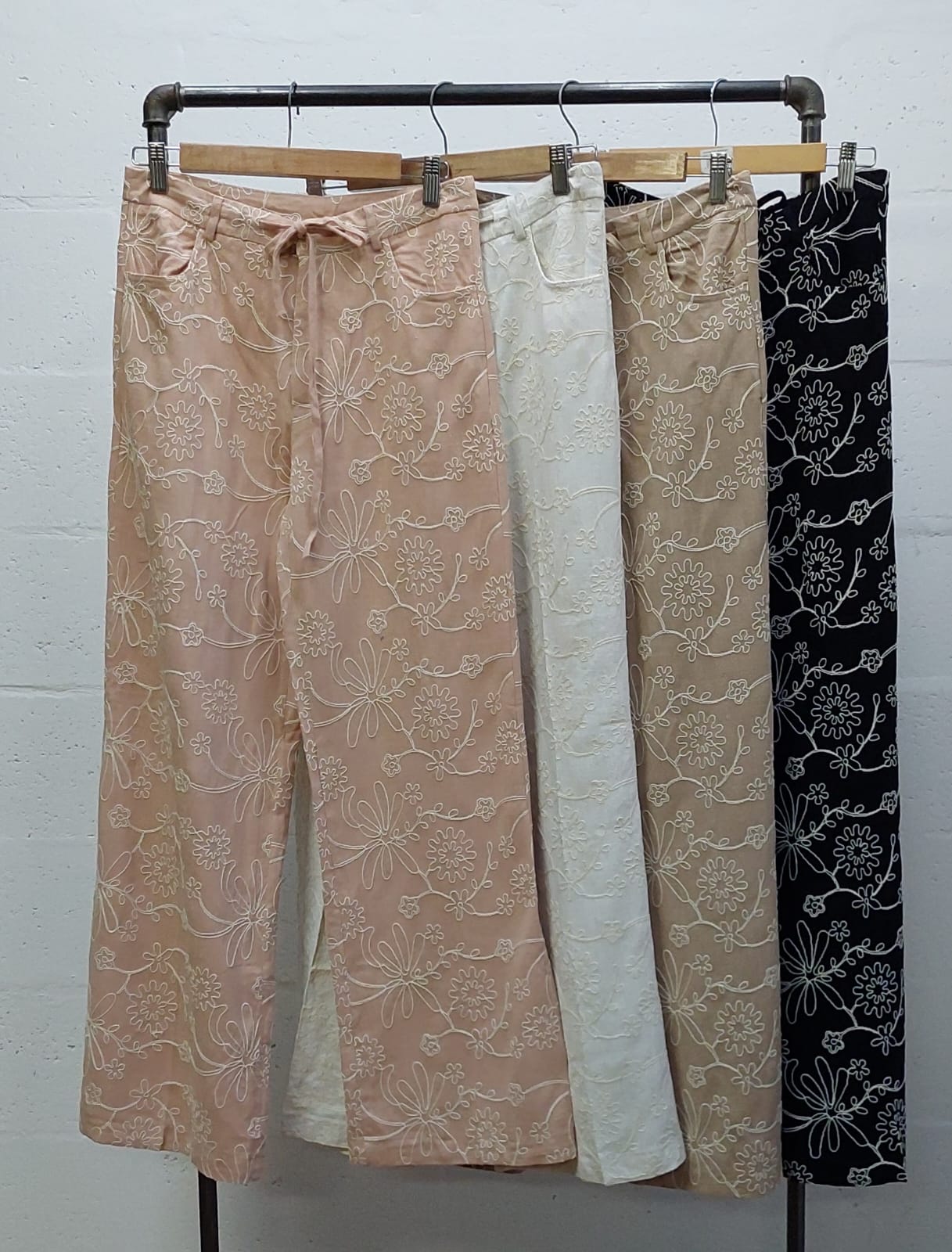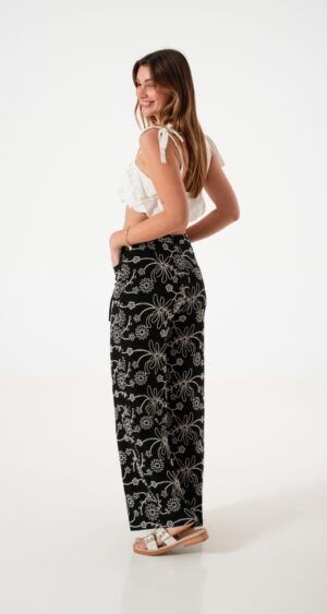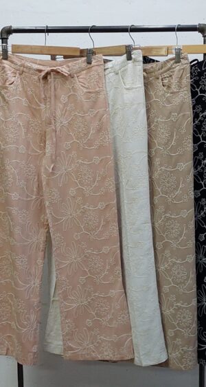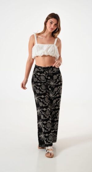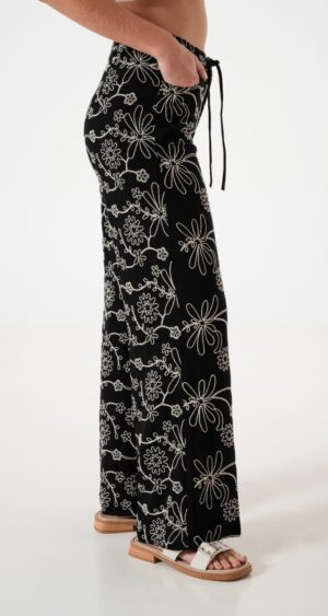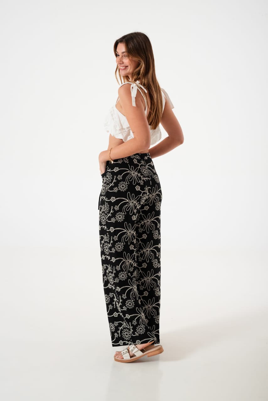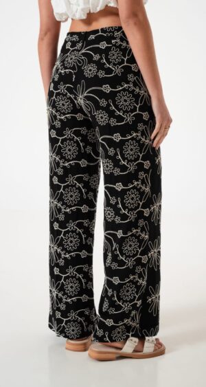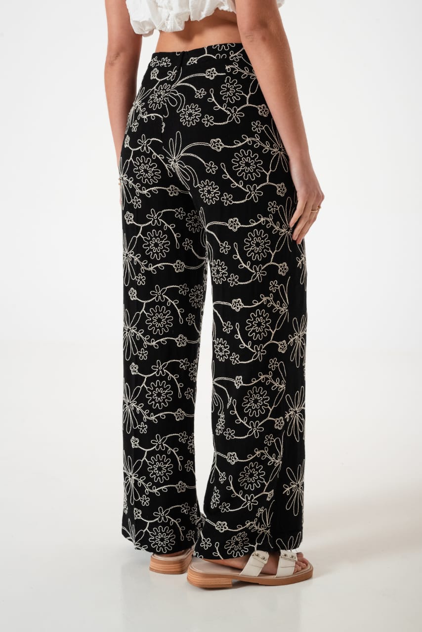 Pantalon estilo palazo confeccionado en tela de lino con detalle de bordados