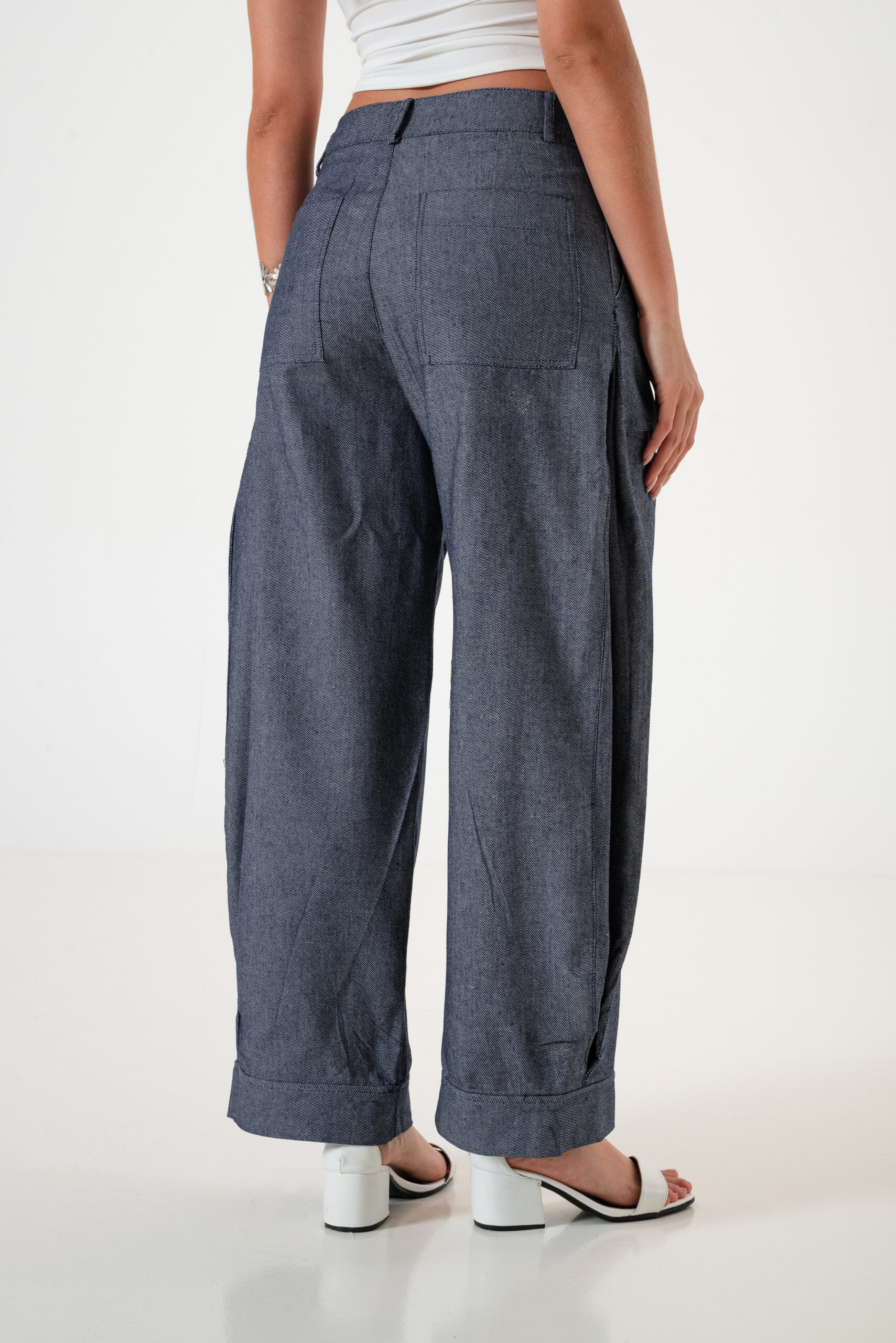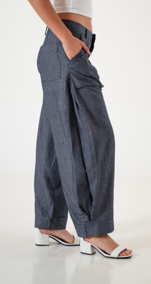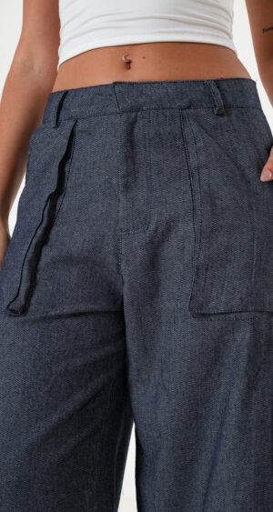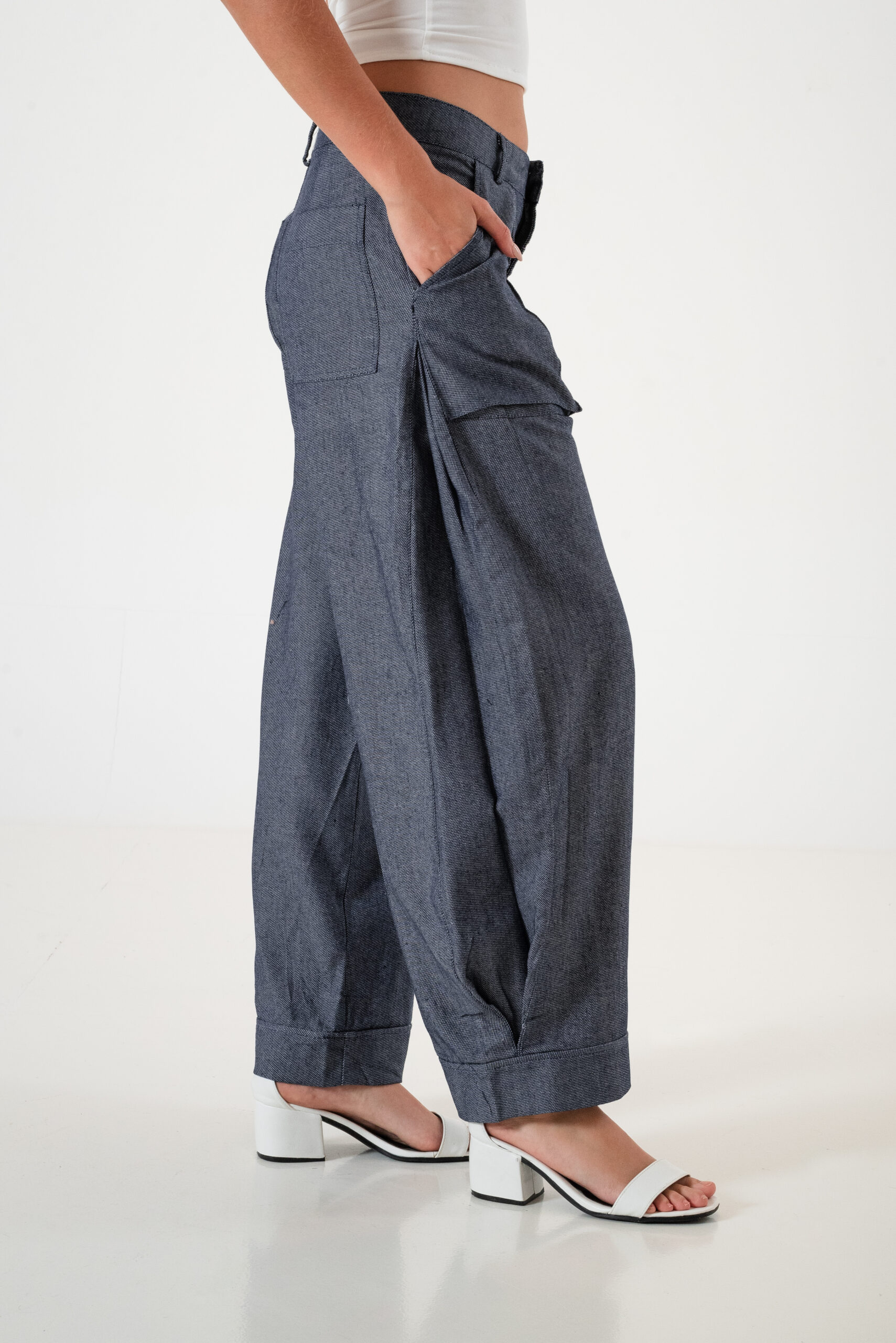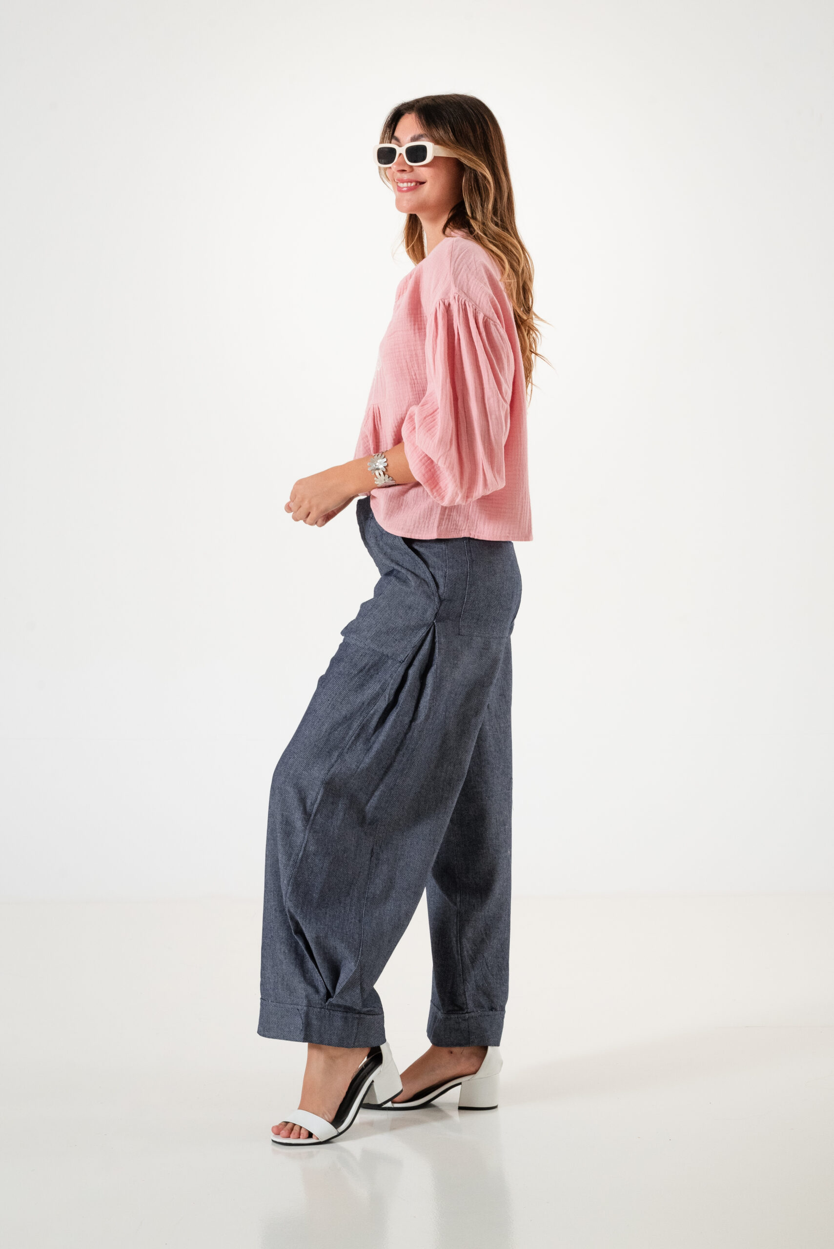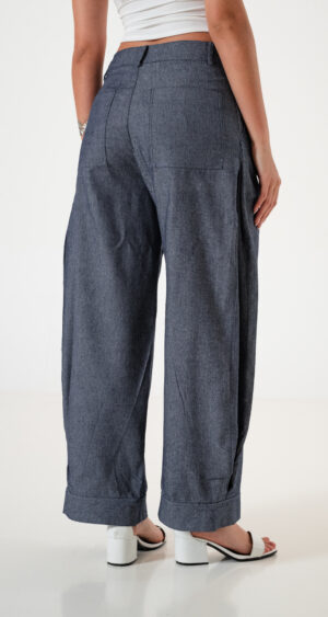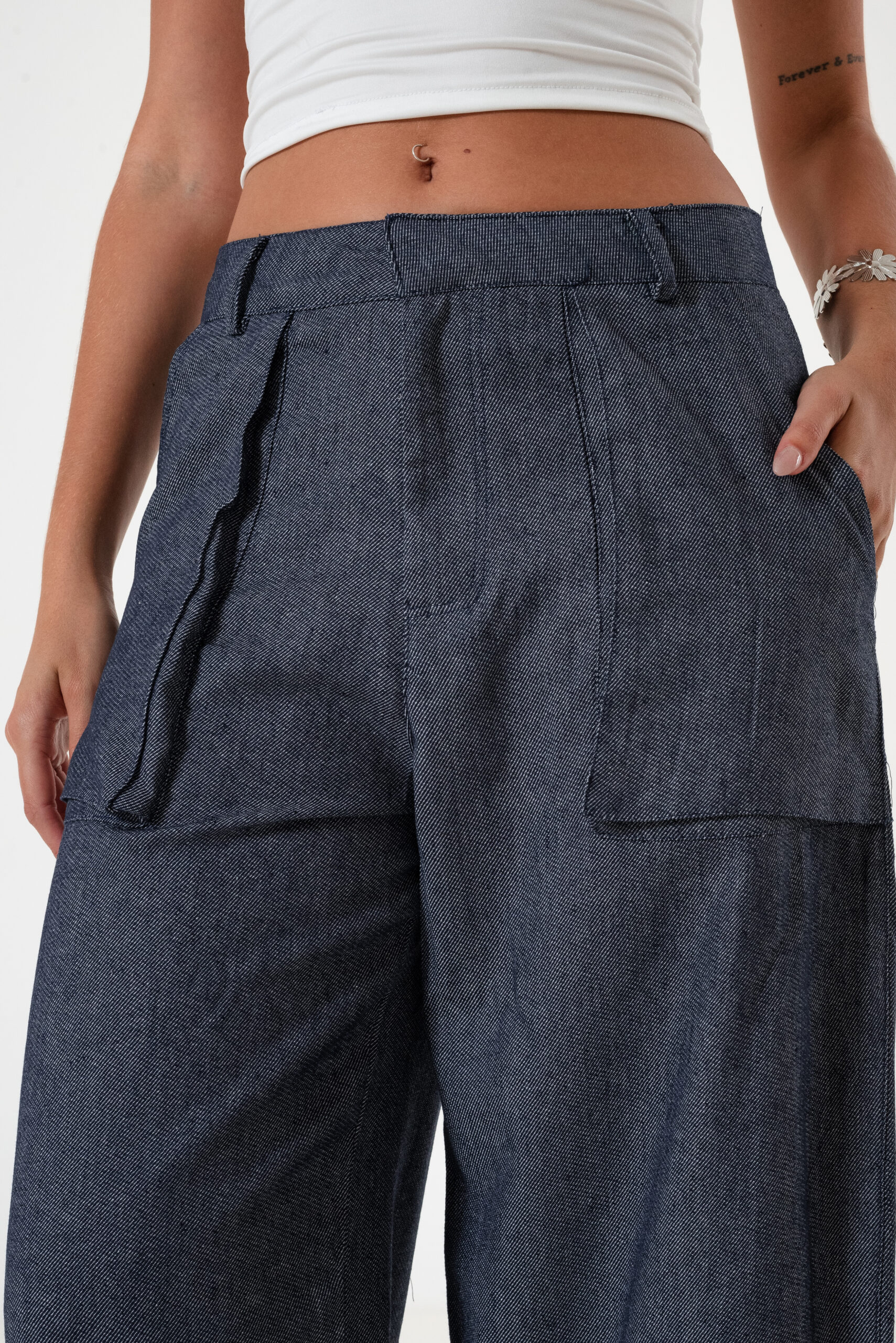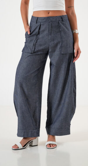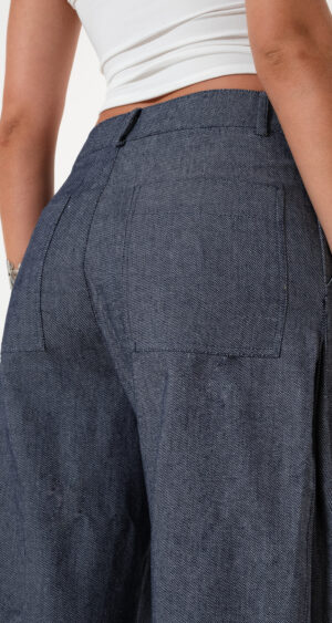 Pantalon estilo palazo baloom confeccionado en tela de lino jean con detalle de bolsillos