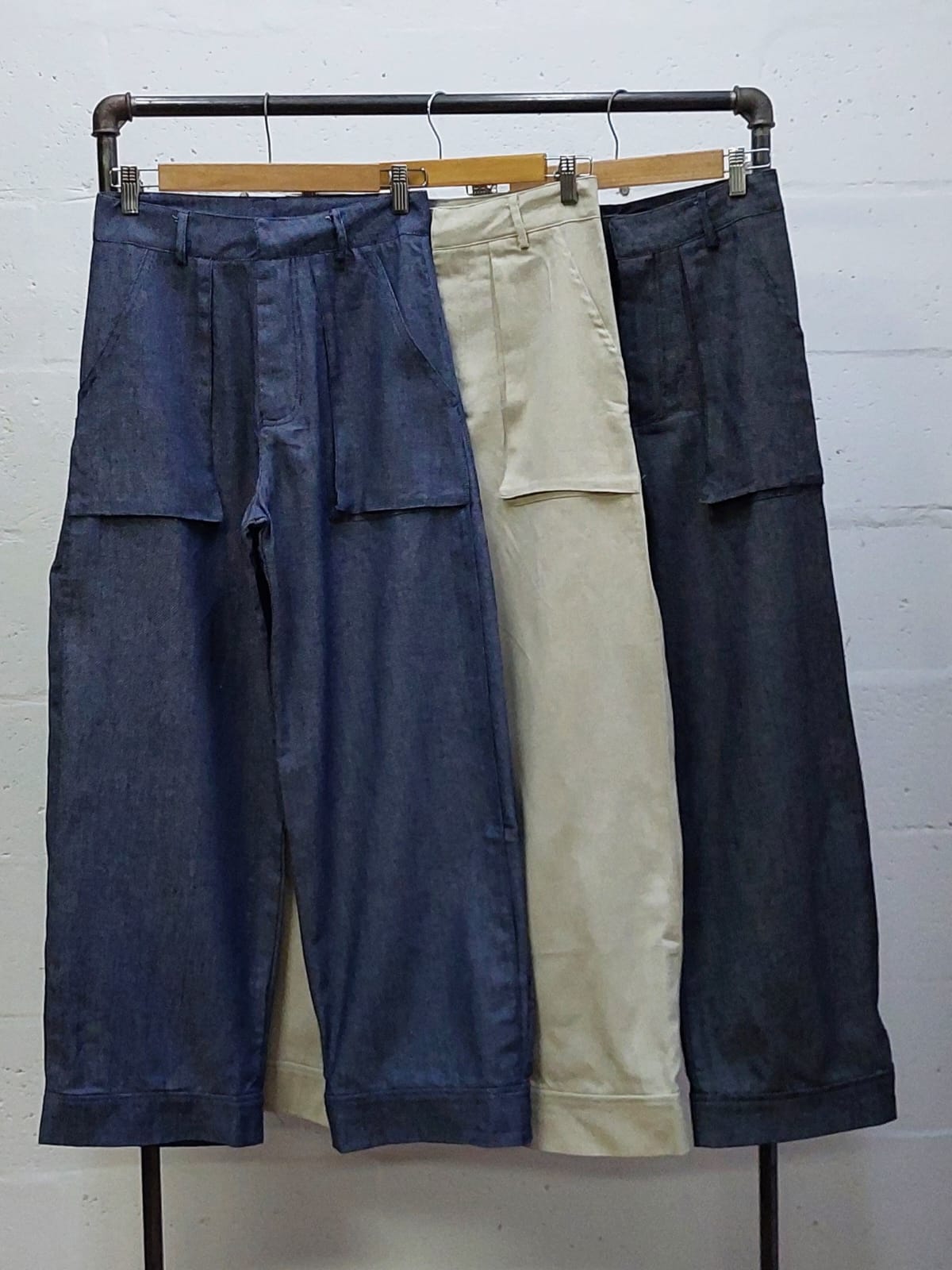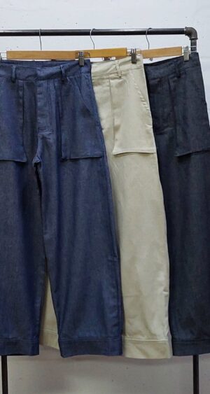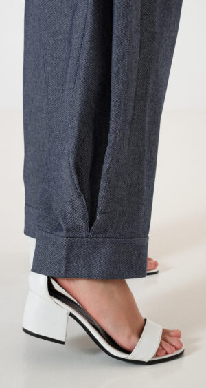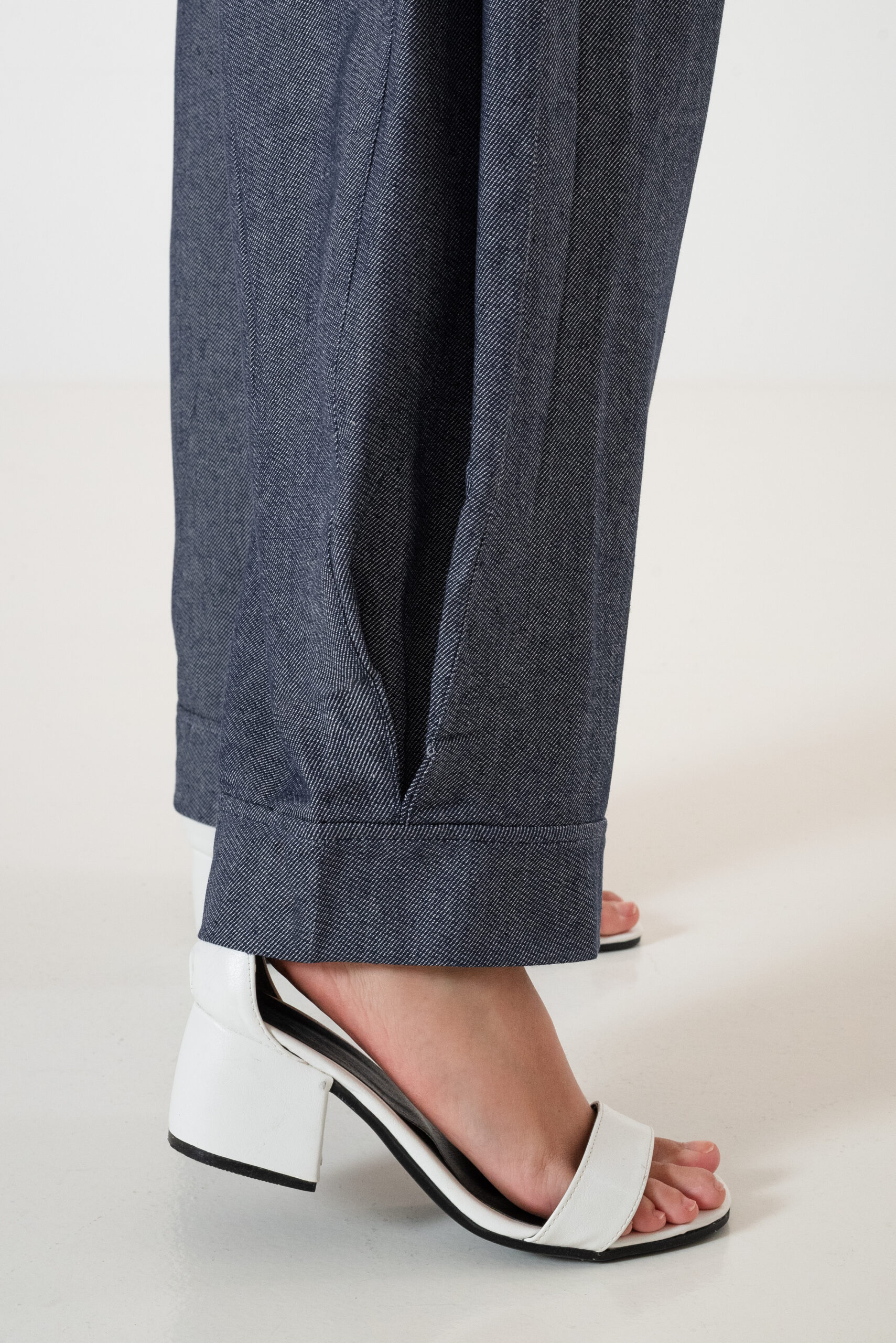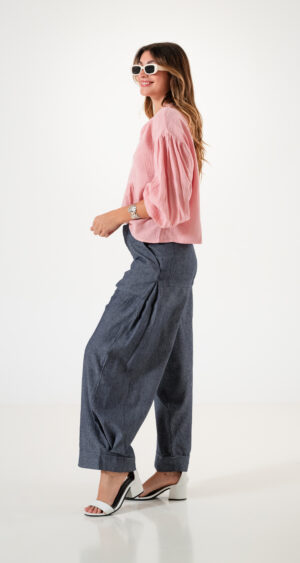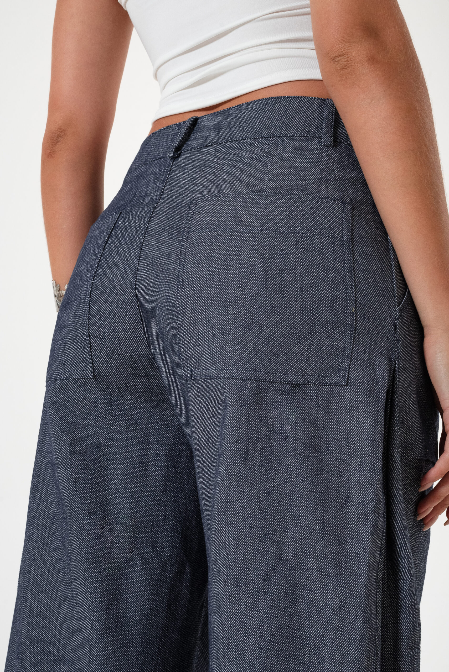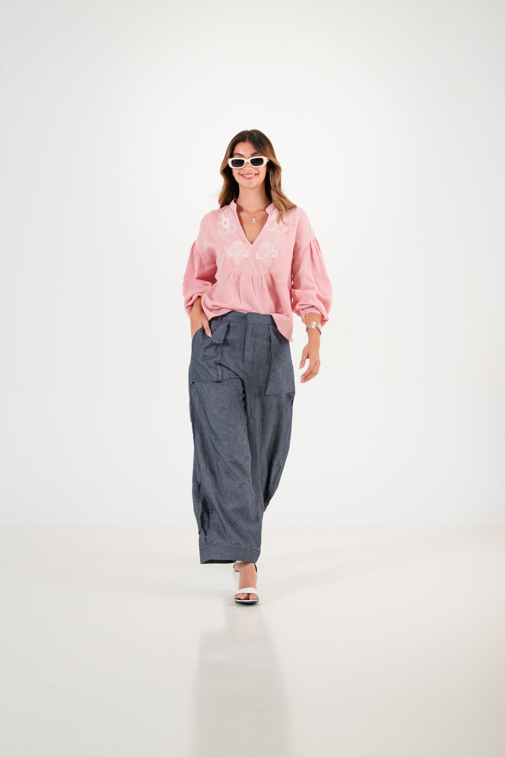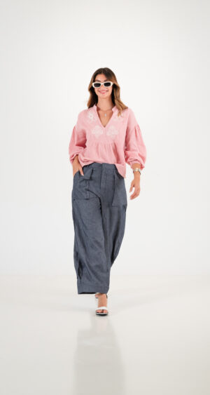 Pantalon estilo palazo baloom confeccionado en tela de lino jean con detalle de bolsillos
