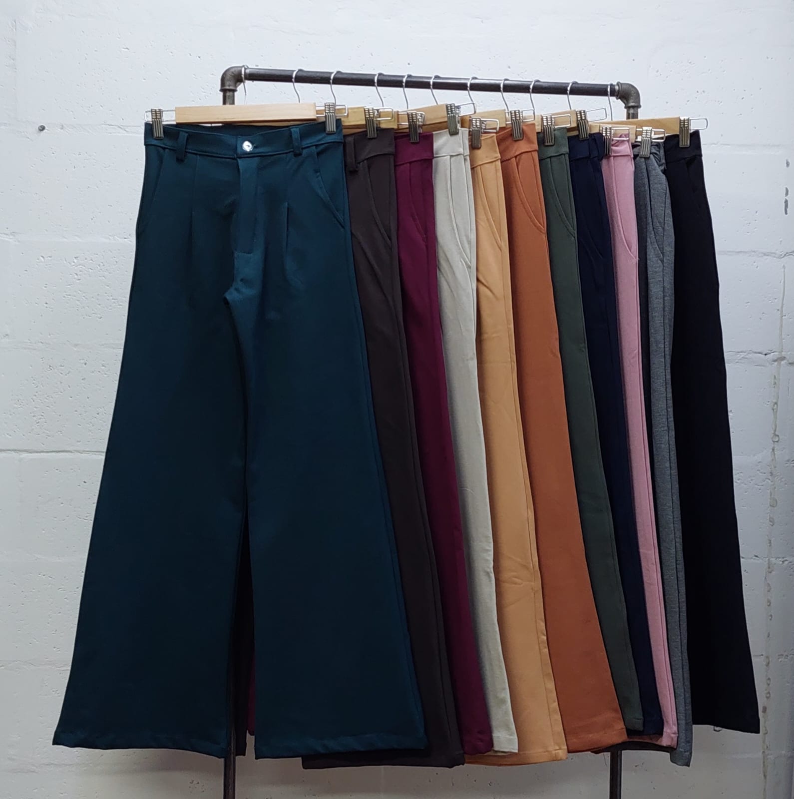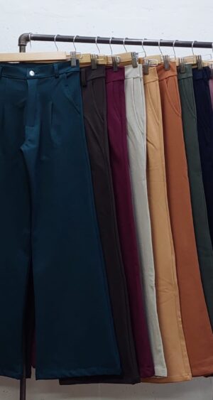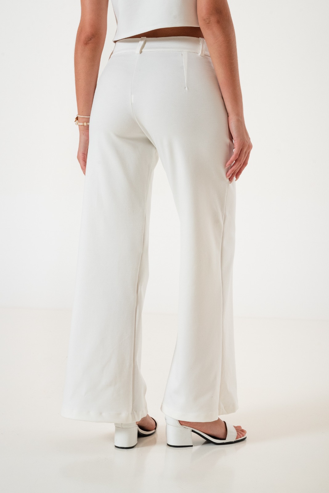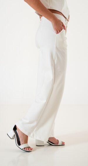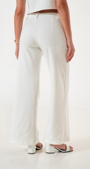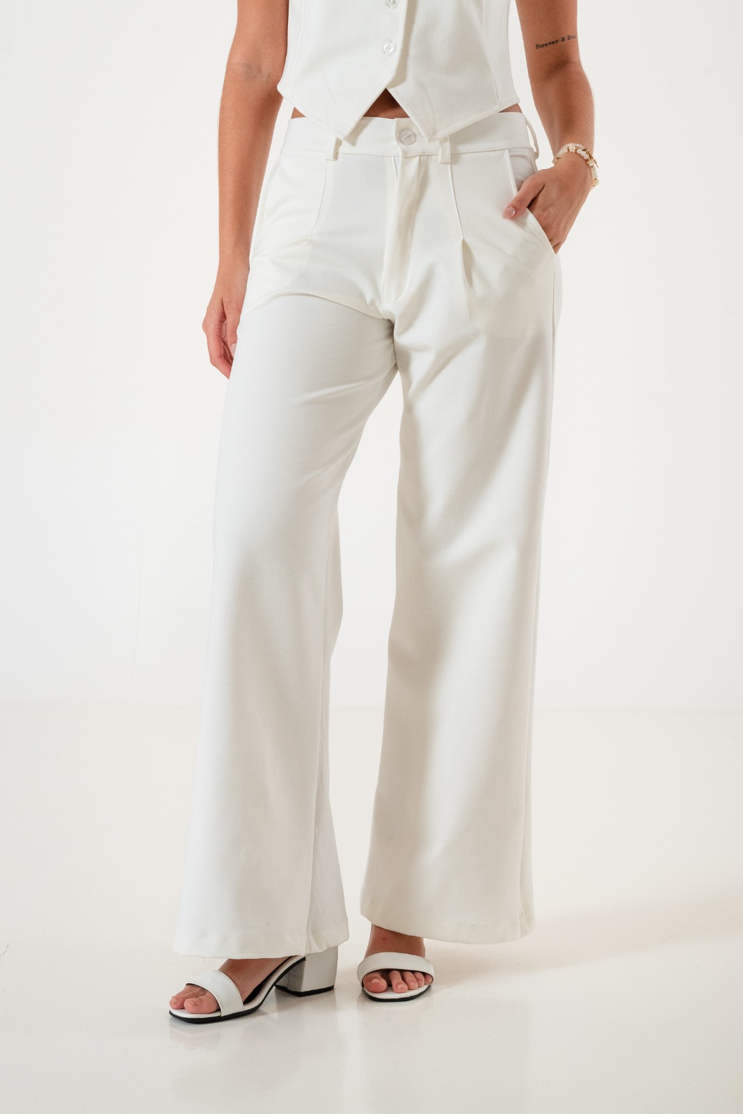 Pantalon estilo palazo confeccionado en tela de punto roma con detalle de pinzas delanteras, bolsillos, pasacinto, cierre y boton.