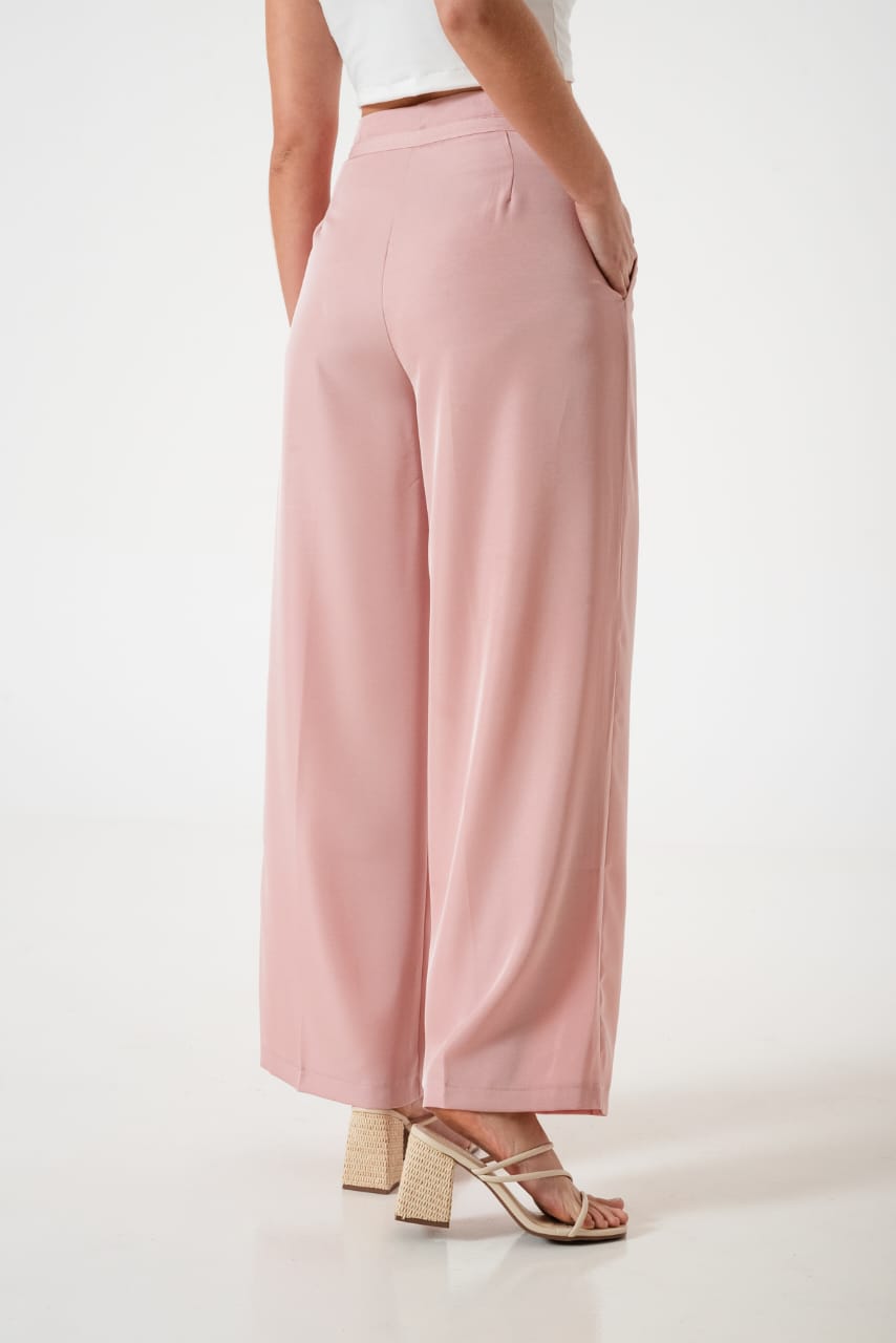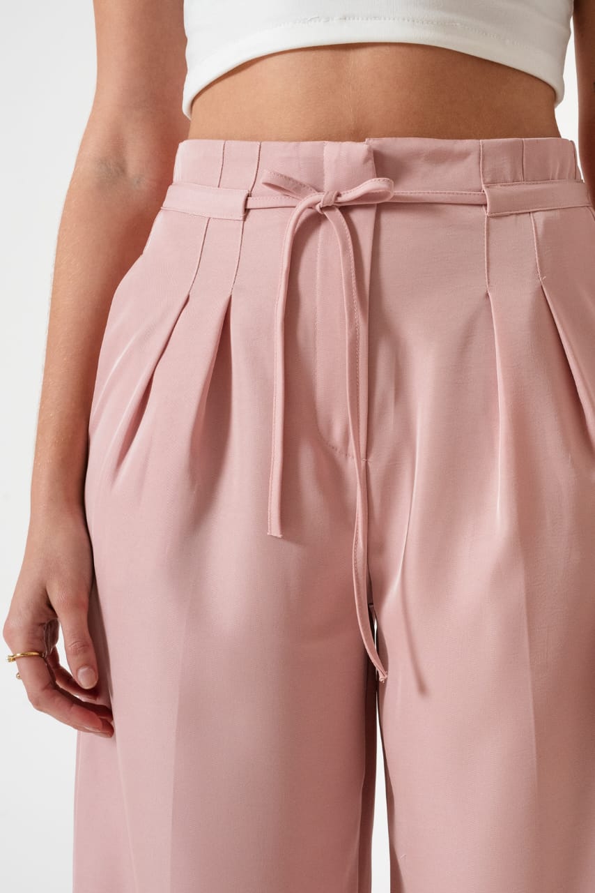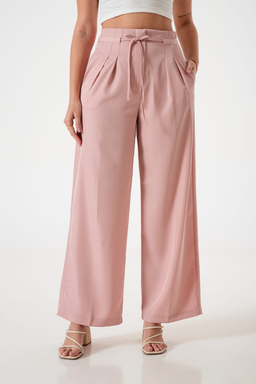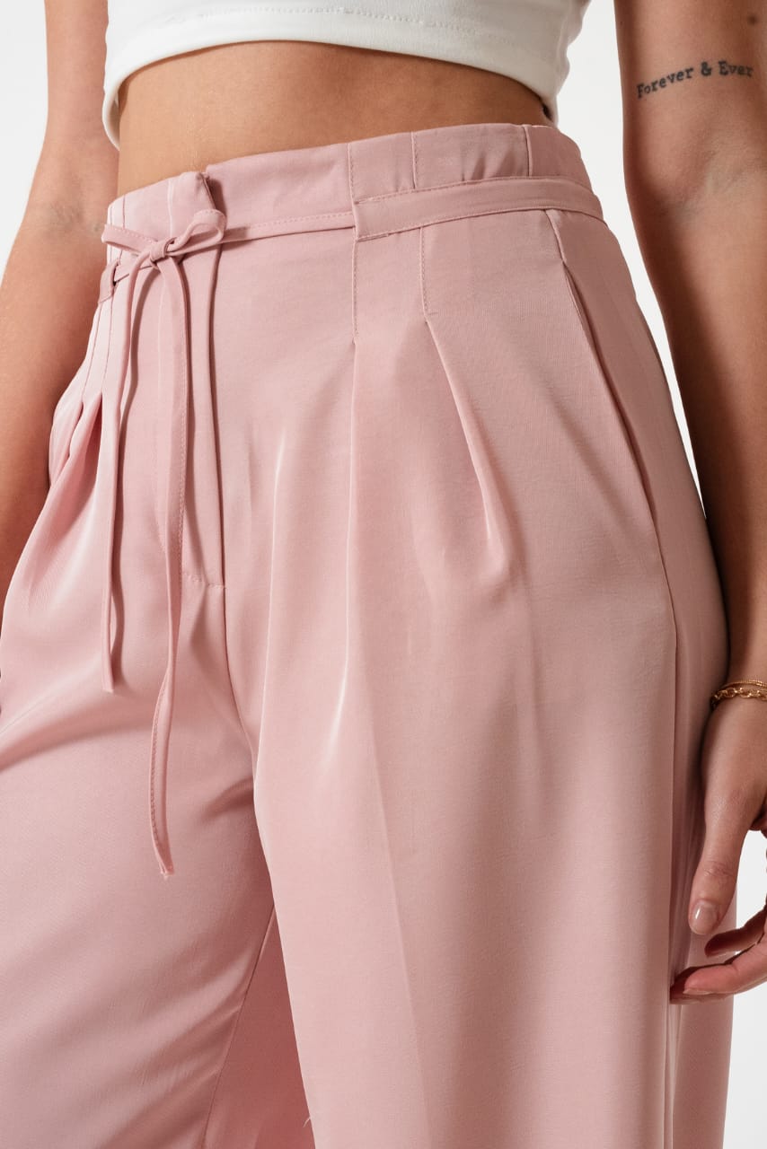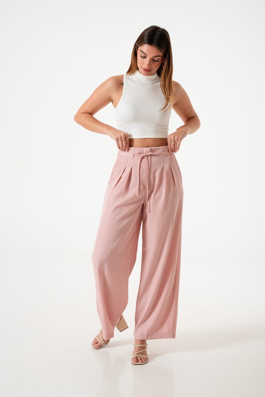 Pantalon estilo palazo confeccionado en tela de sastreria con detalle de tiras, pinzas delanteras y bolsillos