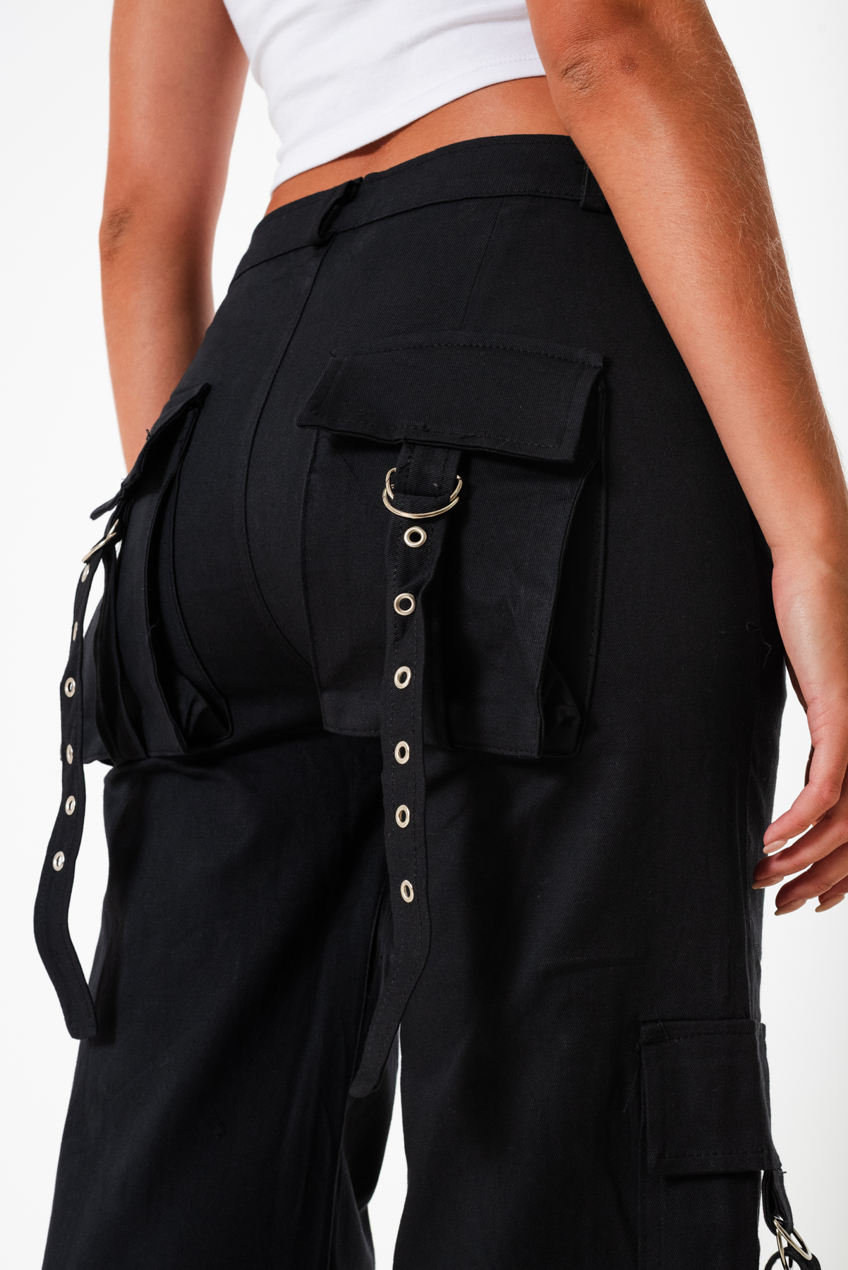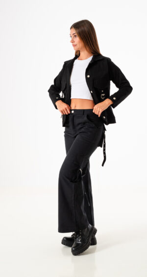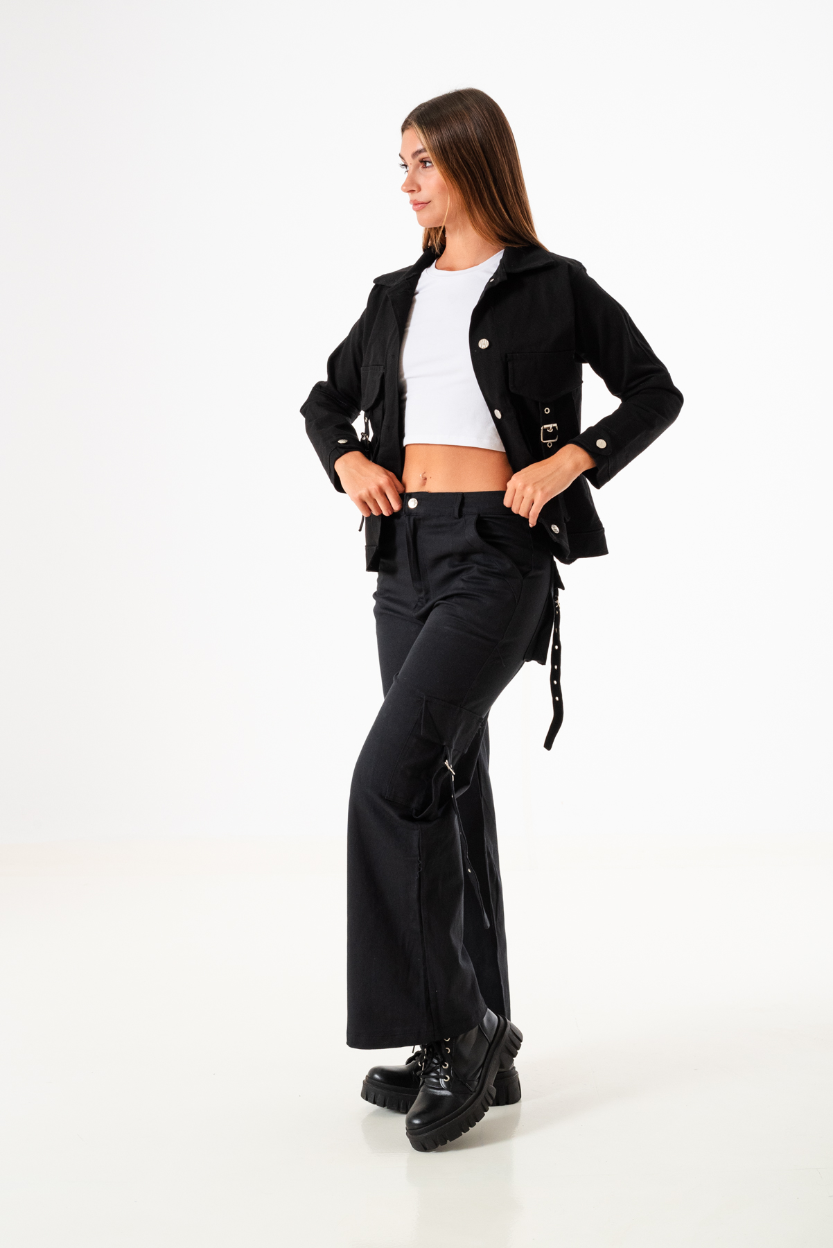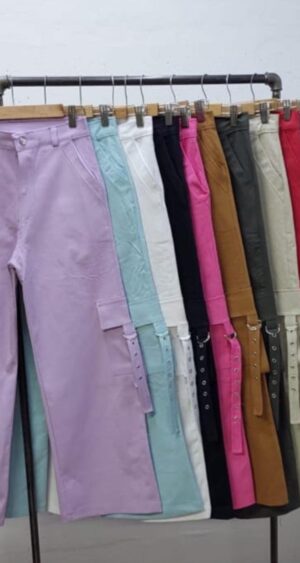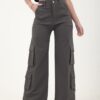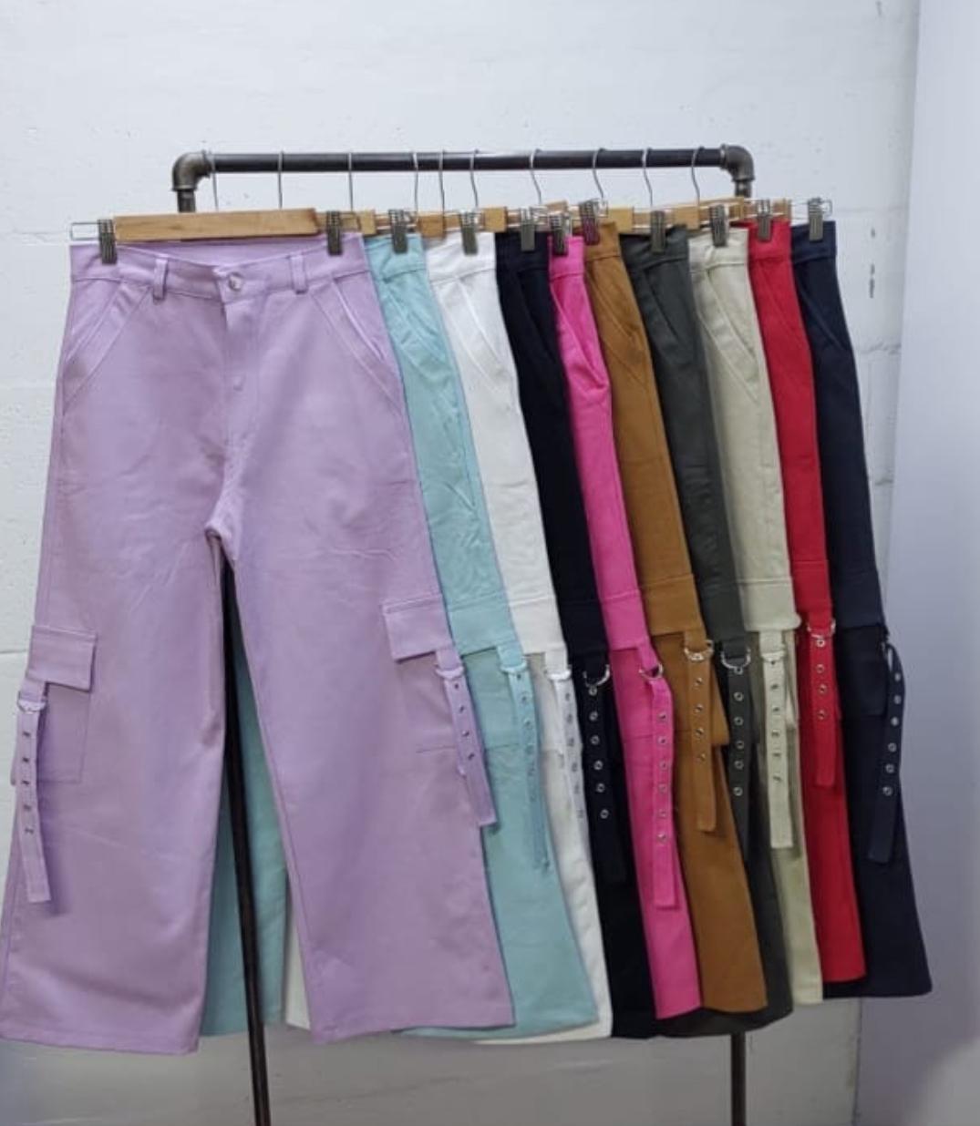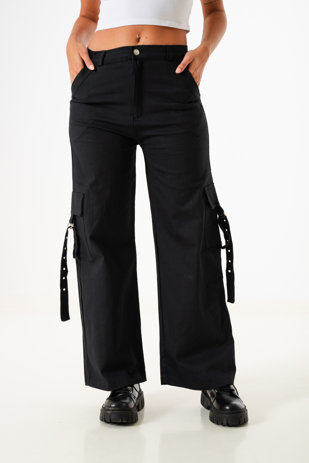 Pantalon estilo wid leg confeccionado en tela de gabardina con detalle de doble bolsillos cargo, pasacinto, cierre y boton