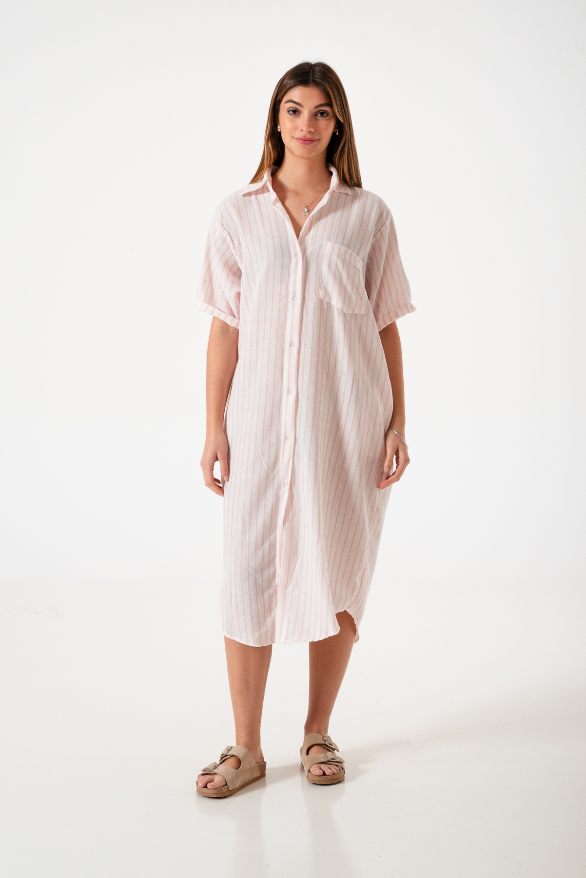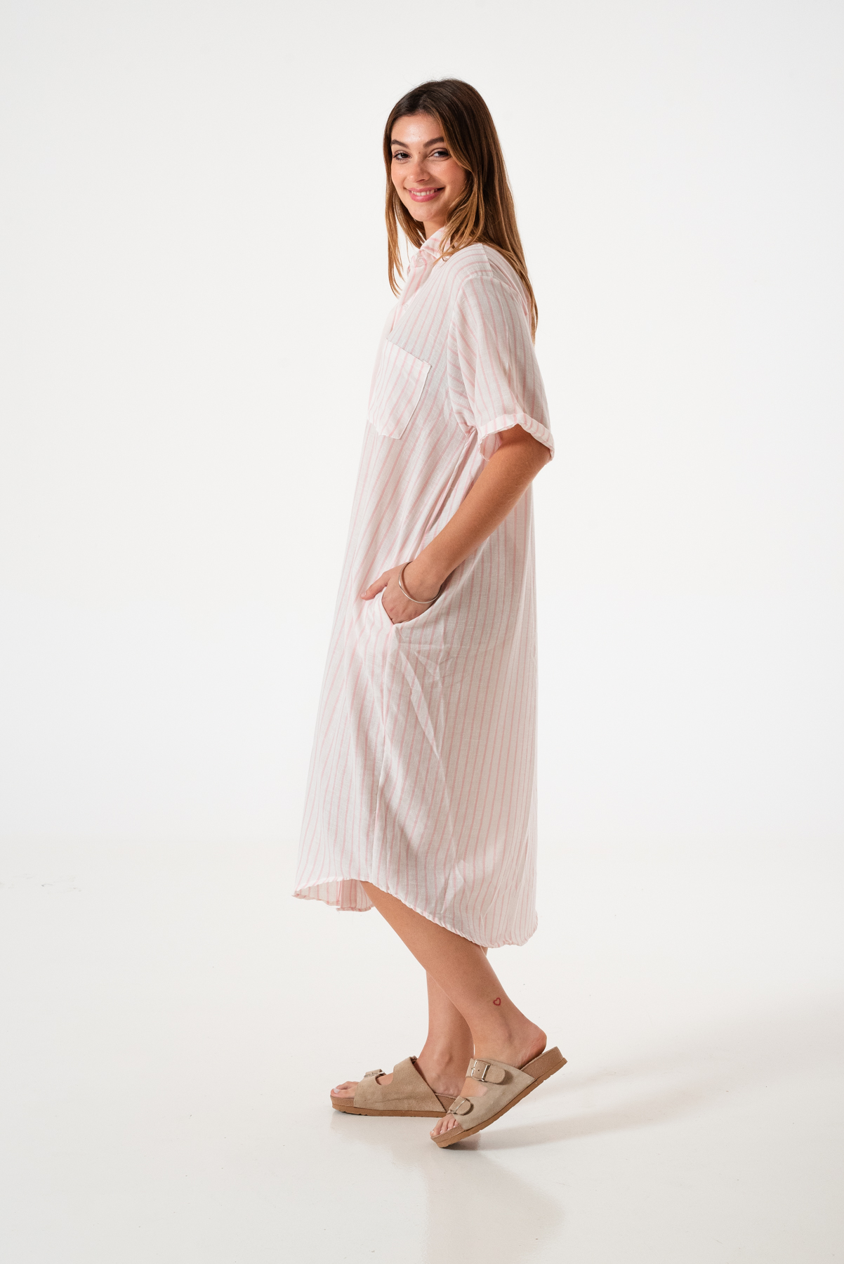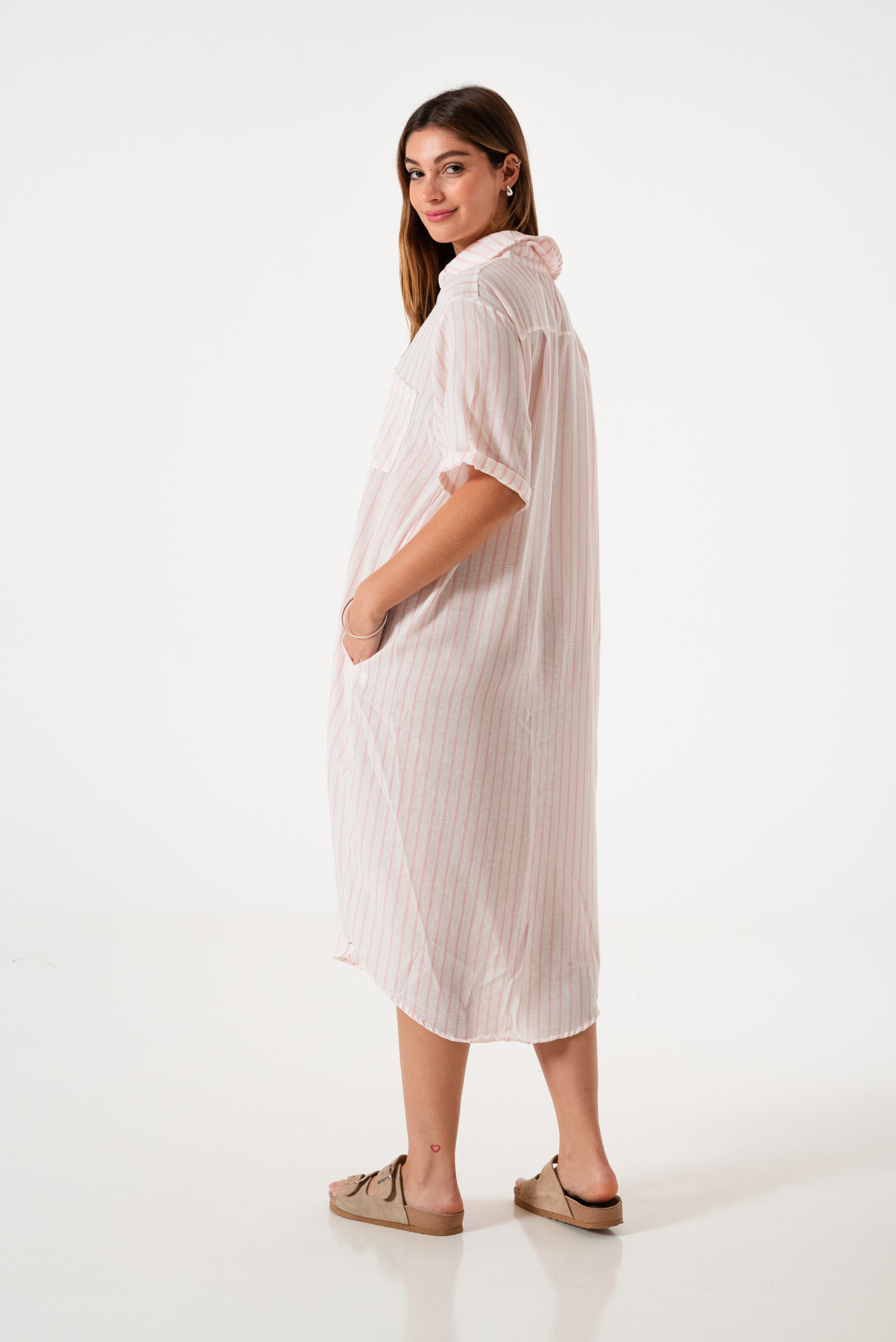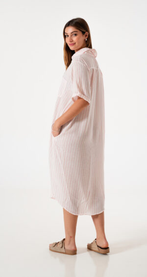 Vestido confeccionada en tela de lino rayado con detalle de bolsillo delantero.