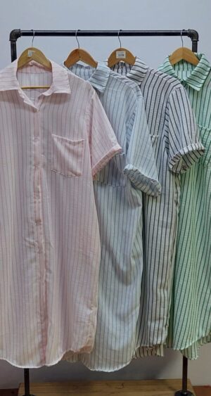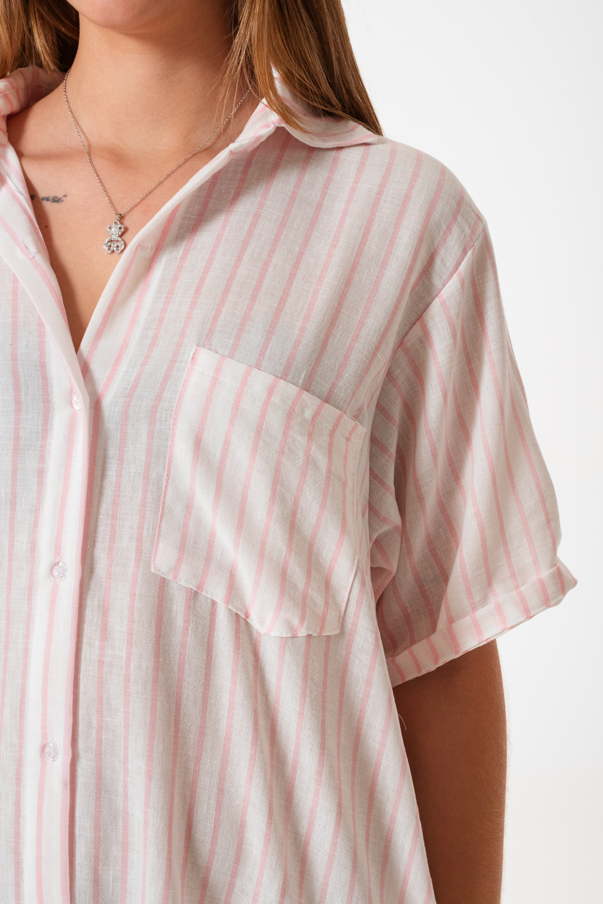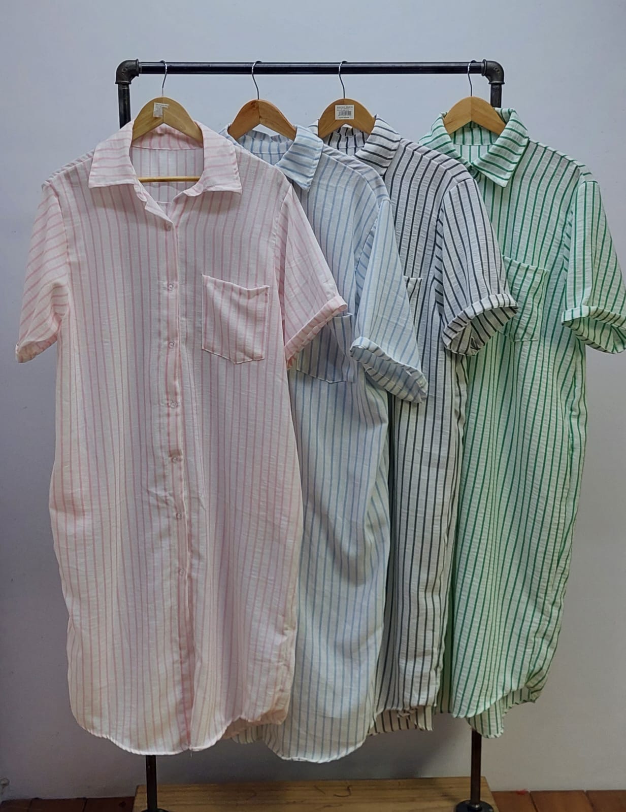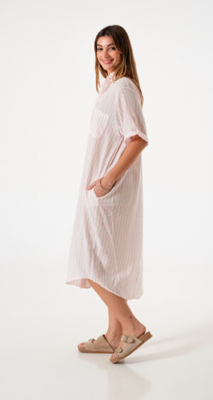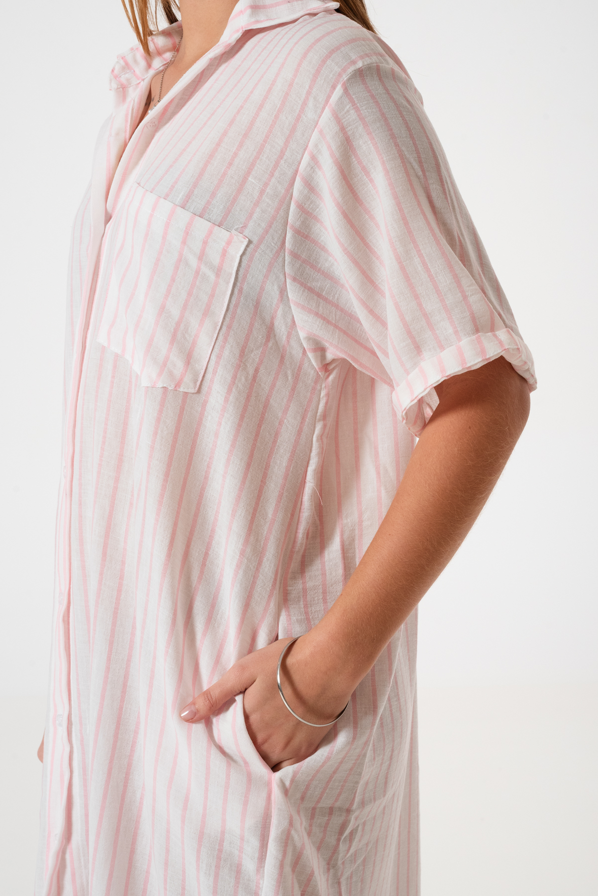 Vestido confeccionada en tela de lino rayado con detalle de bolsillo delantero.