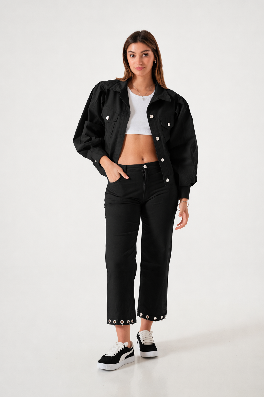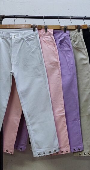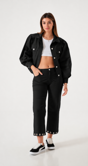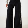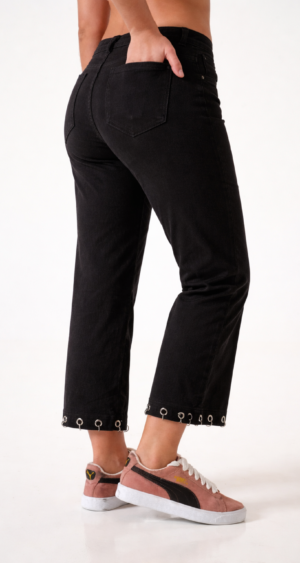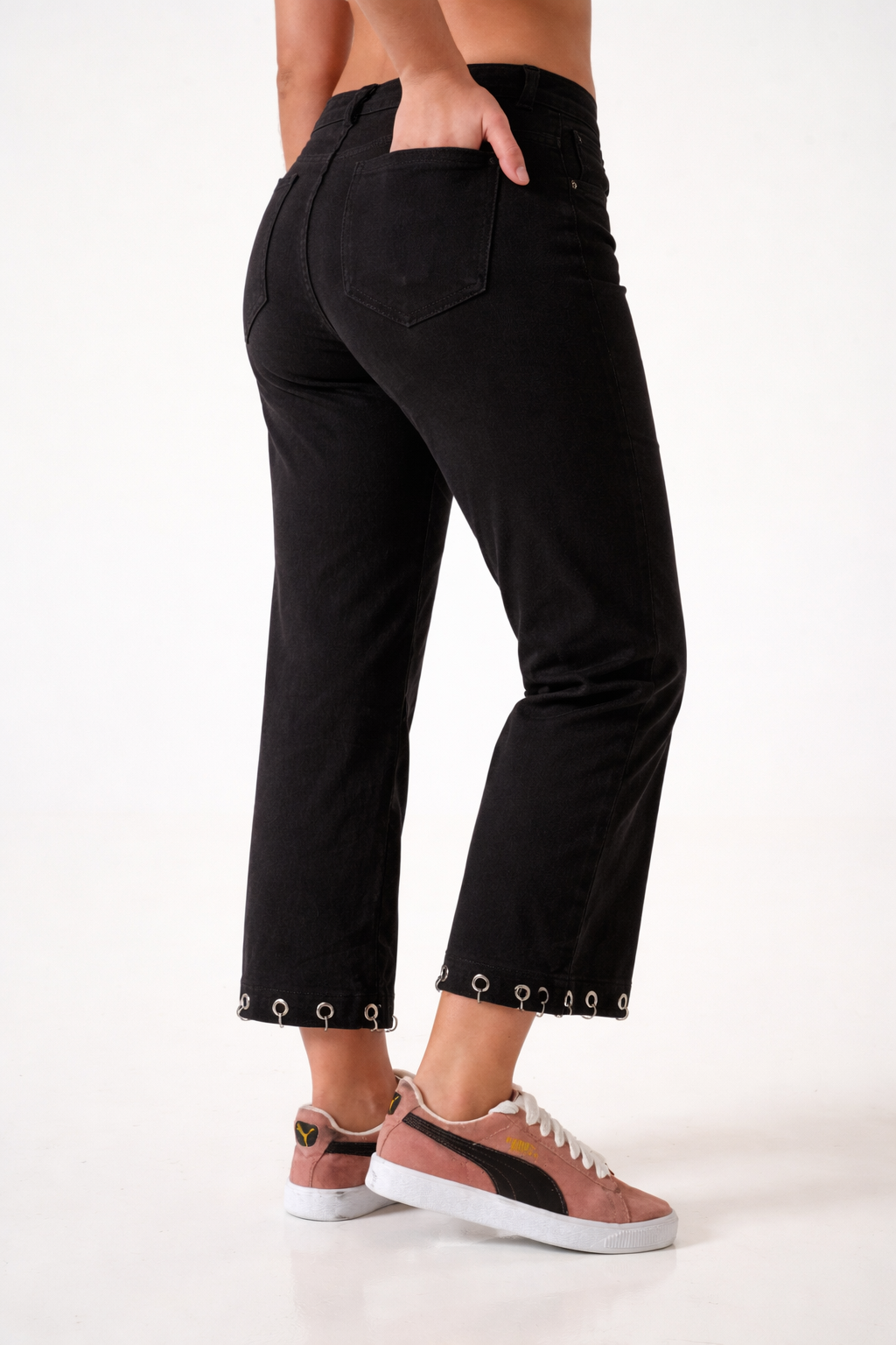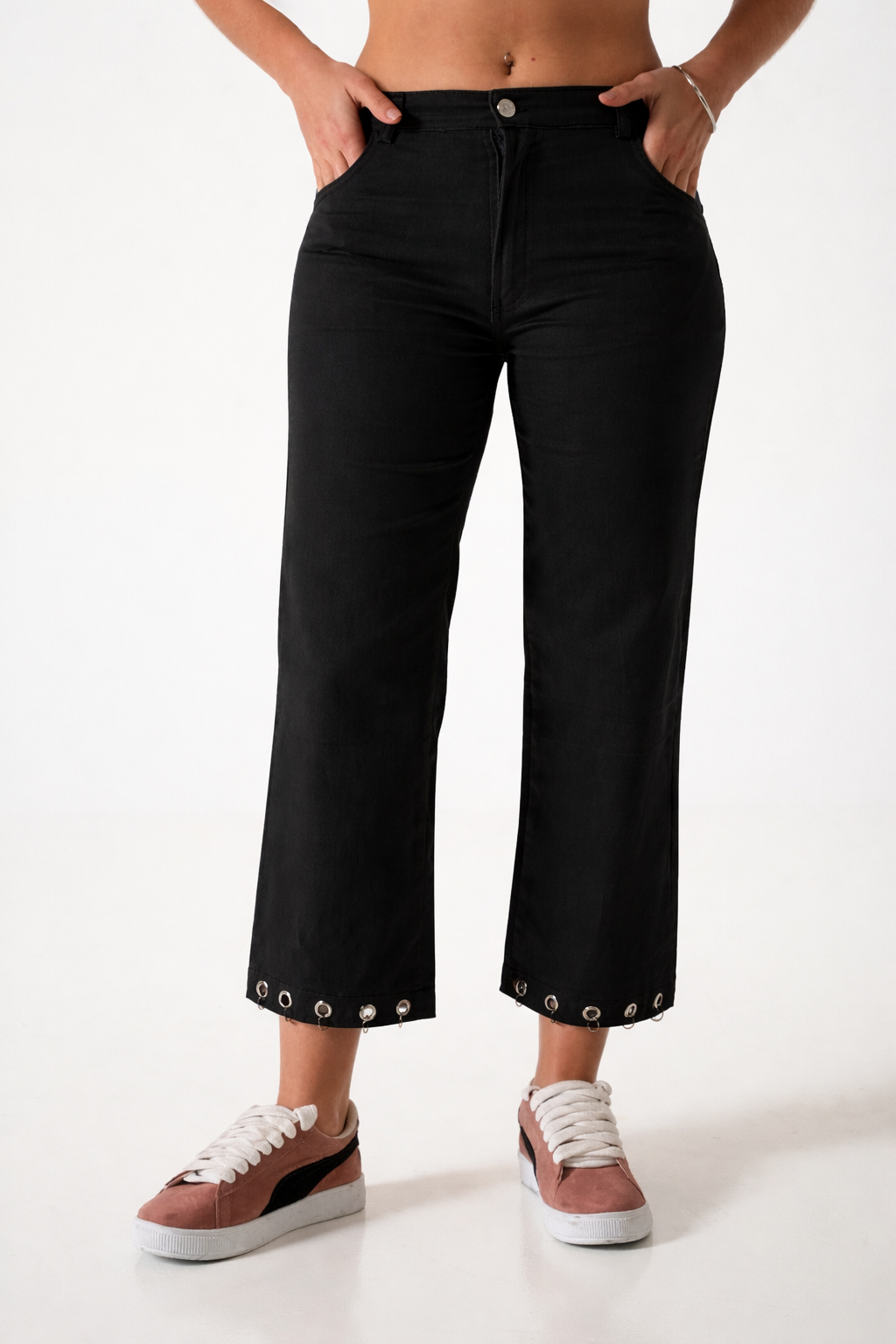 Pantalon estilo wid leg confeccionado en tela de gabardina con detalle de arandelas abajo, bolsillos, pasacinto, cierre y boton