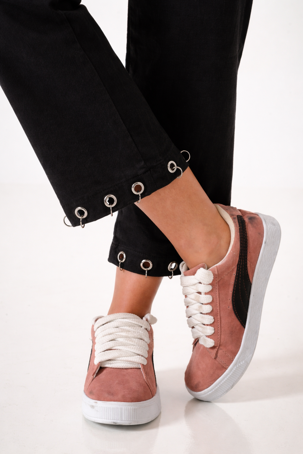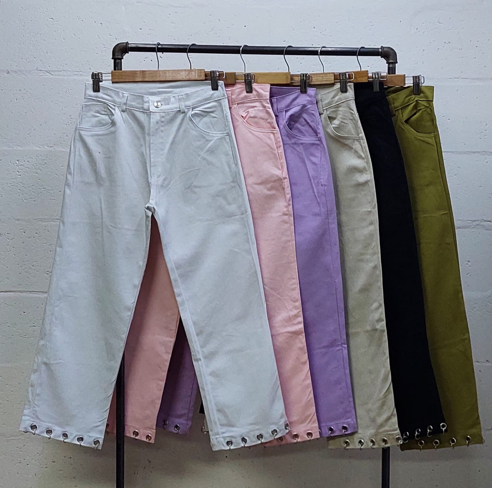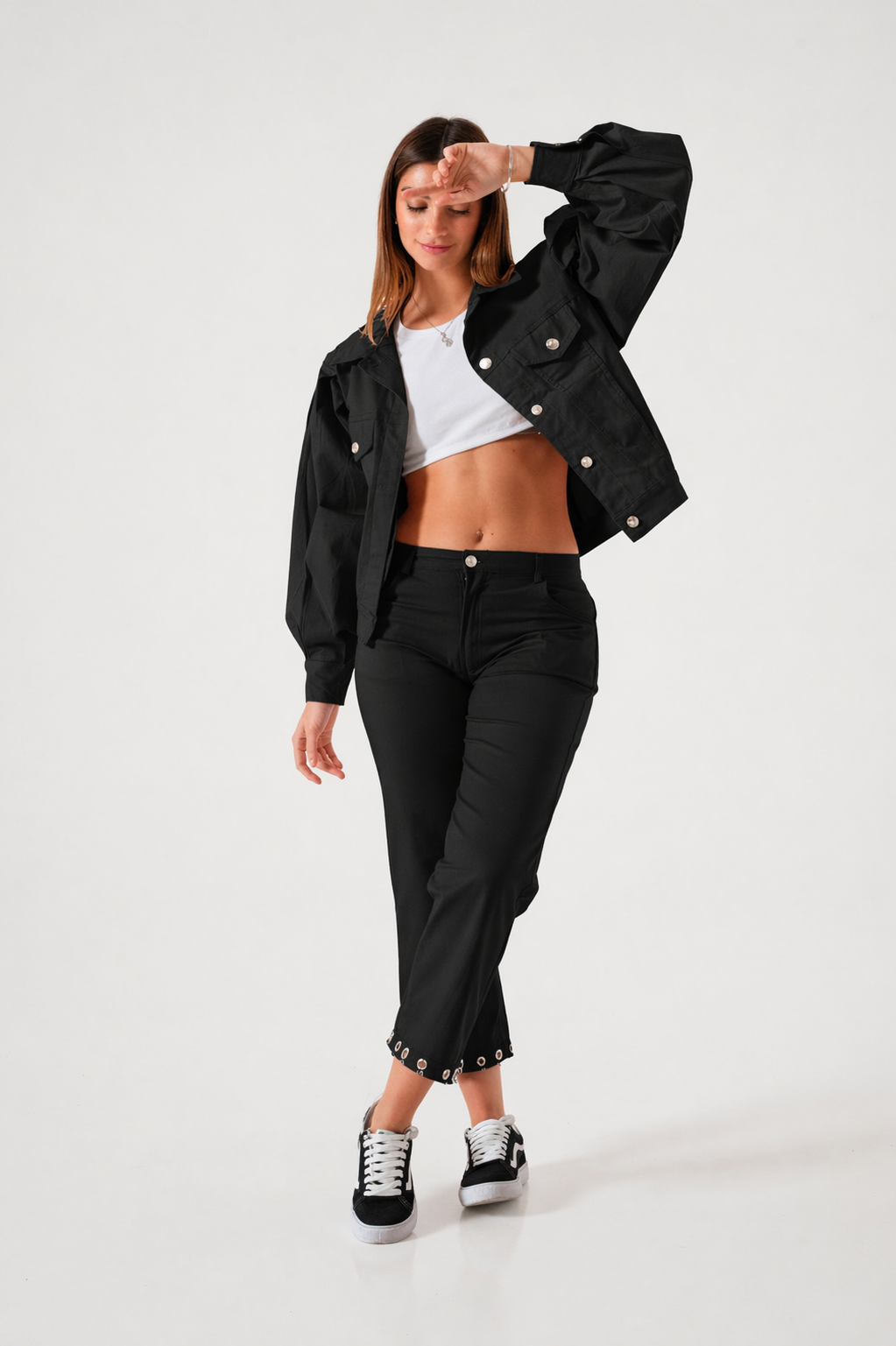 Pantalon estilo wid leg confeccionado en tela de gabardina con detalle de arandelas abajo, bolsillos, pasacinto, cierre y boton