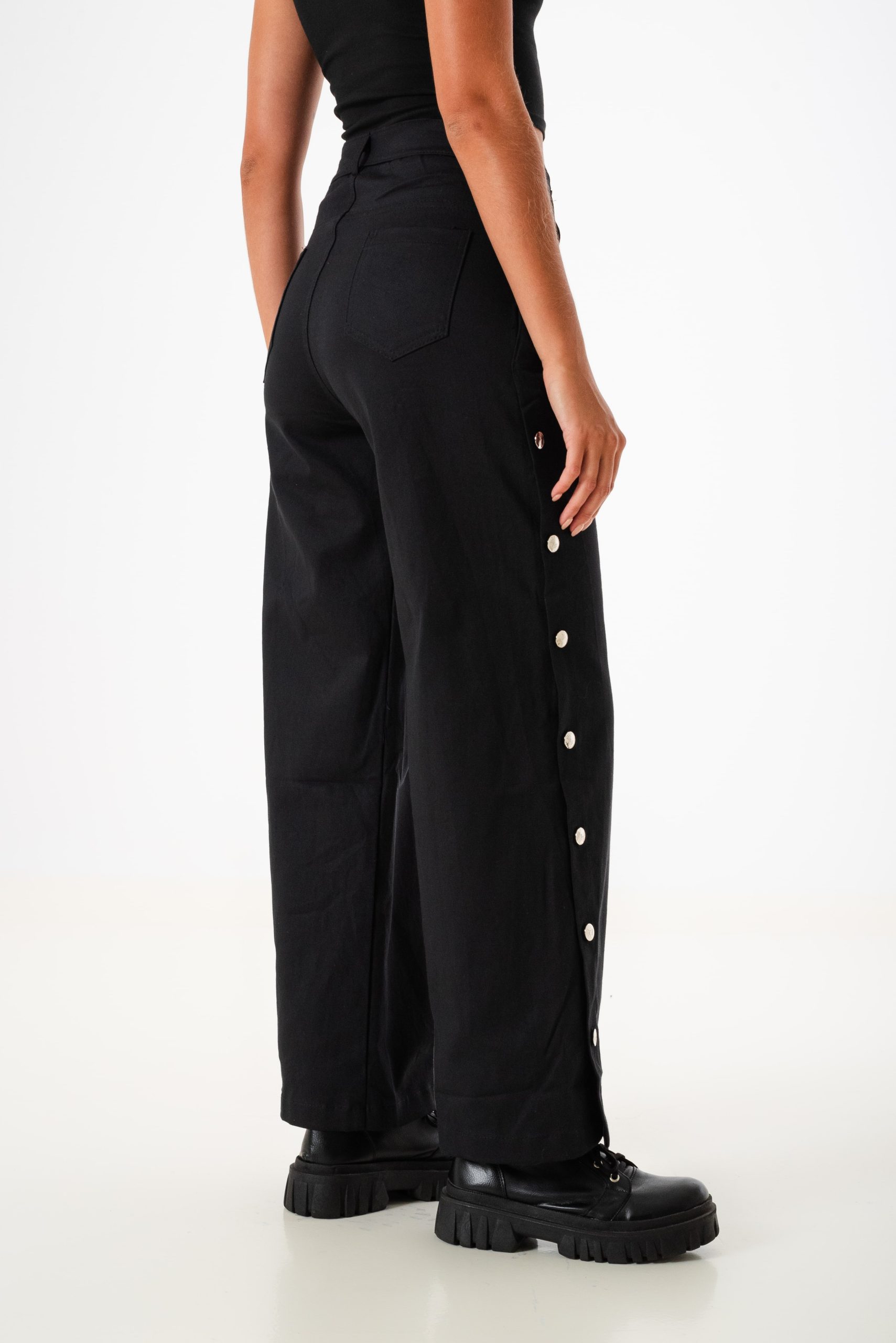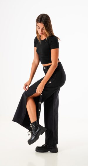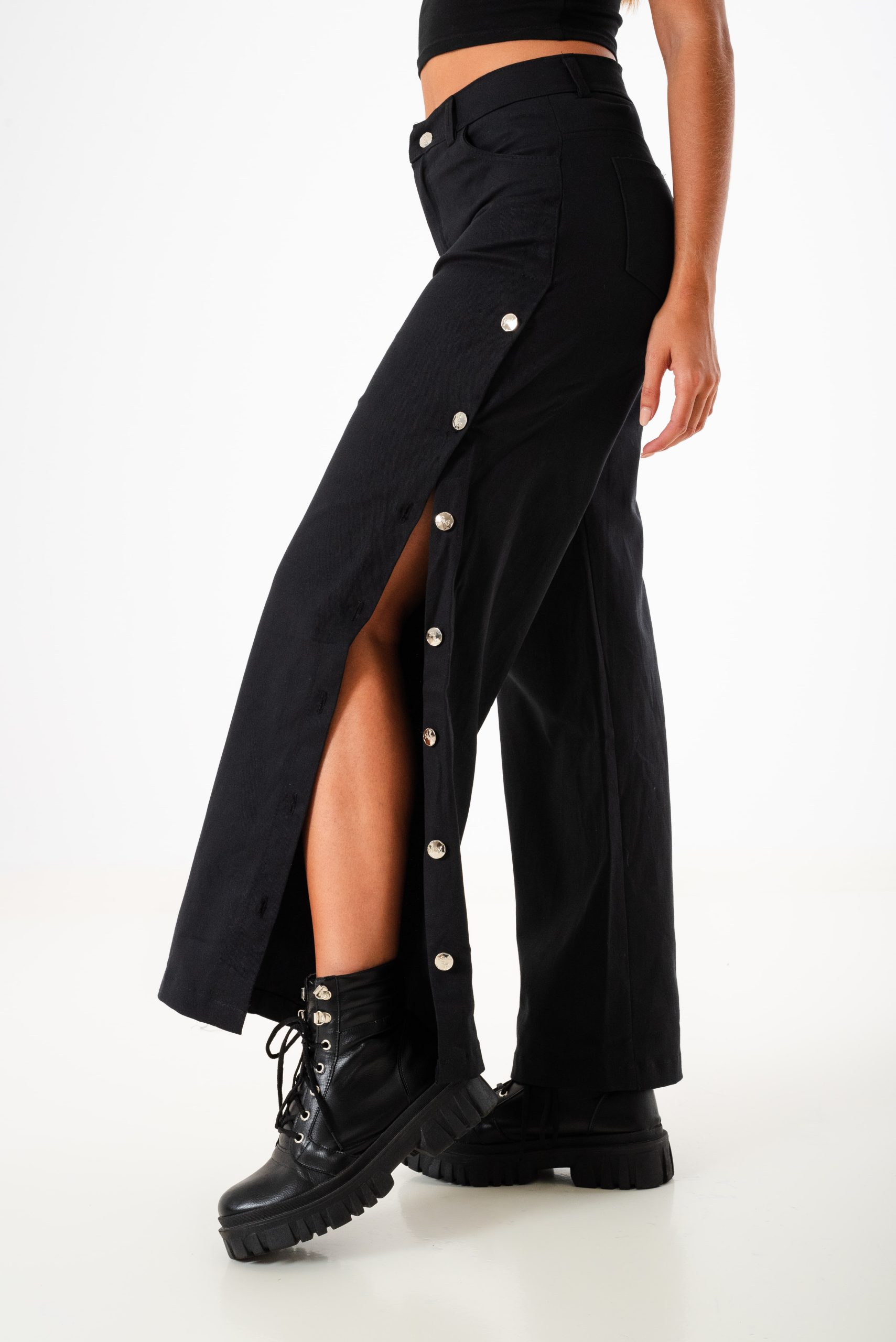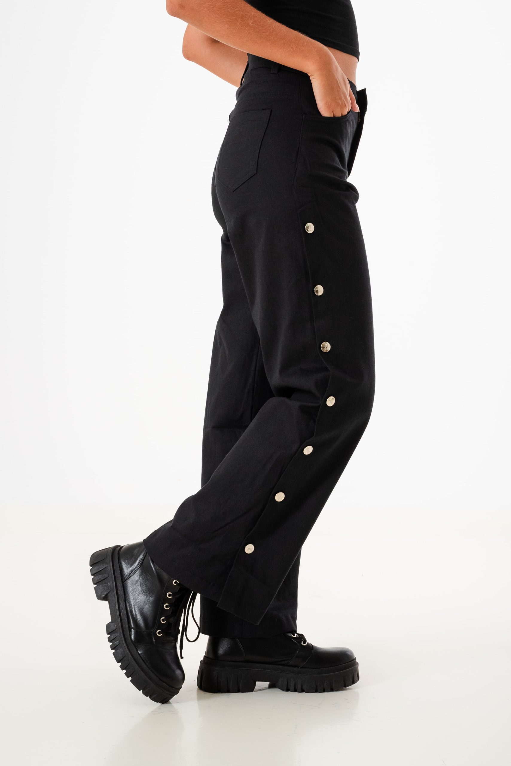 Pantalon estilo wid leg confeccionado en tela de gabardina con detalle de botones laterales, bolsillos, pasacinto, cierre y boton.