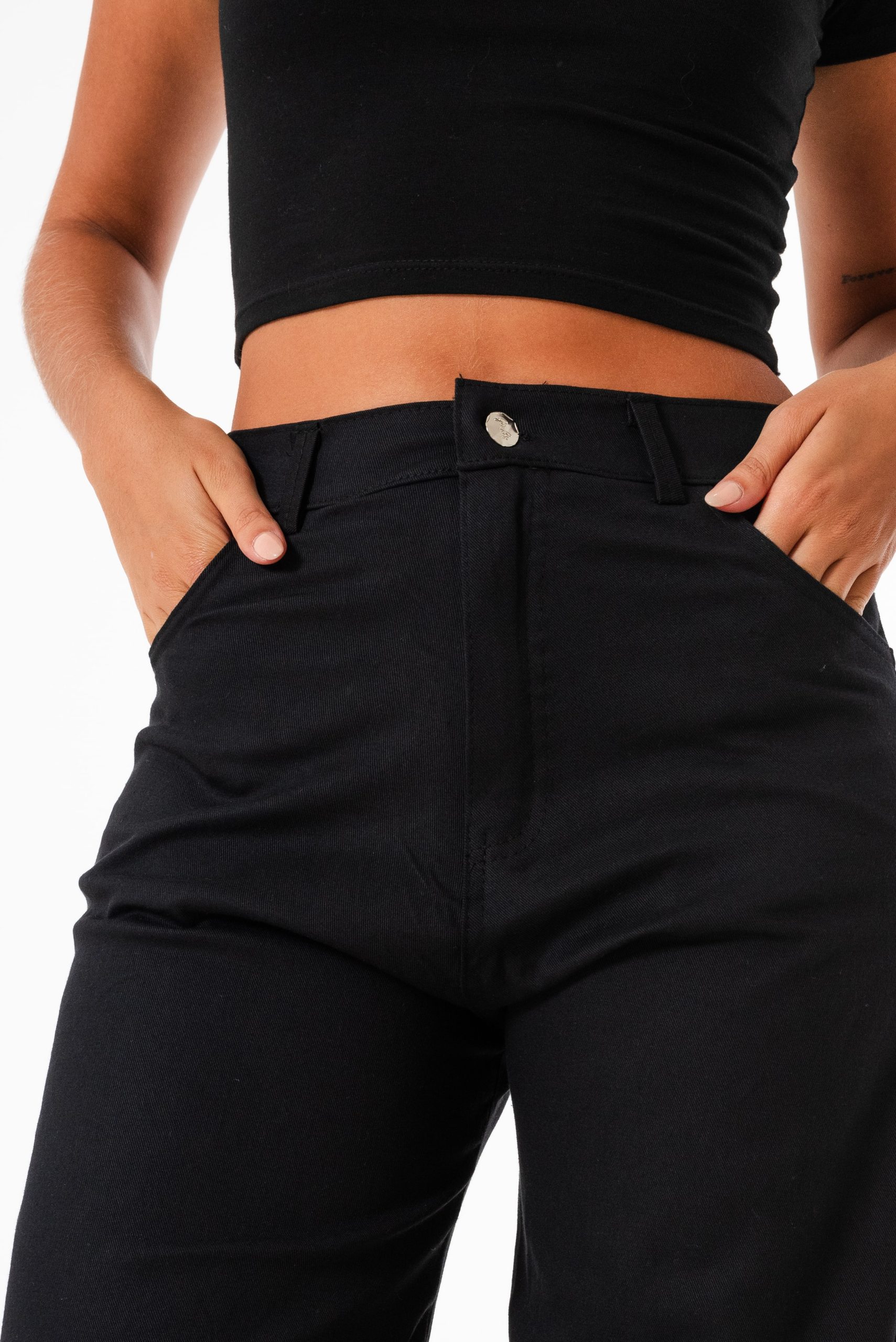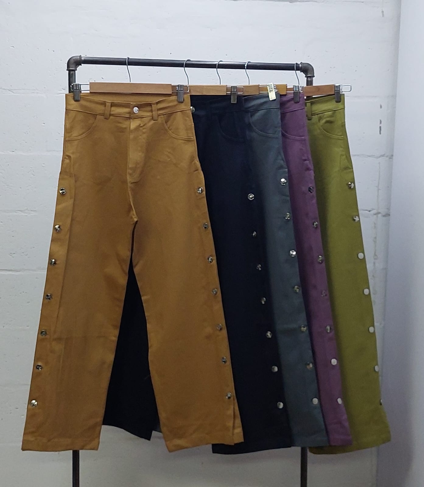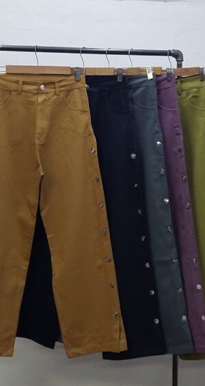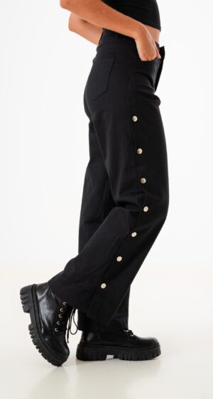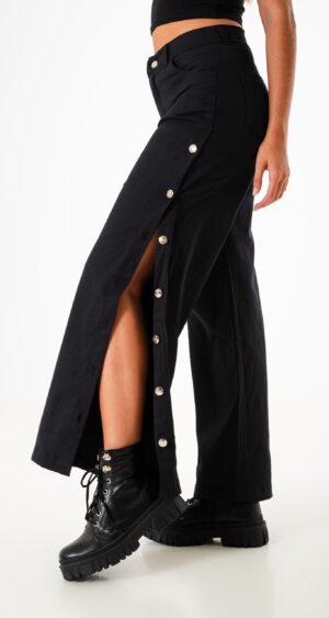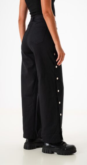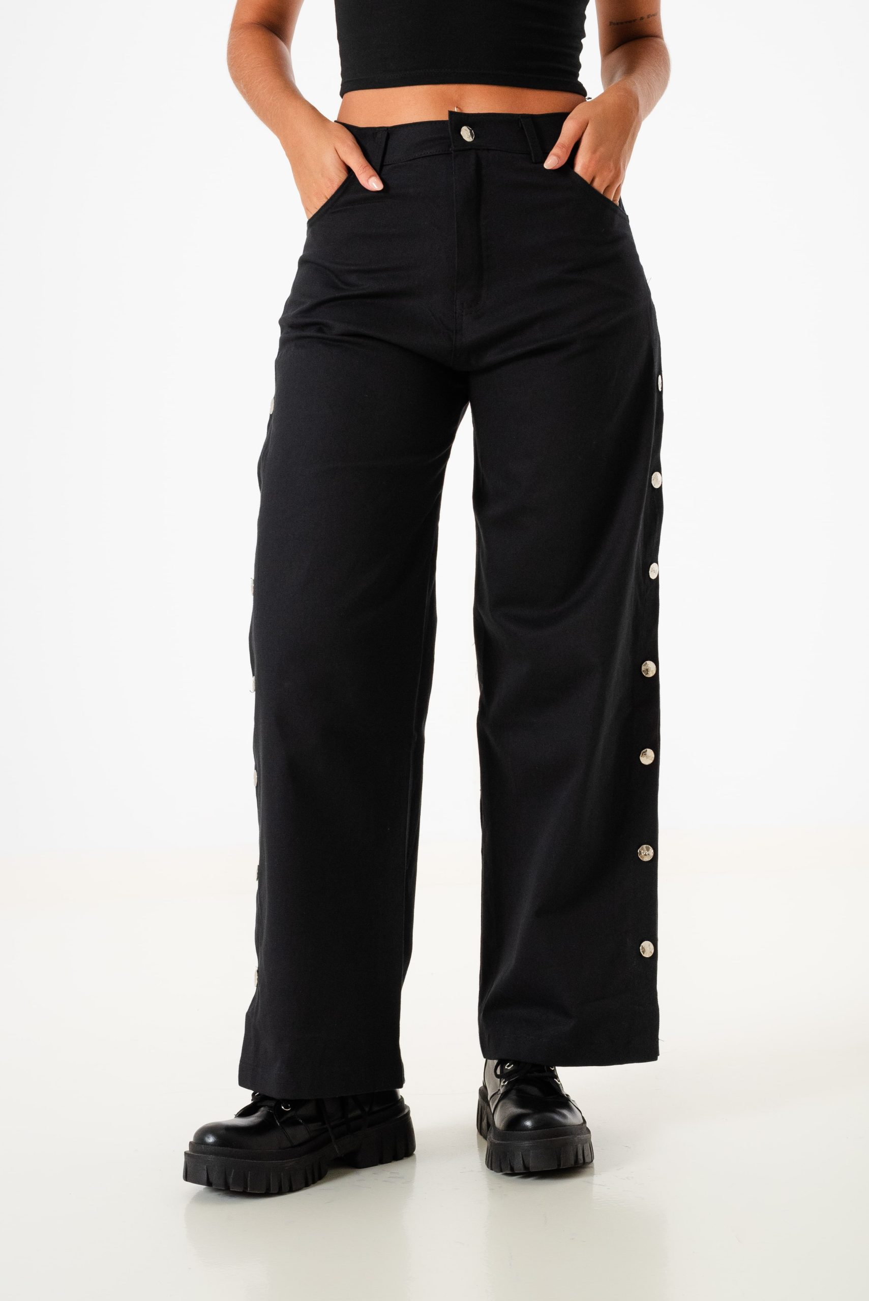 Pantalon estilo wid leg confeccionado en tela de gabardina con detalle de botones laterales, bolsillos, pasacinto, cierre y boton.