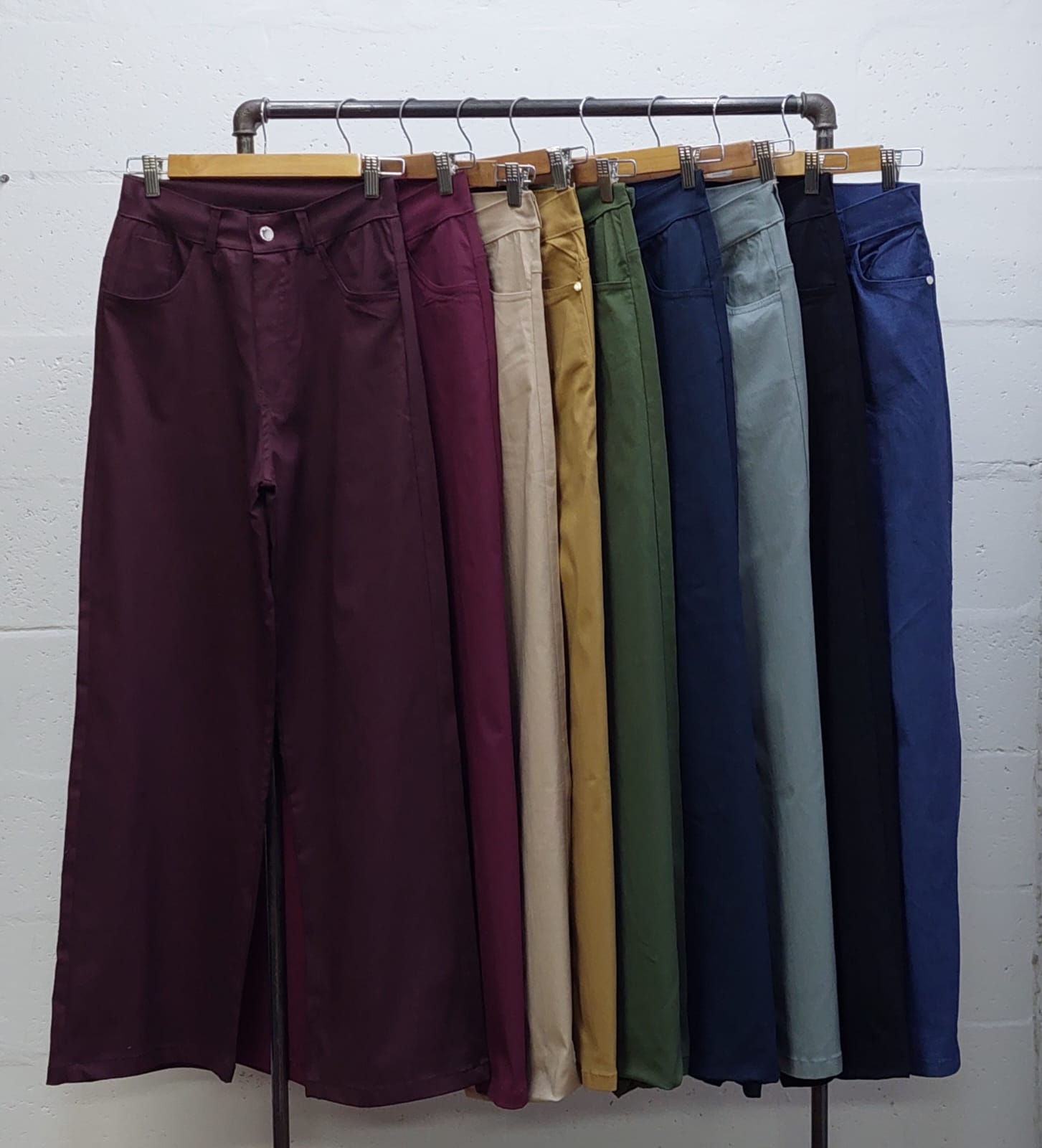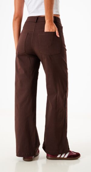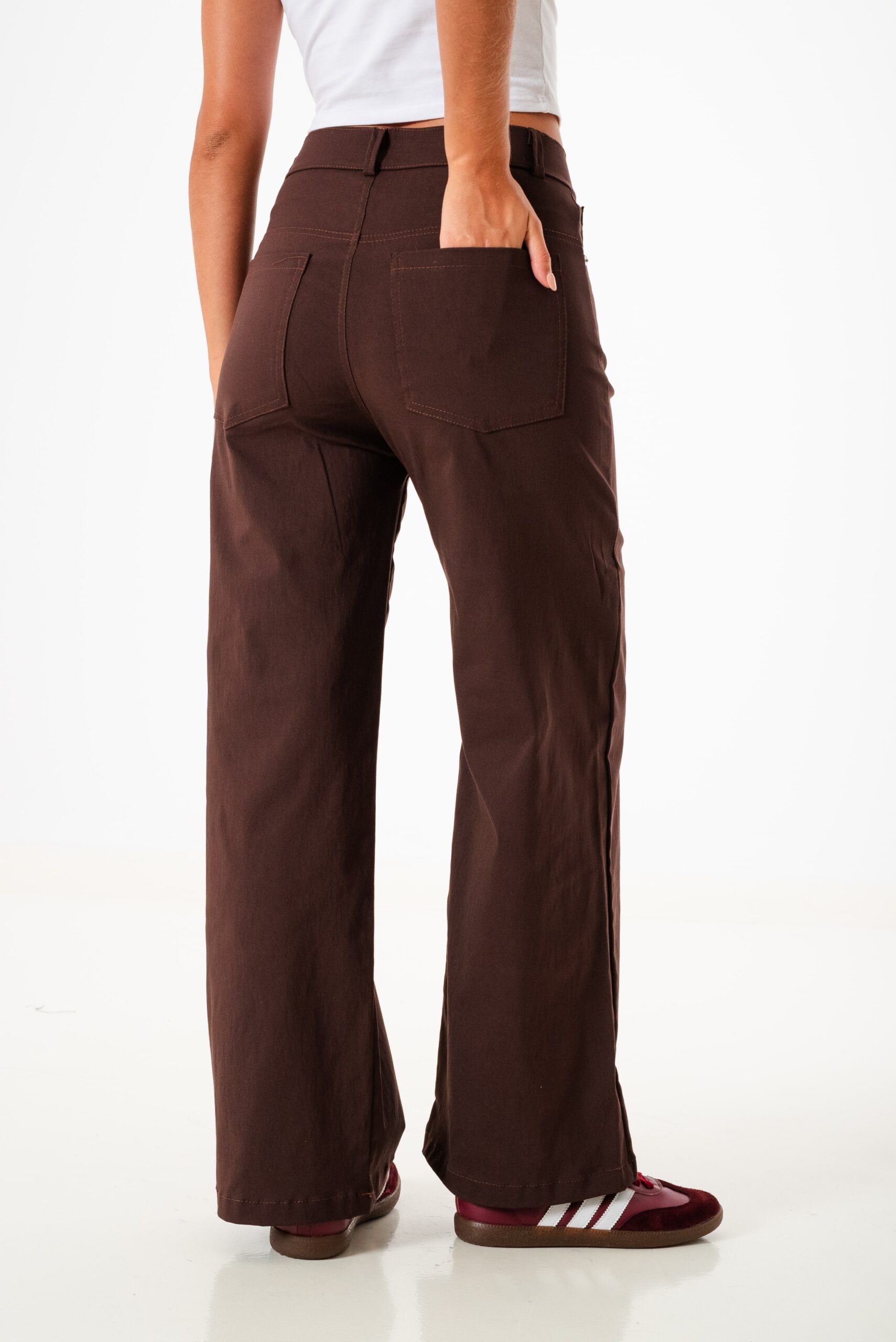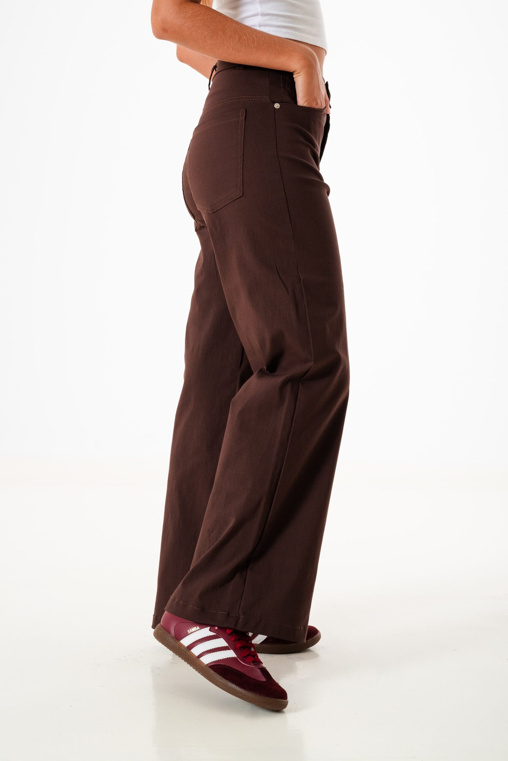 Pantalon estilo wid leg erika confeccionado en tela de bengalina con detalle de pasacinto, bolsillos, cierre y boton.
